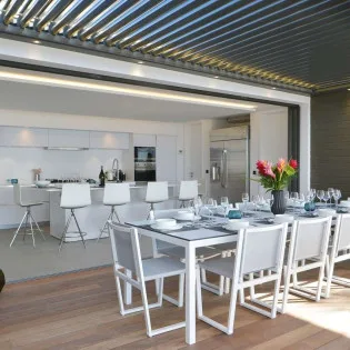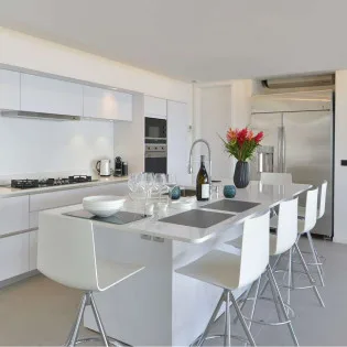 On the other side of the room is the large modern kitchen at Villa The Source, with everything you need to whip up meals in no time. And for special occasions, our concierge is more than happy to arrange a visit from a private chef.