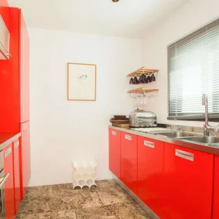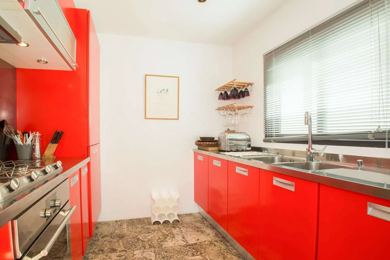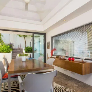 The second bungalow is next to the pool and contains both the kitchen and a large dining area. Bright red cabinetry in the kitchen is eye-catching, capturing a creative vibe that encourages you to experiment with the local ingredients. For a night off, our concierge could even organize a private chef to pay a visit to the villa.