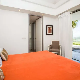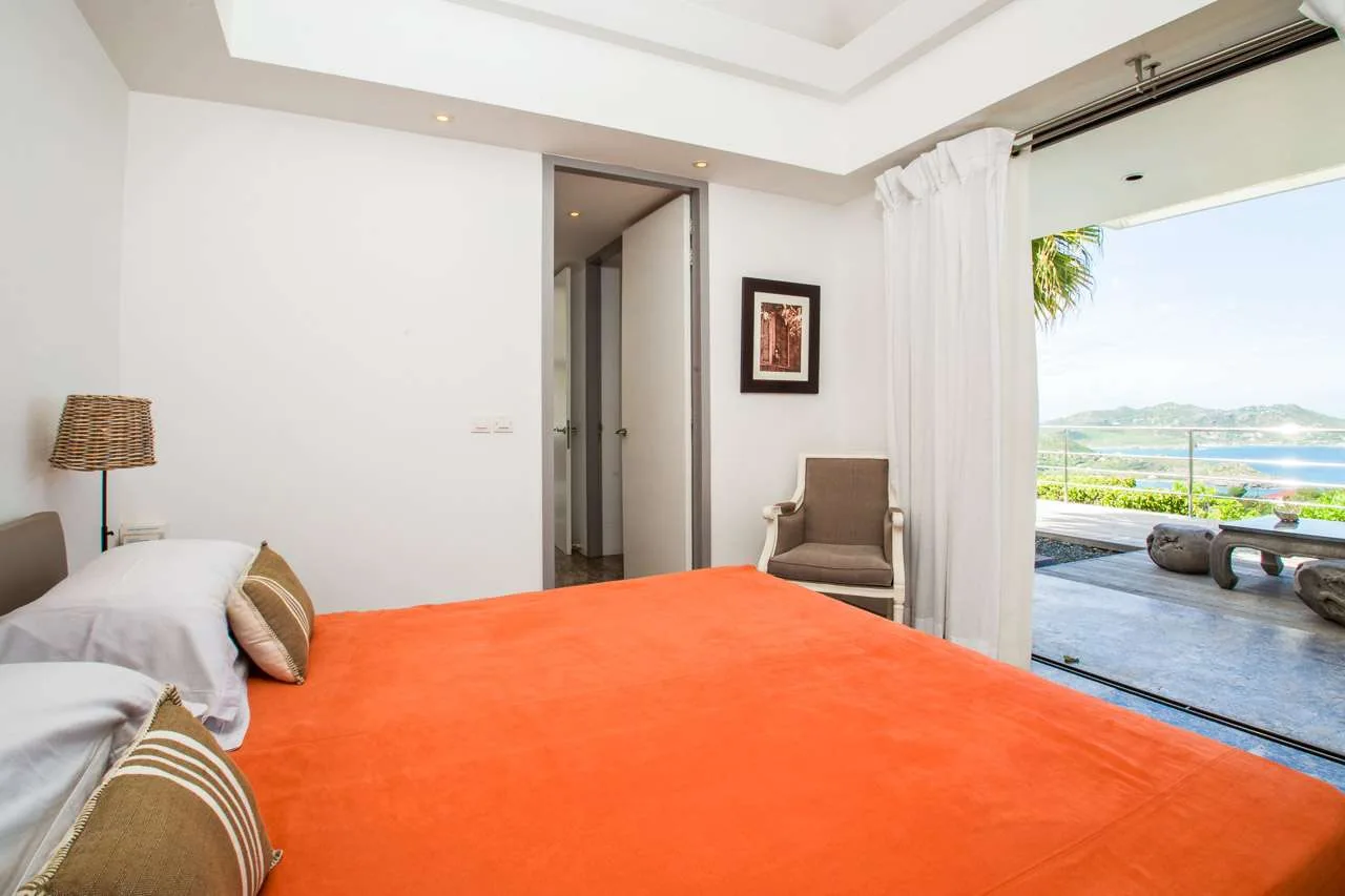 There’s a plush Euro king-sized bed, a dressing area, and a spacious ensuite bathroom with a shower. Sliding doors open to the outdoor terrace, letting you start and end each day with those arresting views over the St. Barts landscape.