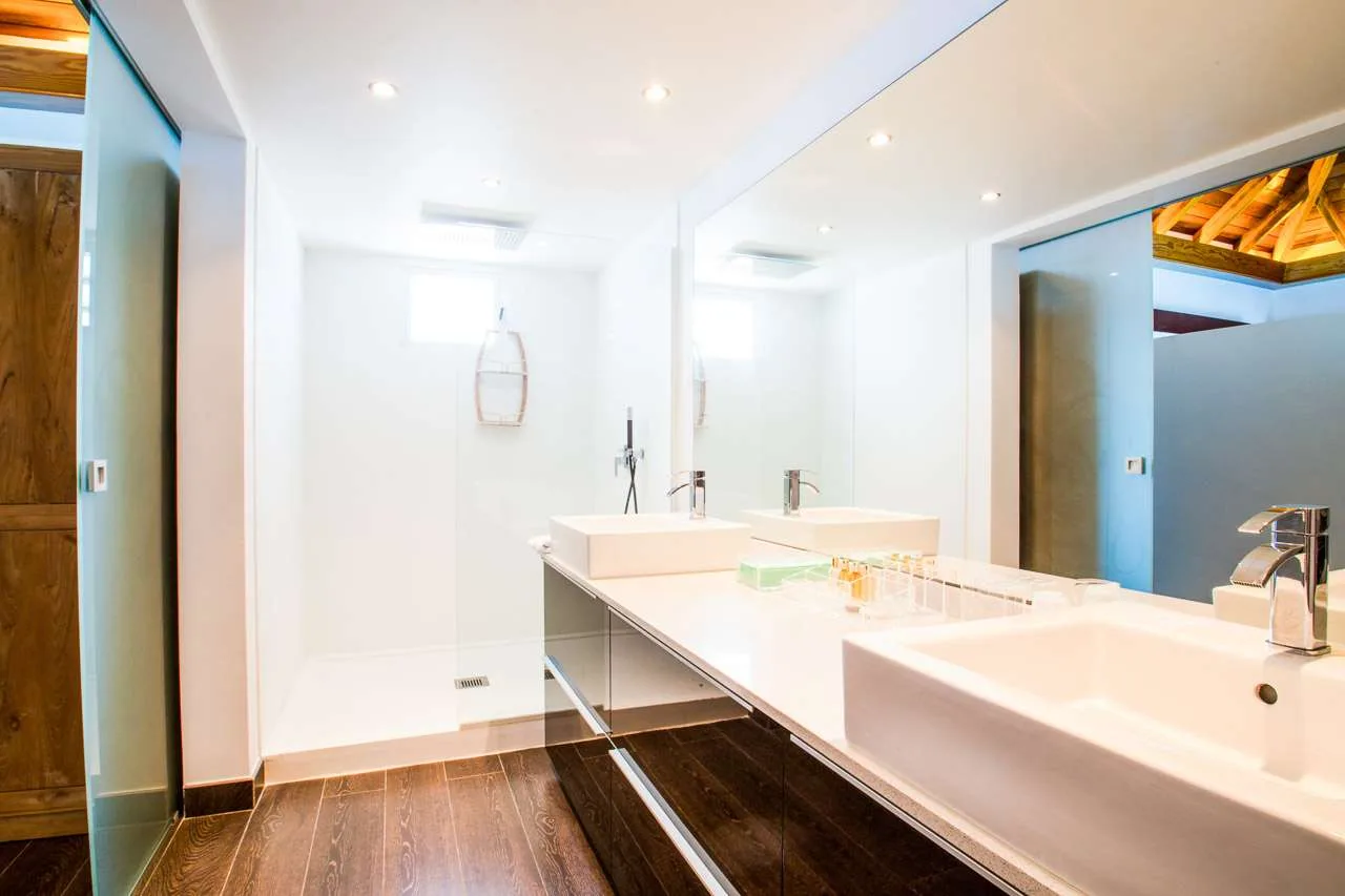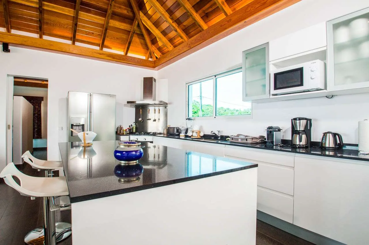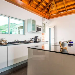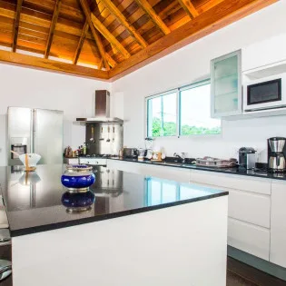 At the back of the great room is Villa Ti Chato’s modern kitchen. With several areas for preparation and an island with seating, your whole group can get involved with whipping up a gourmet meal. Our concierge can even organize grocery pre-stocking or delivery, catered meals, or arrange private chef service for a special occasion.