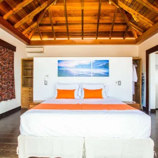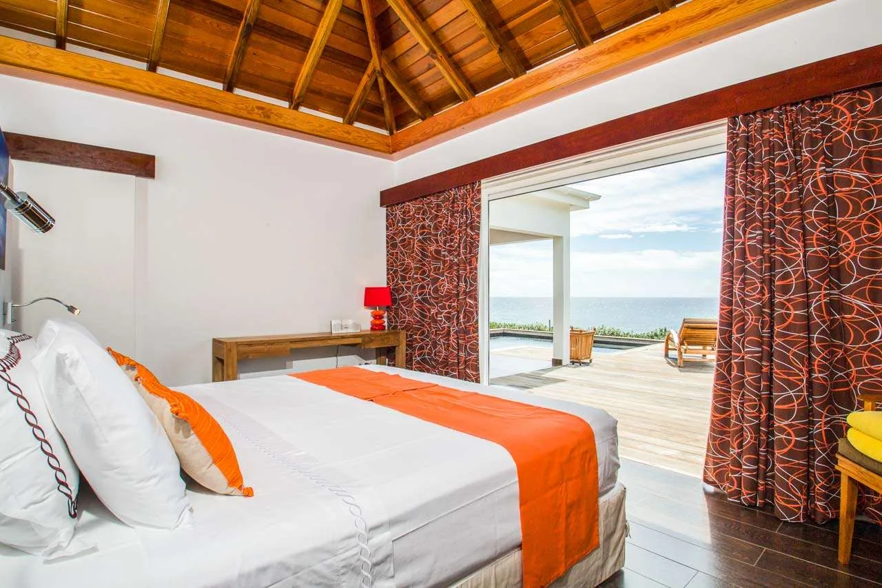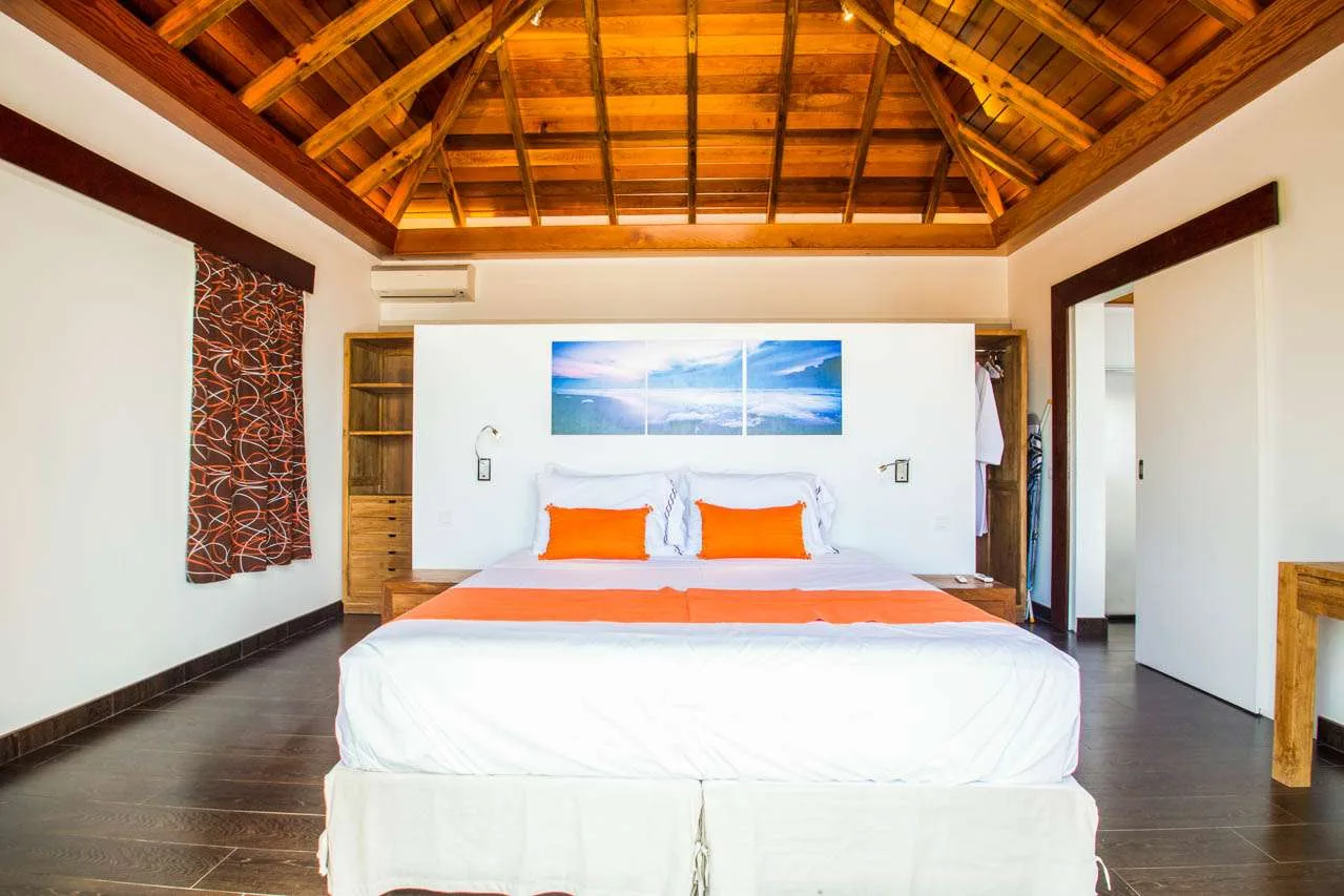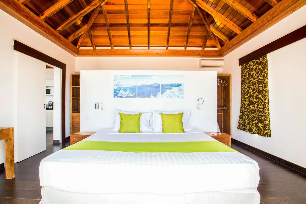 The bedrooms at Villa Ti Chato are on either side of the living room. Equal in size, colorful accents and prints above the beds bring splashes of life into the calm