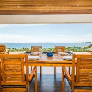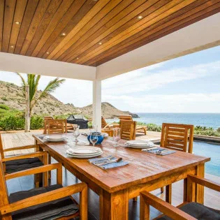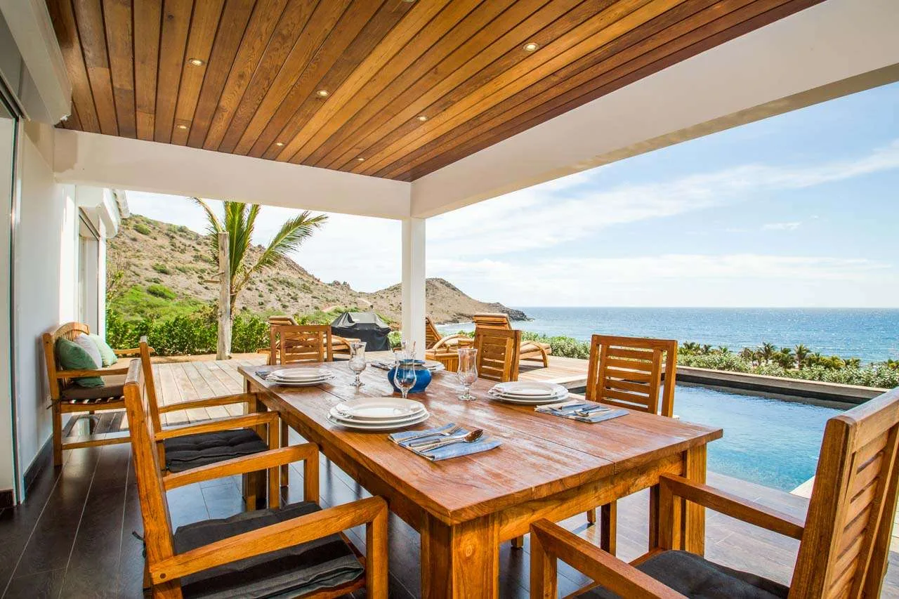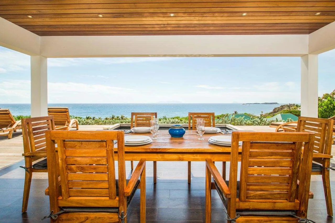 Stepping outside onto the covered terrace reveals the villa’s dining table, with seating for 6 guests. Overlooking the stunning Caribbean, there’s nowhere better for an island-style dinner party.