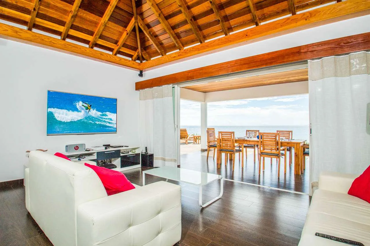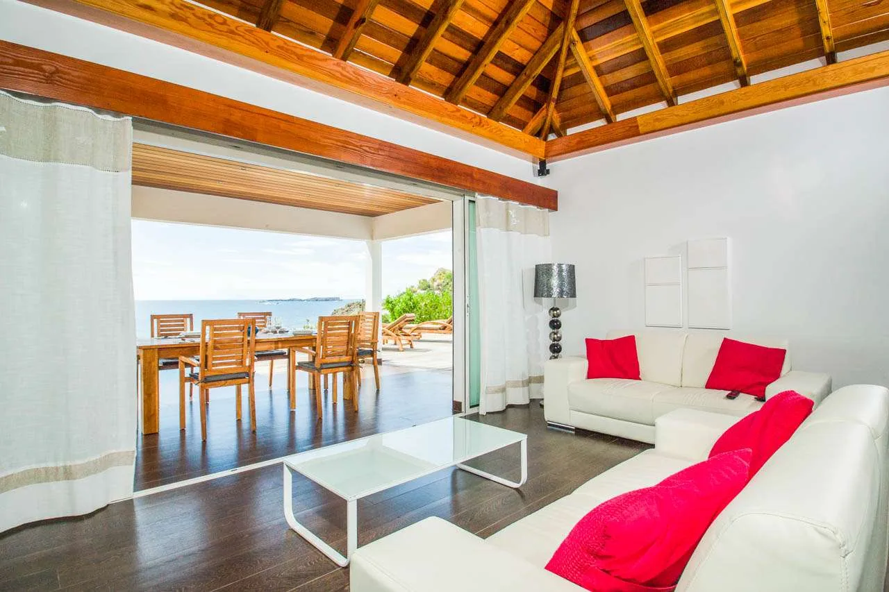 The central space at Villa Ti Chato is an open-plan great room, with the living room and kitchen. This room opens onto the terrace, letting in an abundance of natural light and sea breezes.