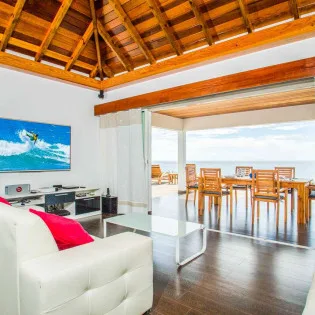 Soft sofas invite you to sink in, unwind, and disconnect from the rush of modern life. You’ll immediately want to grab a book, gaze out at the ocean views, or kick back with a cool tropical drink. Otherwise, the entertainment center has a flat-screen TV ideal for movie nights.
