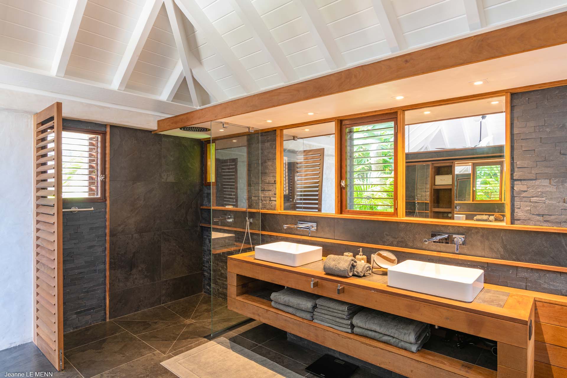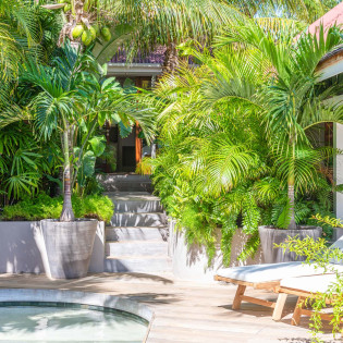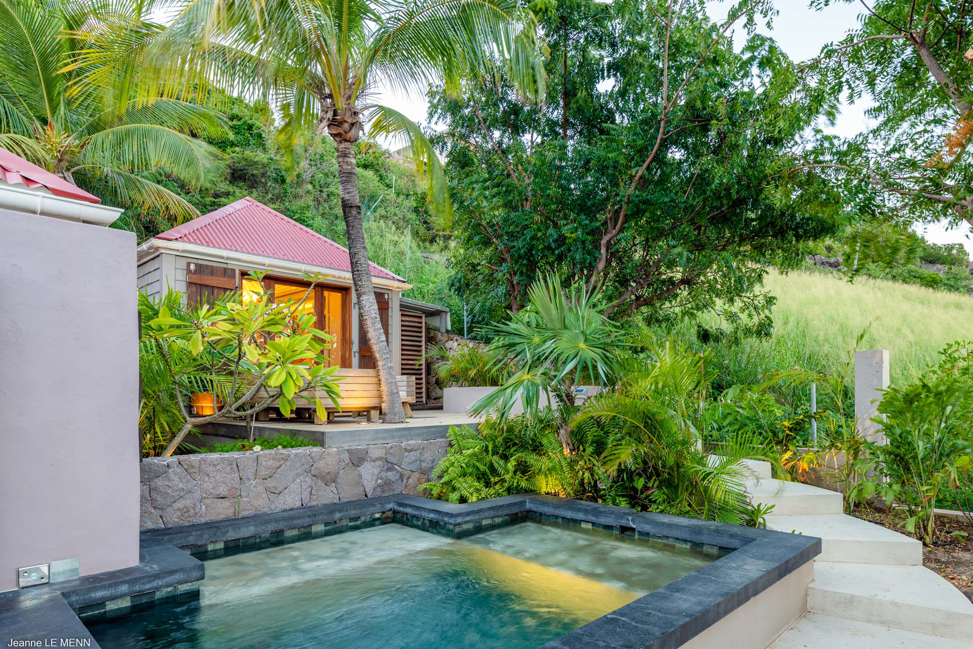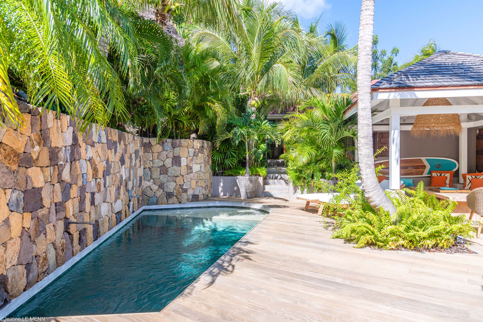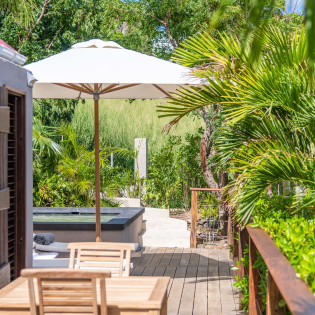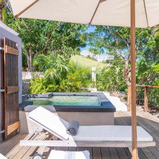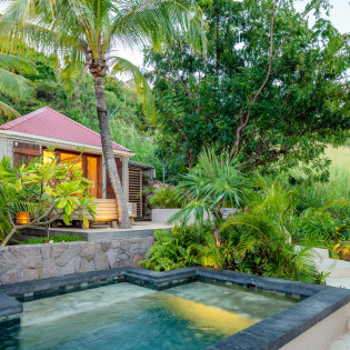 After swimming in the turquoise waters of the sea, you have the choice to dive into the pool surrounded by tropical vegetation or to indulge in the hot tub while admiring the view of the lagoon.
