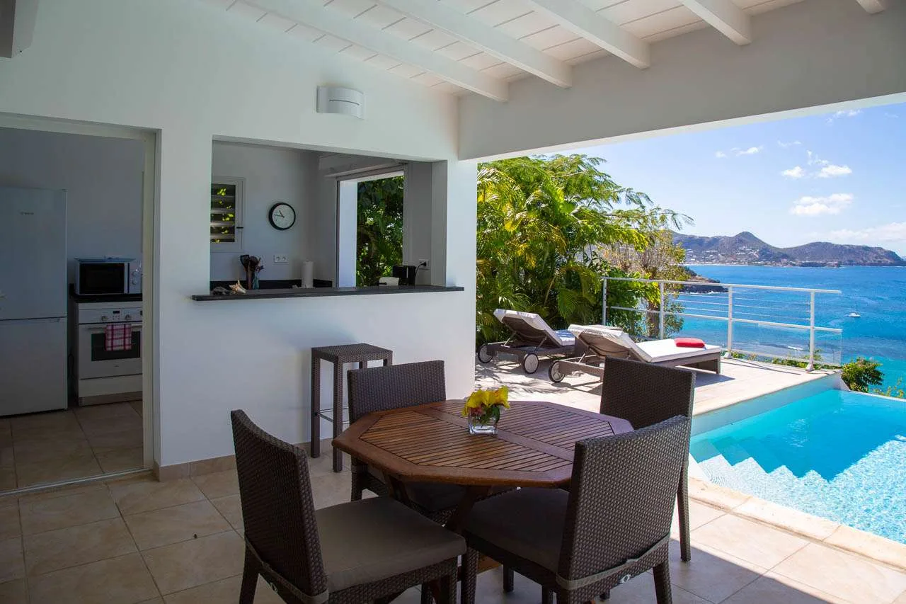 The kitchen opens to the covered terrace on one side, where the dining table sits. It’s a wonderful spot to share a meal with family and friends, with the shimmering ocean as a backdrop.