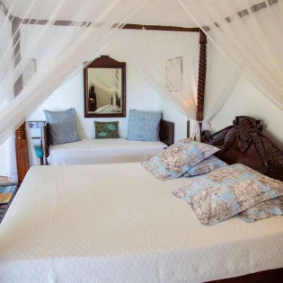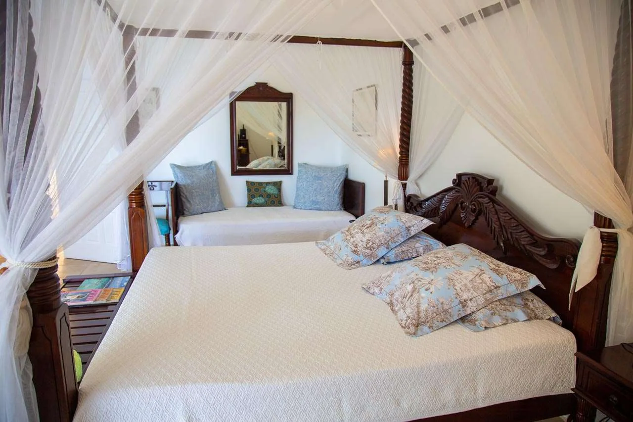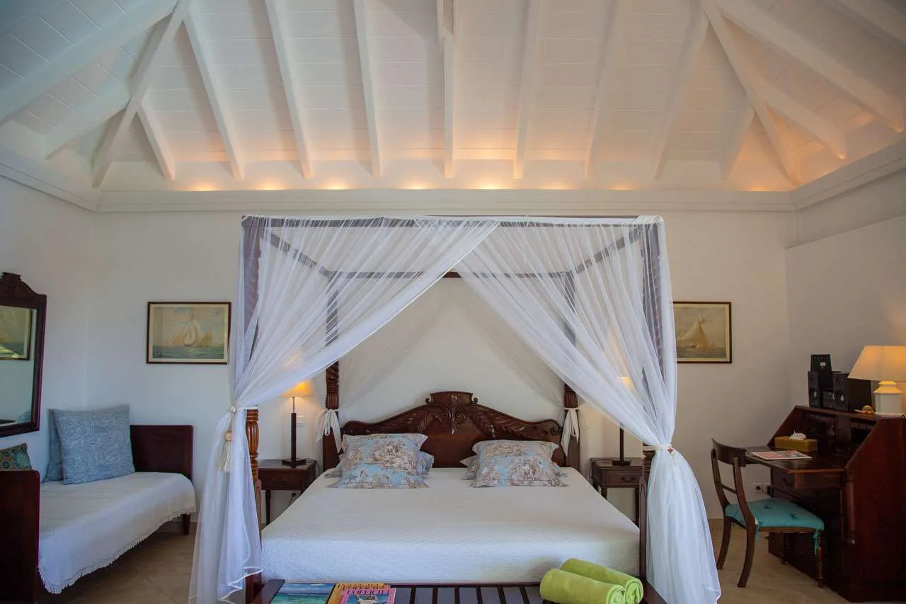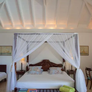 Back inside, the four-poster king-sized bed promises a wonderful night’s sleep. The colonial style of the bed is matched by several antique pieces in the room, giving the entire home a touch of old-world romance.