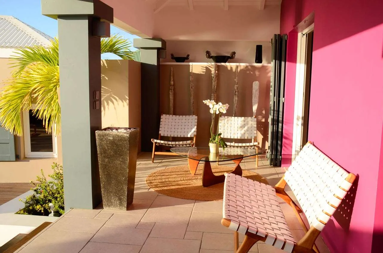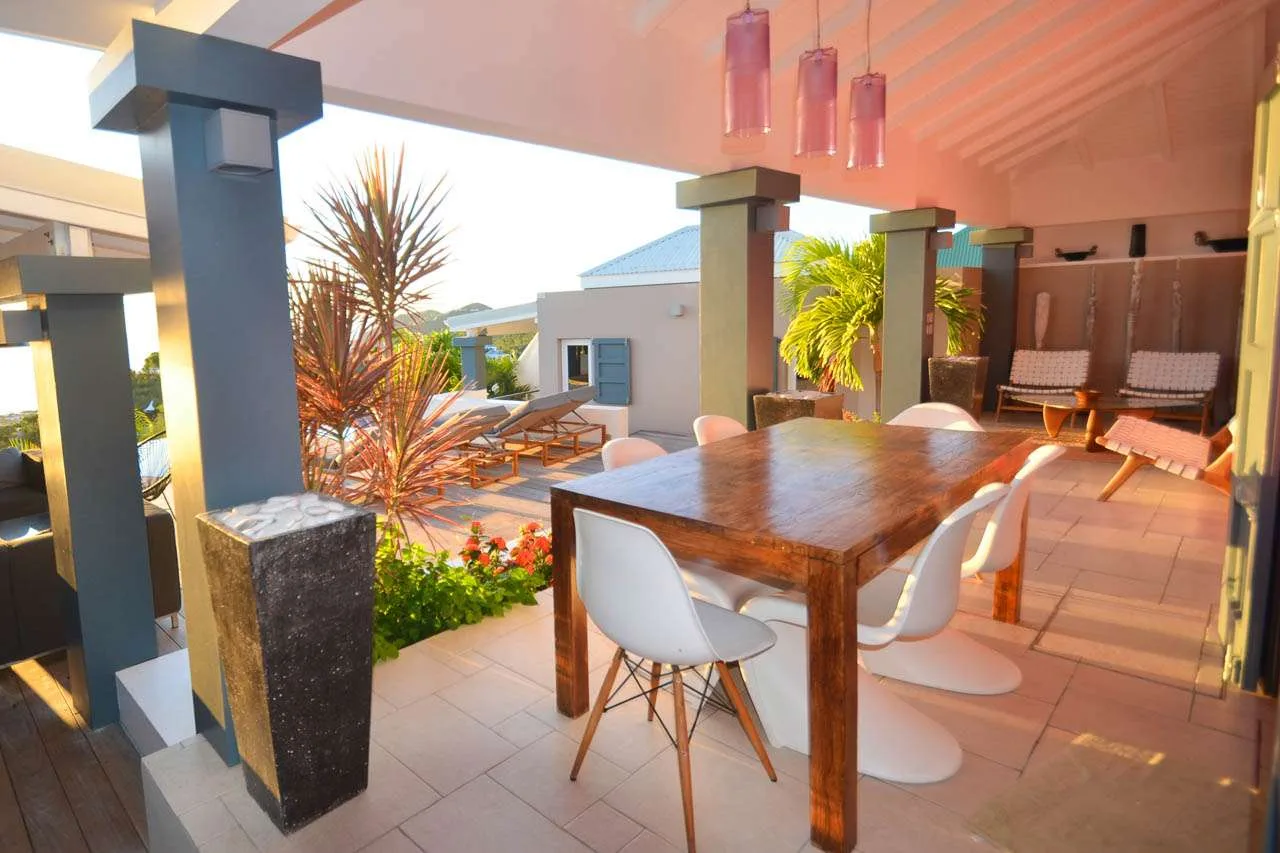 The living room opens onto a teak terrace facing the view and pool. There’s a wonderful sofa to sink into, and a pair of sleek armchairs as well. The entire space is awash with the island breeze, helping you kick back, relax, and slip into the enticing pace of life in St. Barts.