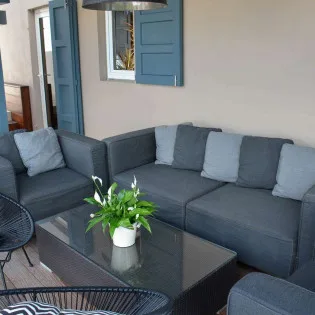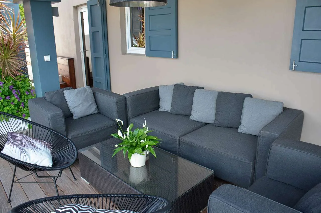 Whether you’re entertaining guests or spending a lazy day lounging around, the outdoor living spaces at Villa Vague Bleue are splendid. On the covered terrace next to the dining table are several chairs, all looking out toward the alluring ocean views.
