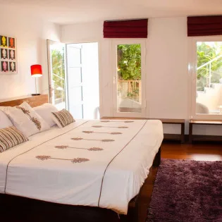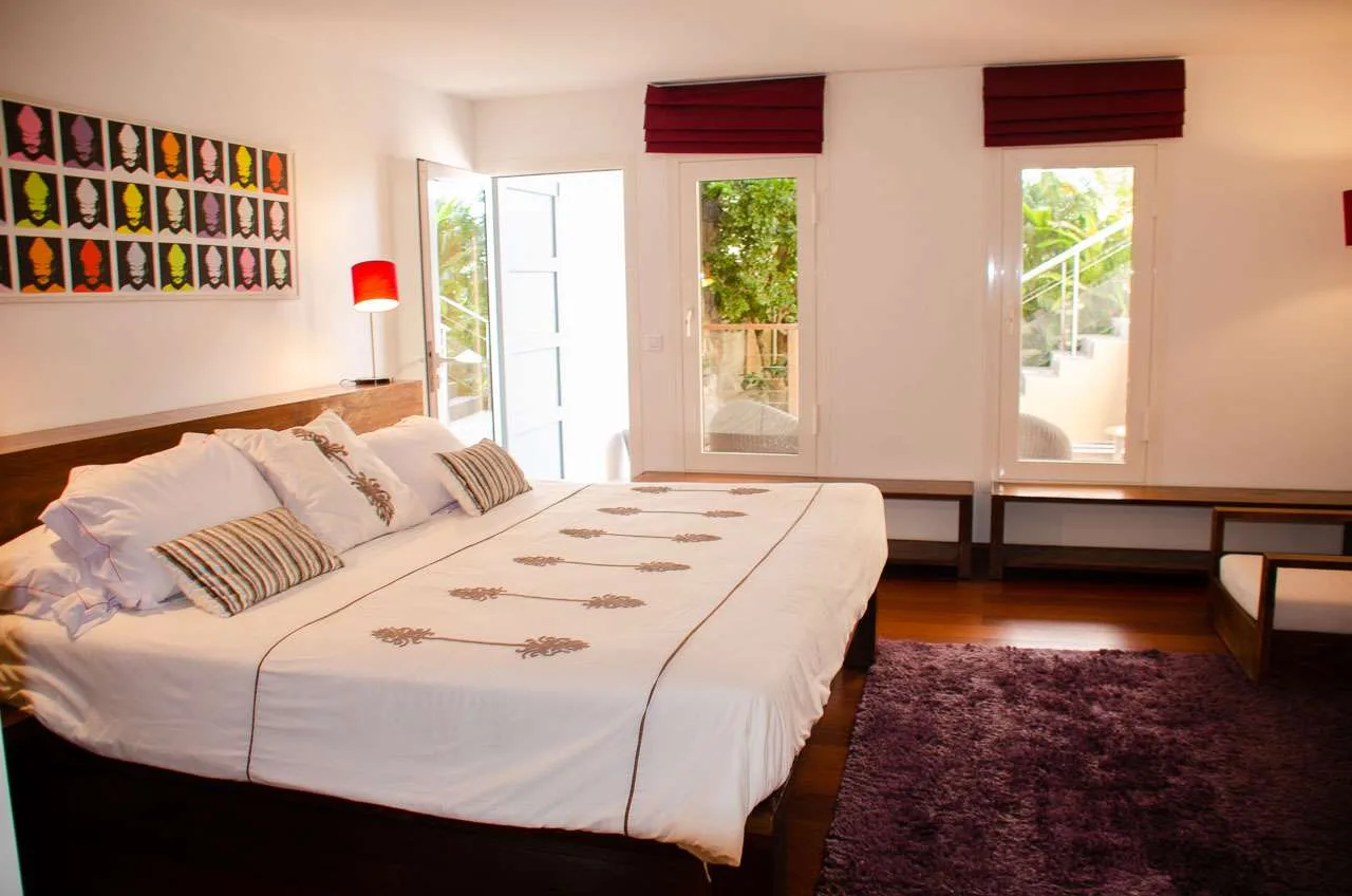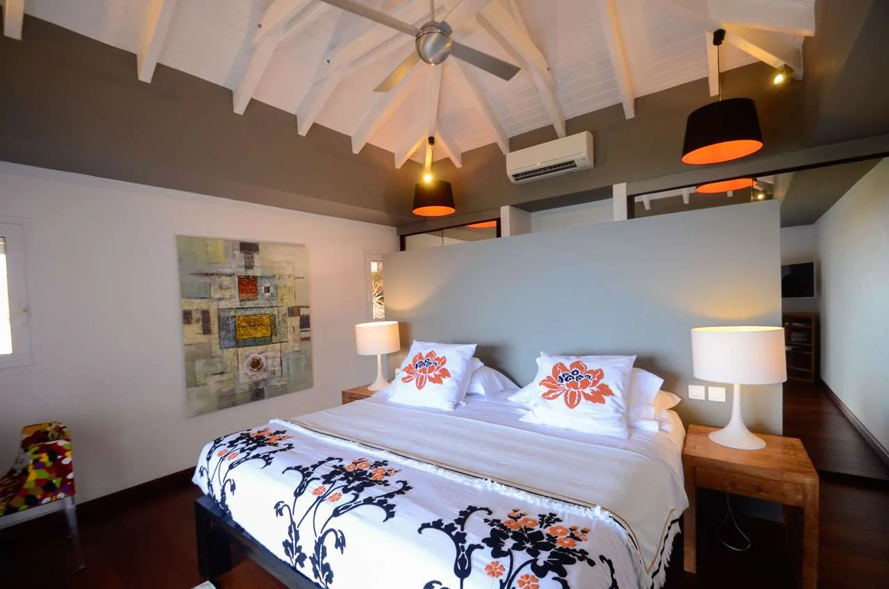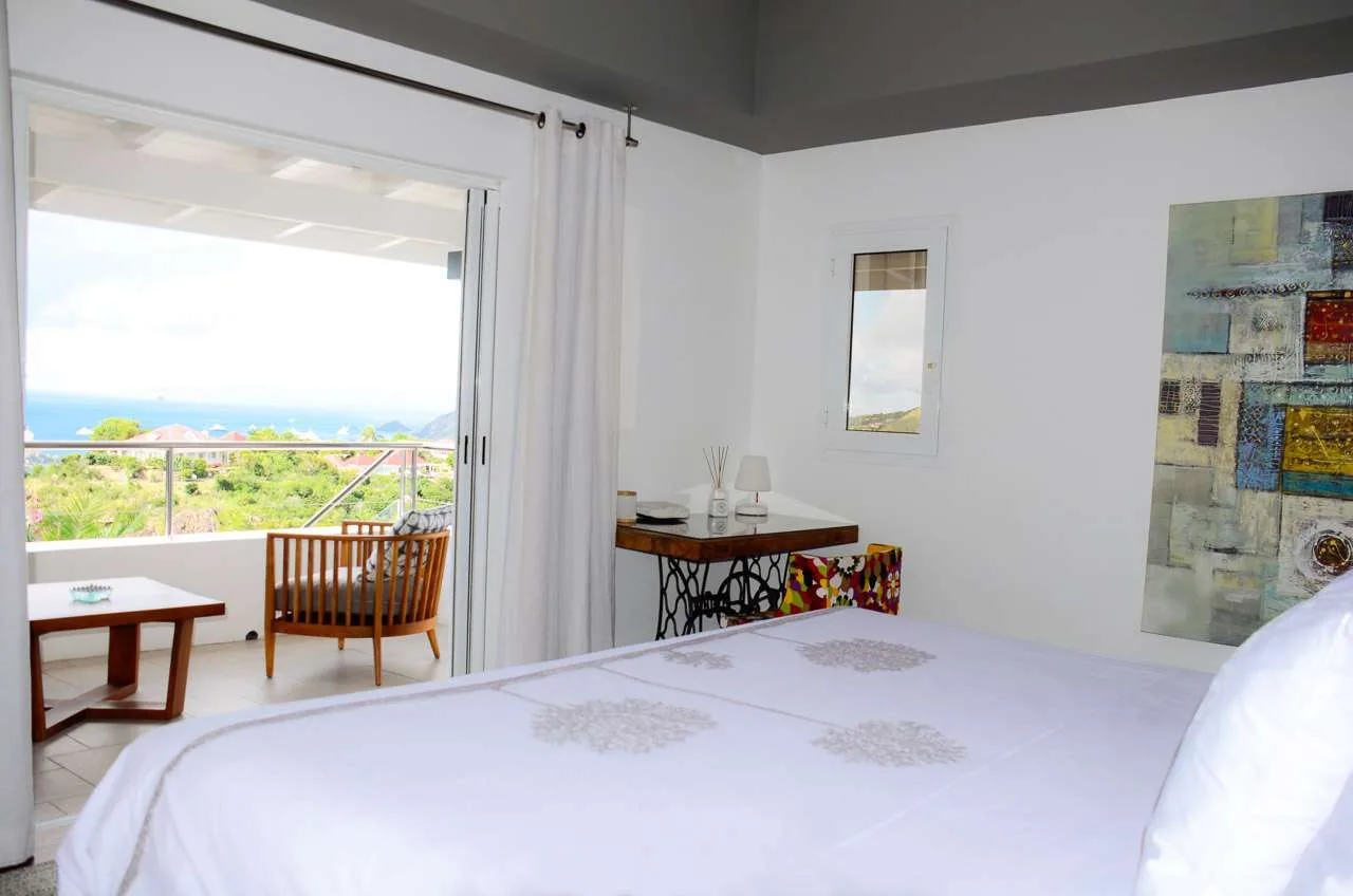 At the end of each day, retreating into one of the 3 bedrooms at Villa Vague Bleue provides comfort and quiet. These plush spaces use soft linens, textured throws and rugs, and modern art to create a peaceful, island atmosphere.