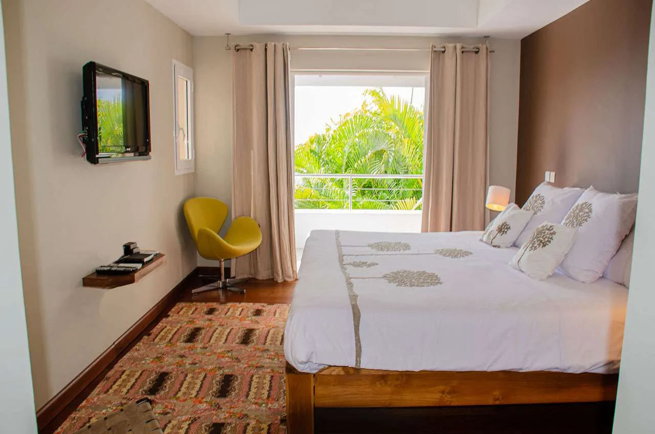 The contemporary décor inside Villa Vague Bleue is tastefully put together, combining wooden furnishings with a mix of white and colorful feature walls. There’s ocean glass on display, photographic prints and artworks, and the panoramic views enhancing it all.