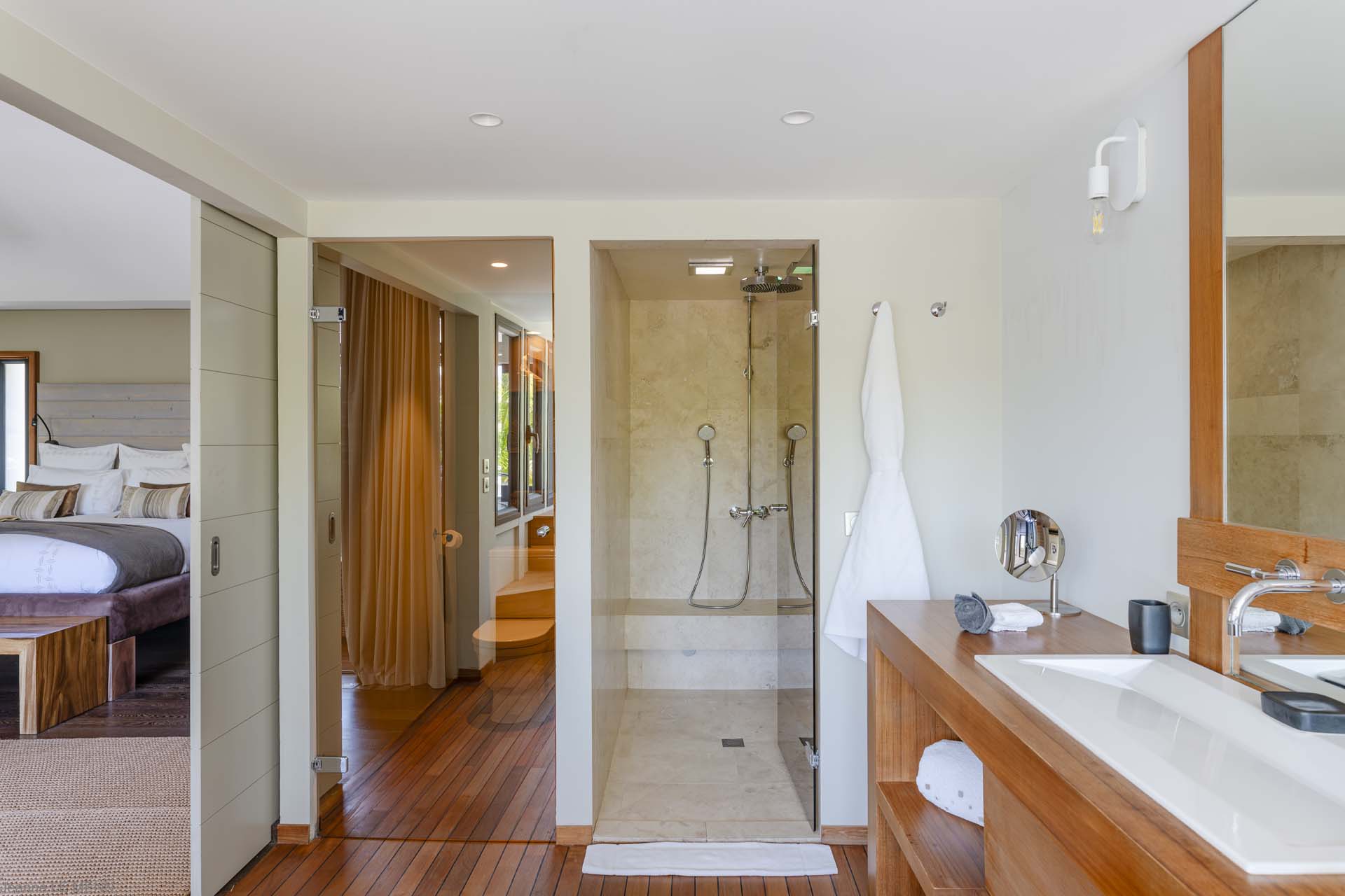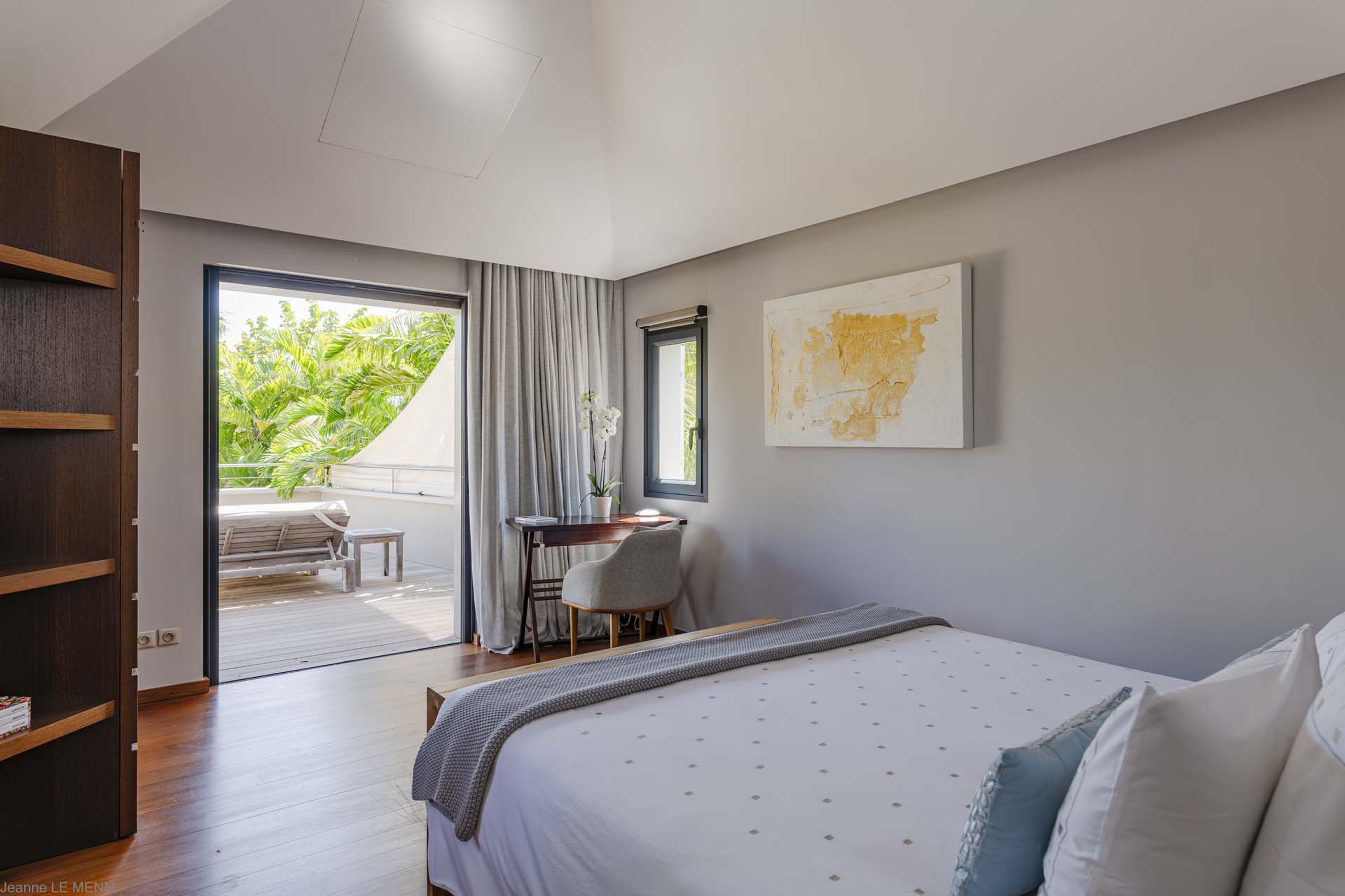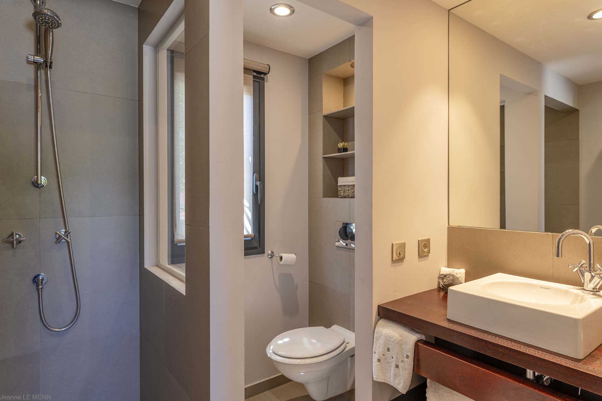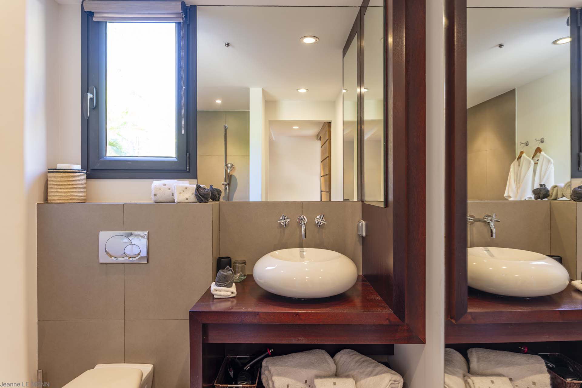The 2 other bedrooms are located on the main level and each has a queen-size bed, ensuite bathroom, and private entrance via the terrace.