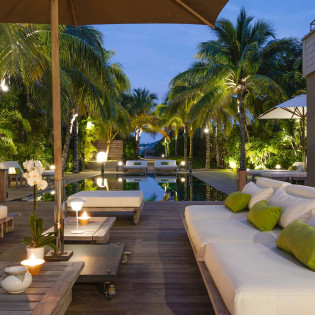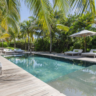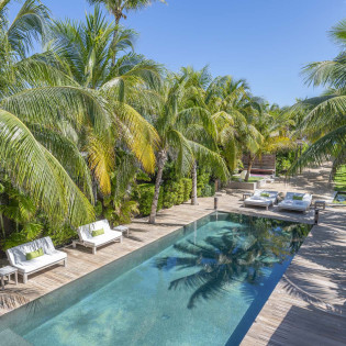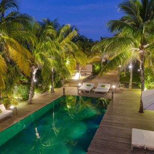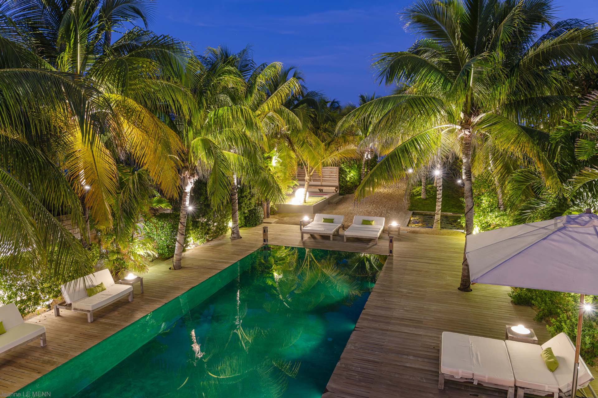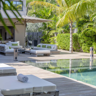 Palm trees and a spacious wooden terrace with several sitting areas surround the large, heated swimming pool, which is illuminated at night. An aquatic garden with a waterfall enhances the grounds.