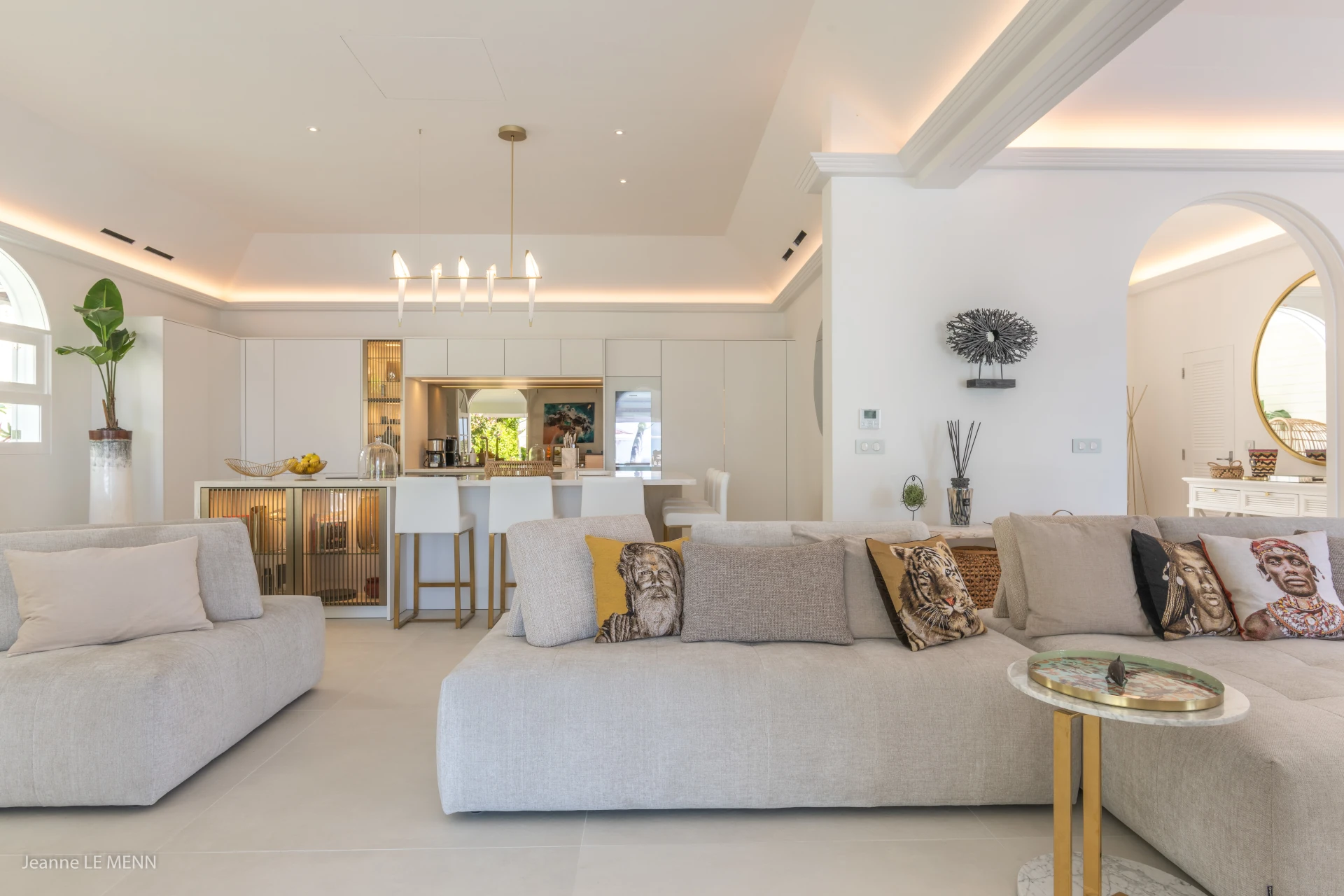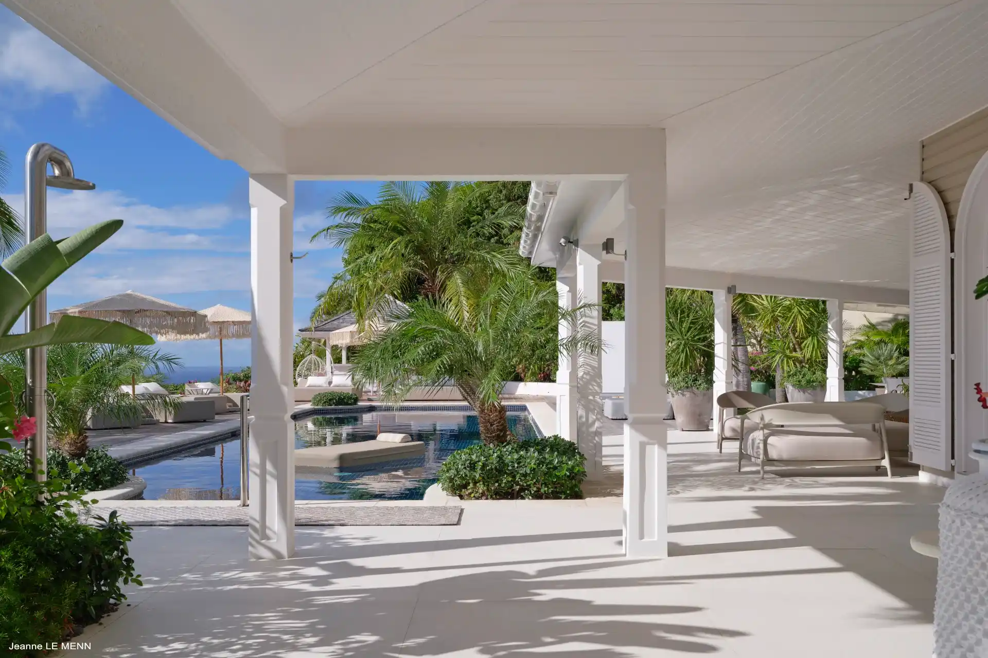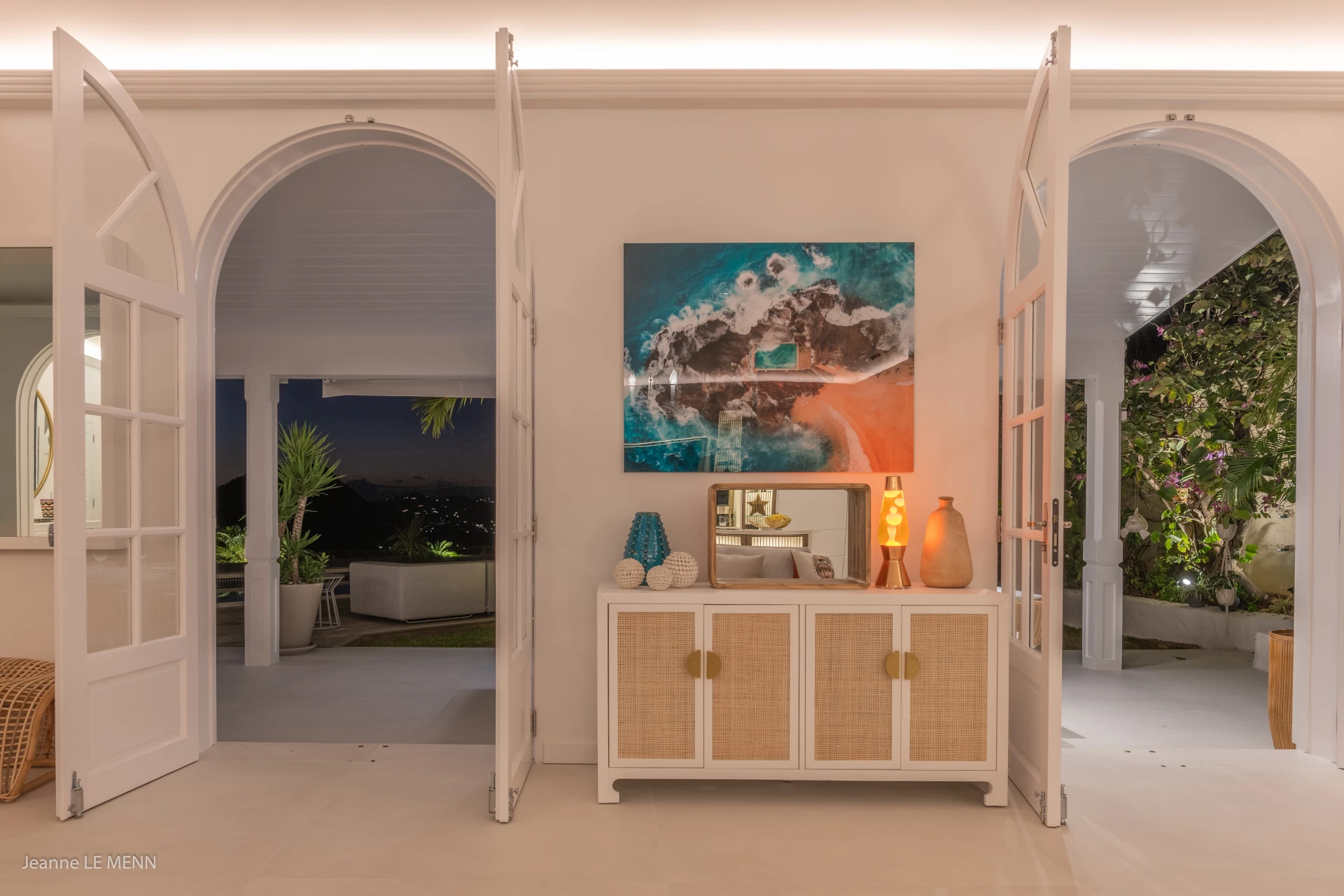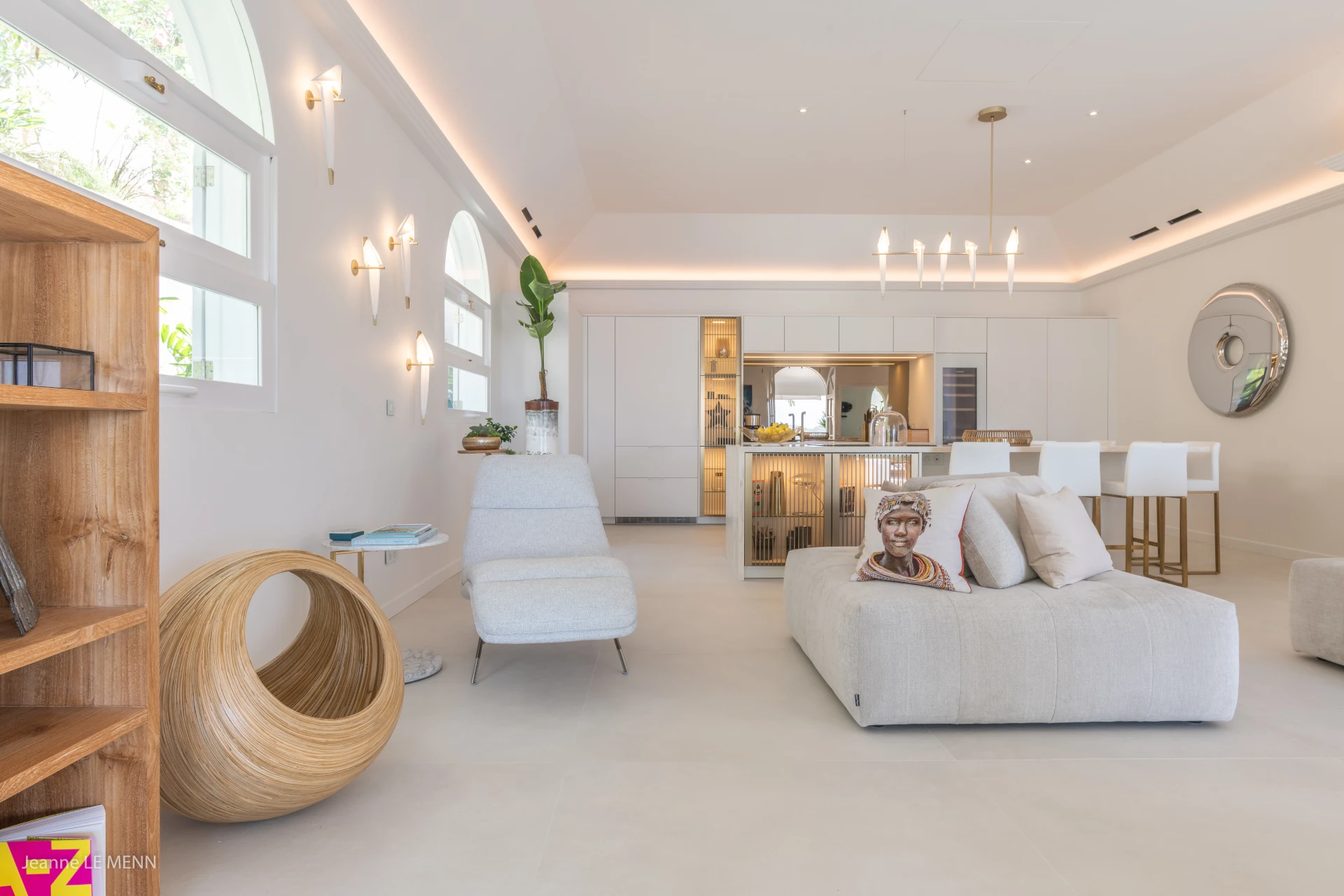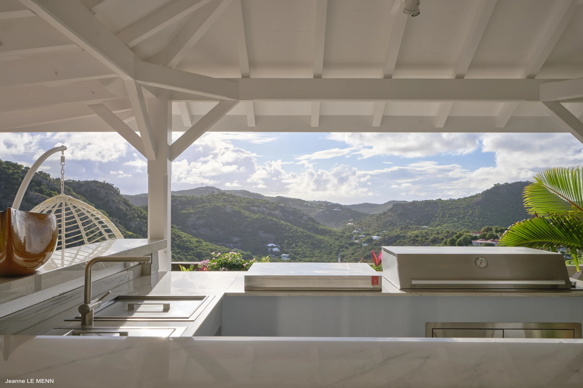 A West Indies-style property, Villa White Sun embraces rustic luxury and simplicity. A formal entrance leads into a spacious main living area, which can be fully air-conditioned if desired. The open layout extends toward the view through elegant arched doorways, featuring a comfortable TV lounge and a sleek, fully equipped kitchen with a breakfast island at the rear.
