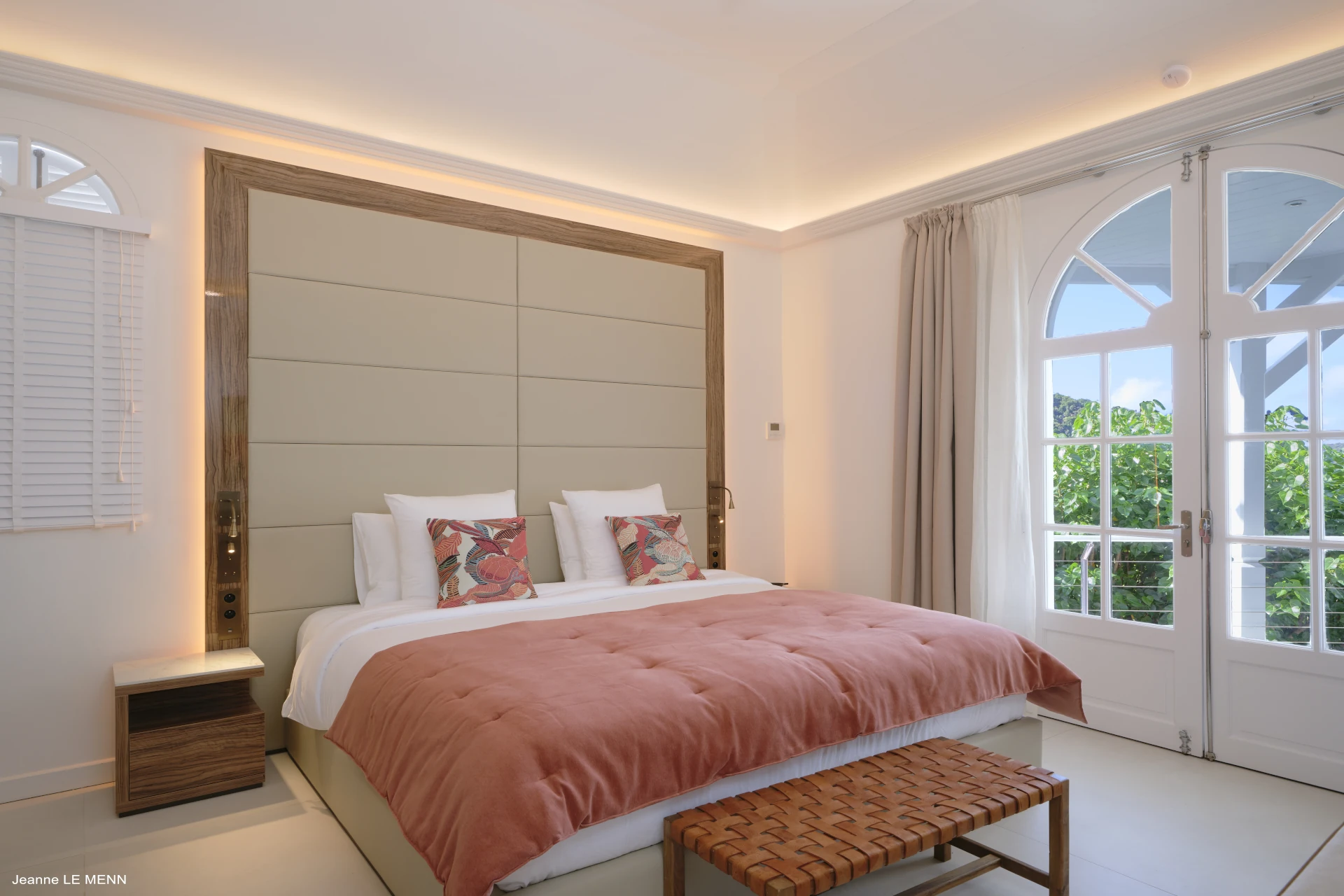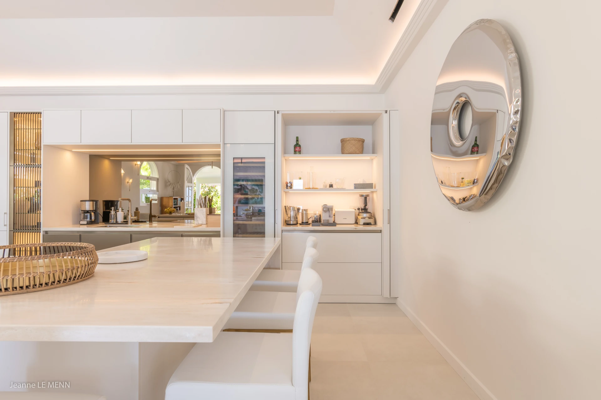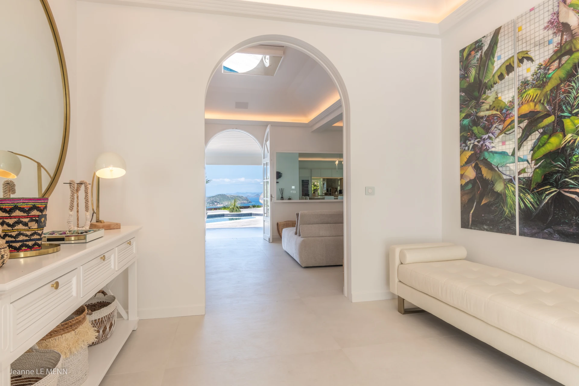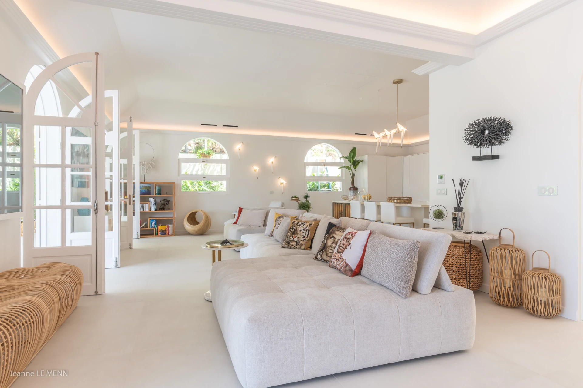A West Indies-style property, Villa White Sun embraces rustic luxury and simplicity. A formal entrance leads into a spacious main living area, which can be fully air-conditioned if desired. The open layout extends toward the view through elegant arched doorways, featuring a comfortable TV lounge and a sleek, fully equipped kitchen with a breakfast island at the rear.