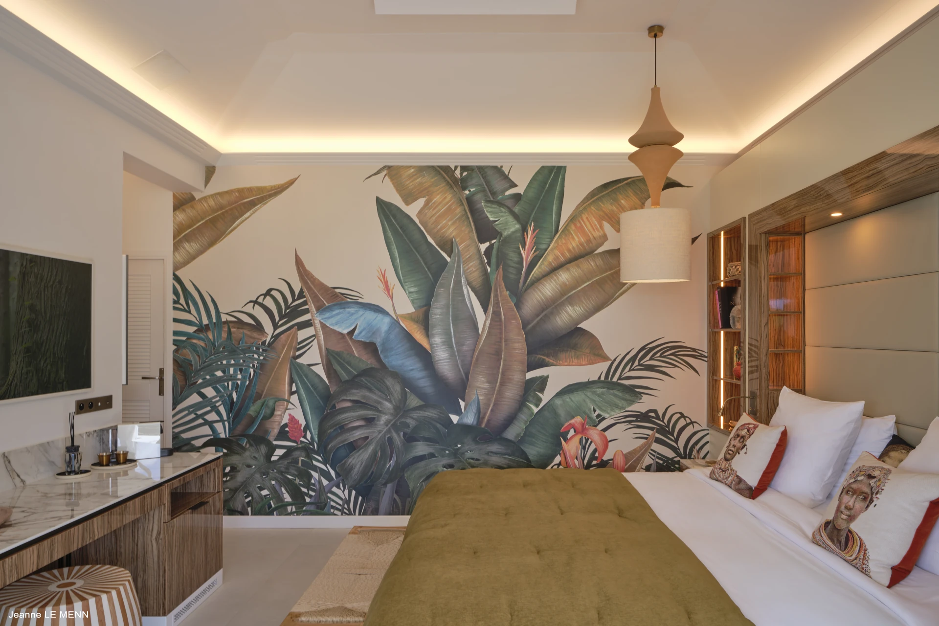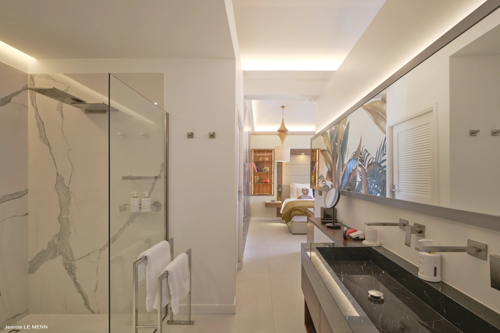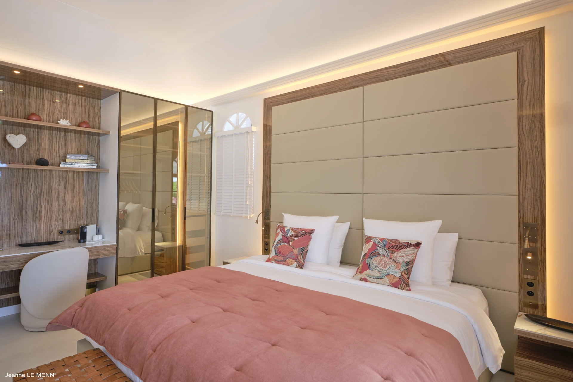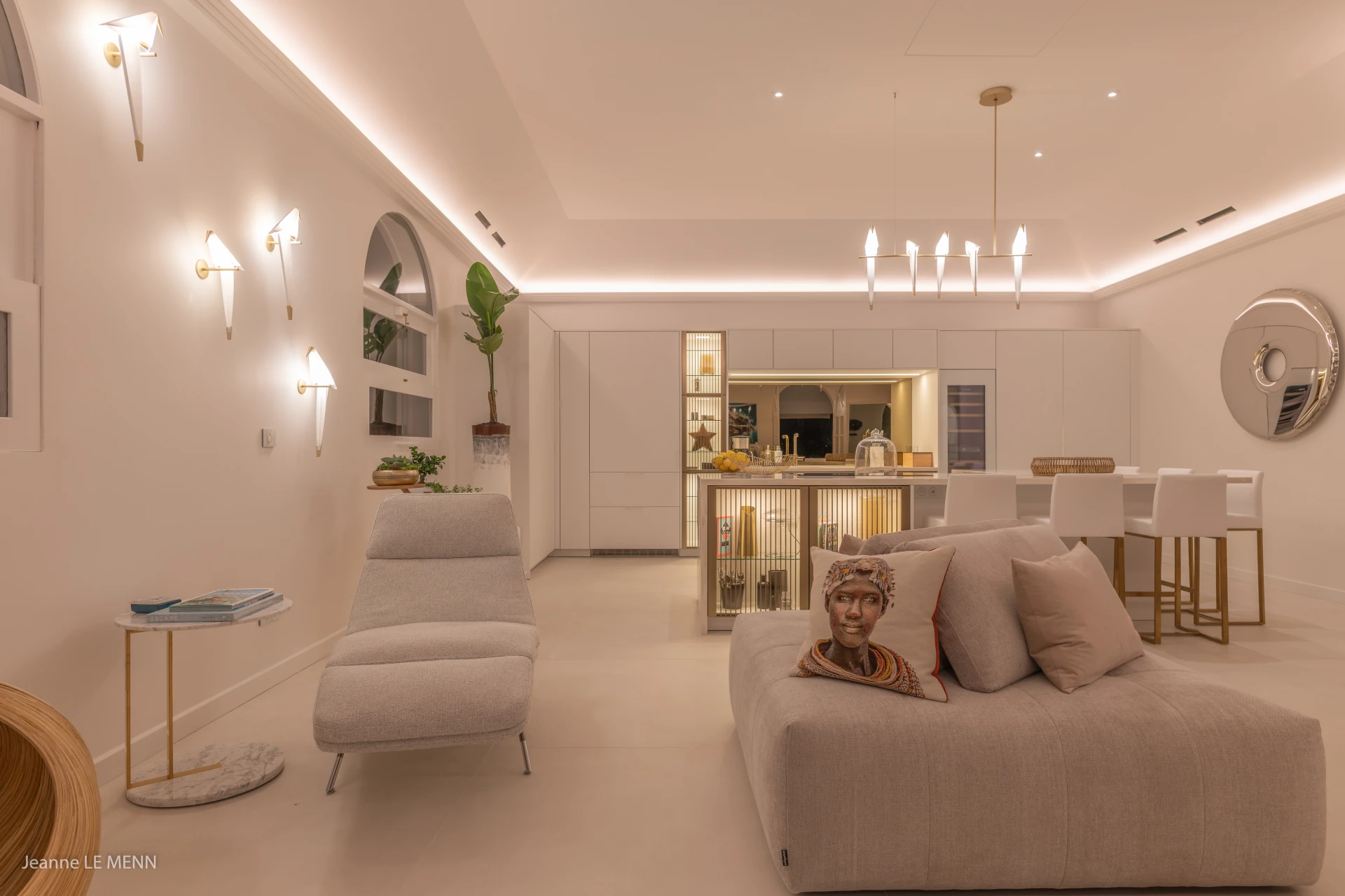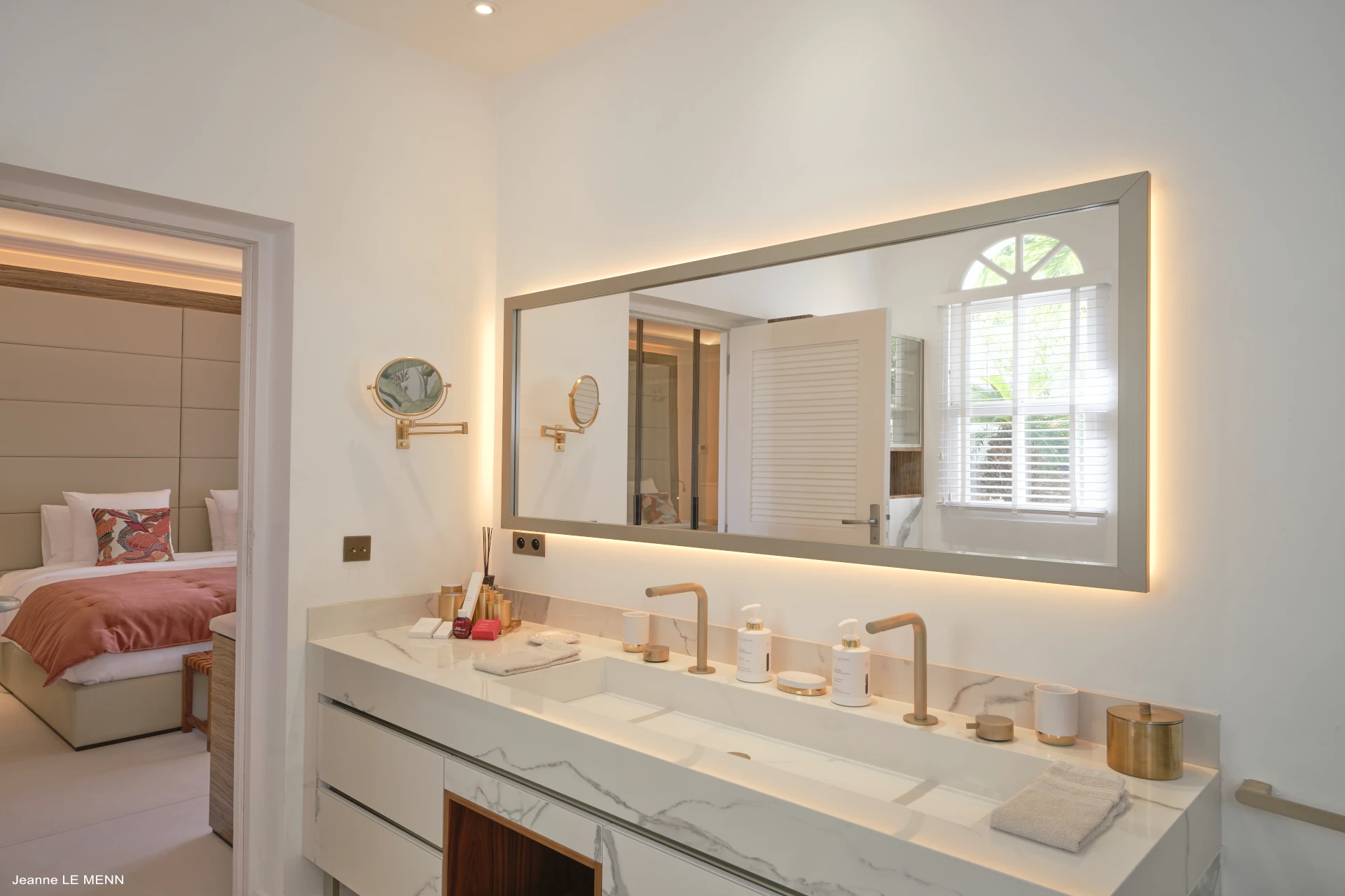A West Indies-style property, Villa White Sun embraces rustic luxury and simplicity. A formal entrance leads into a spacious main living area, which can be fully air-conditioned if desired. The open layout extends toward the view through elegant arched doorways, featuring a comfortable TV lounge and a sleek, fully equipped kitchen with a breakfast island at the rear.