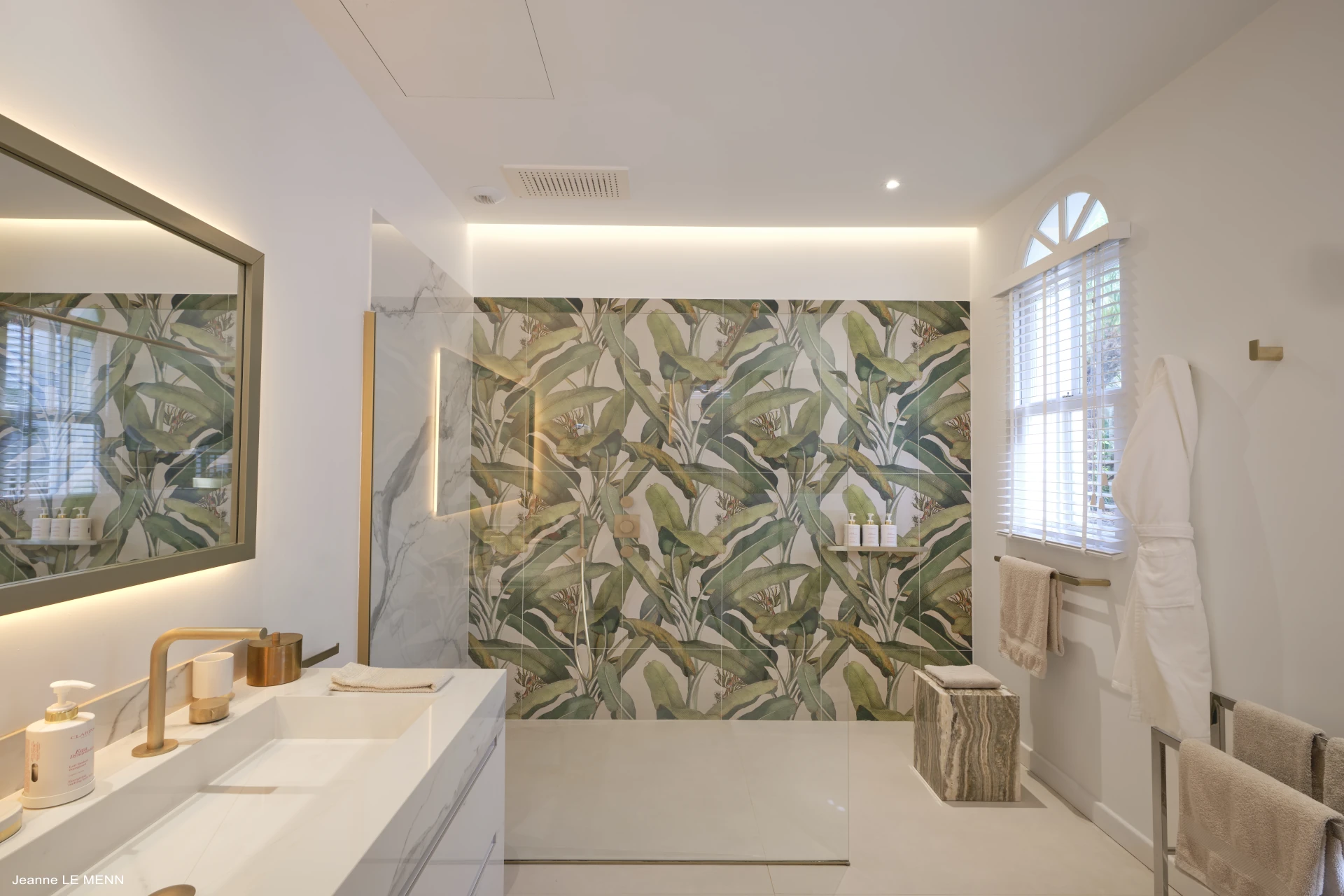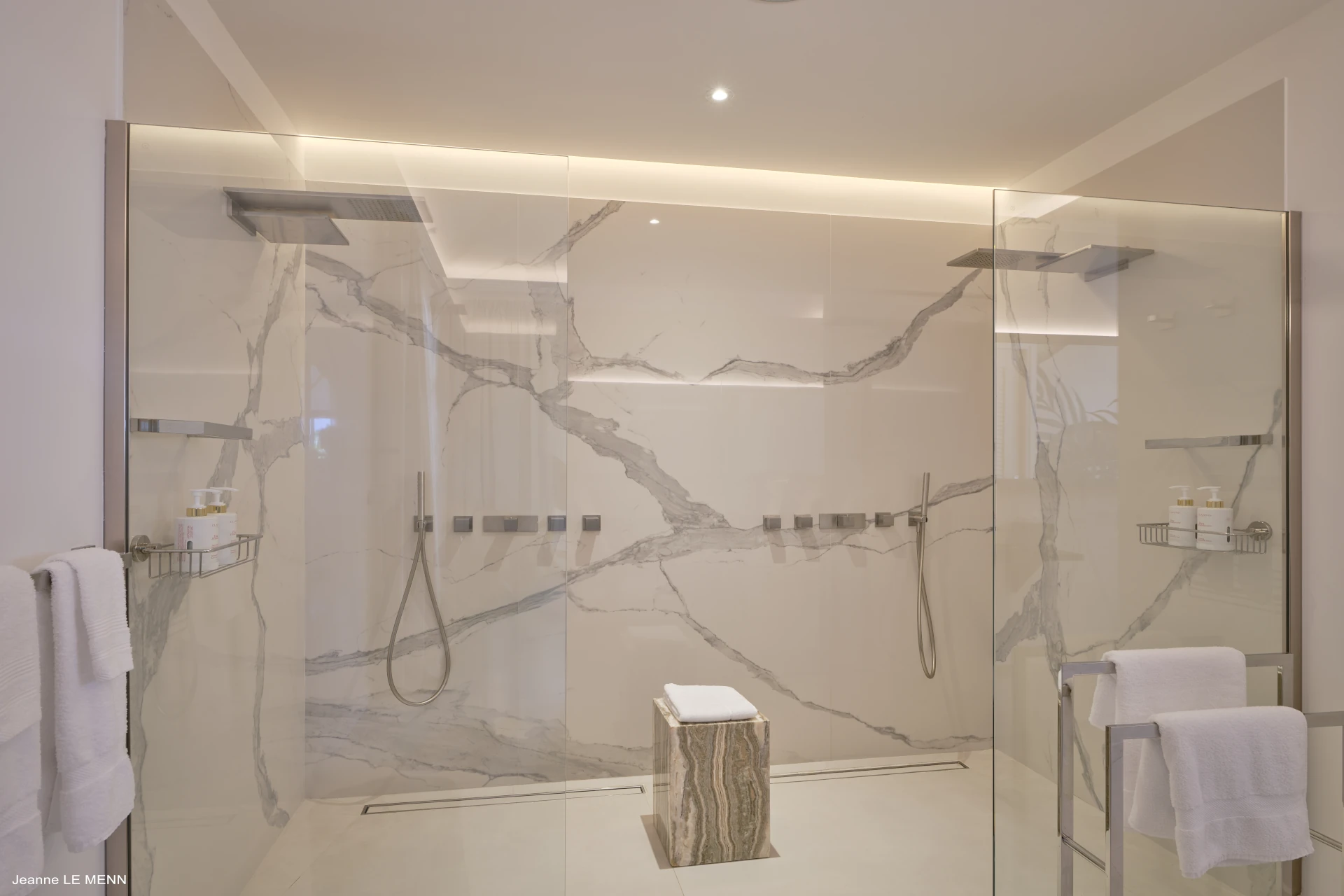 The highlight of the villa is its stunning outdoor space. Beautifully landscaped gardens frame the expansive terrace, blending effortlessly with the surrounding mountains and the ocean beyond. A heated 55-foot pool, ideal for lap swimming, is easily accessible via steps at one end. At the far side of the terrace, a gazebo houses an outdoor kitchen with a grill and plancha—perfect for both casual meals and entertaining.