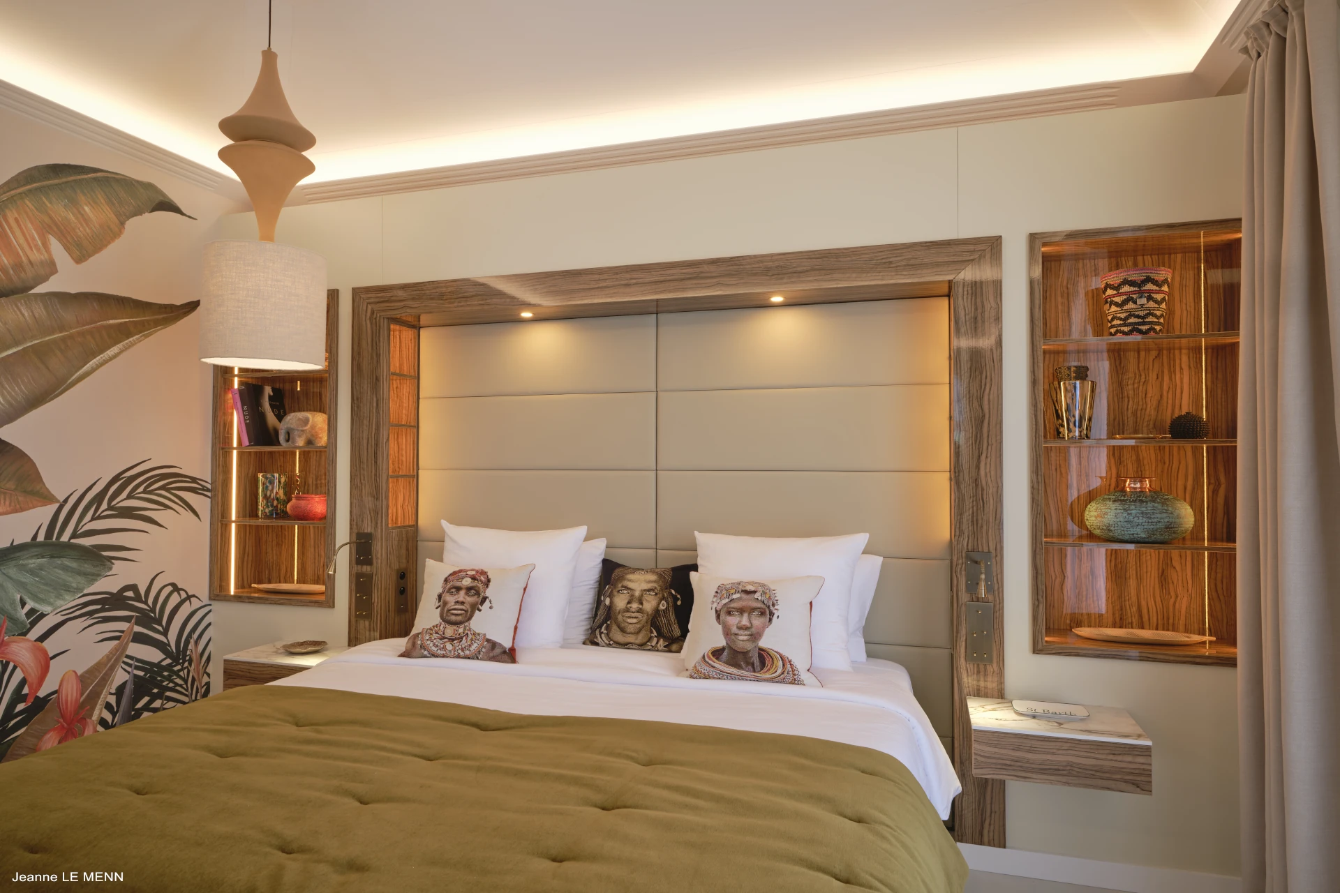 Just outside, a covered terrace runs the length of the villa, offering inviting lounge seating and an outdoor dining area that connects seamlessly to the three bedrooms.