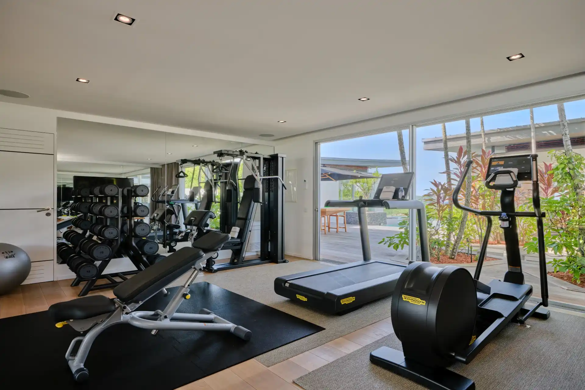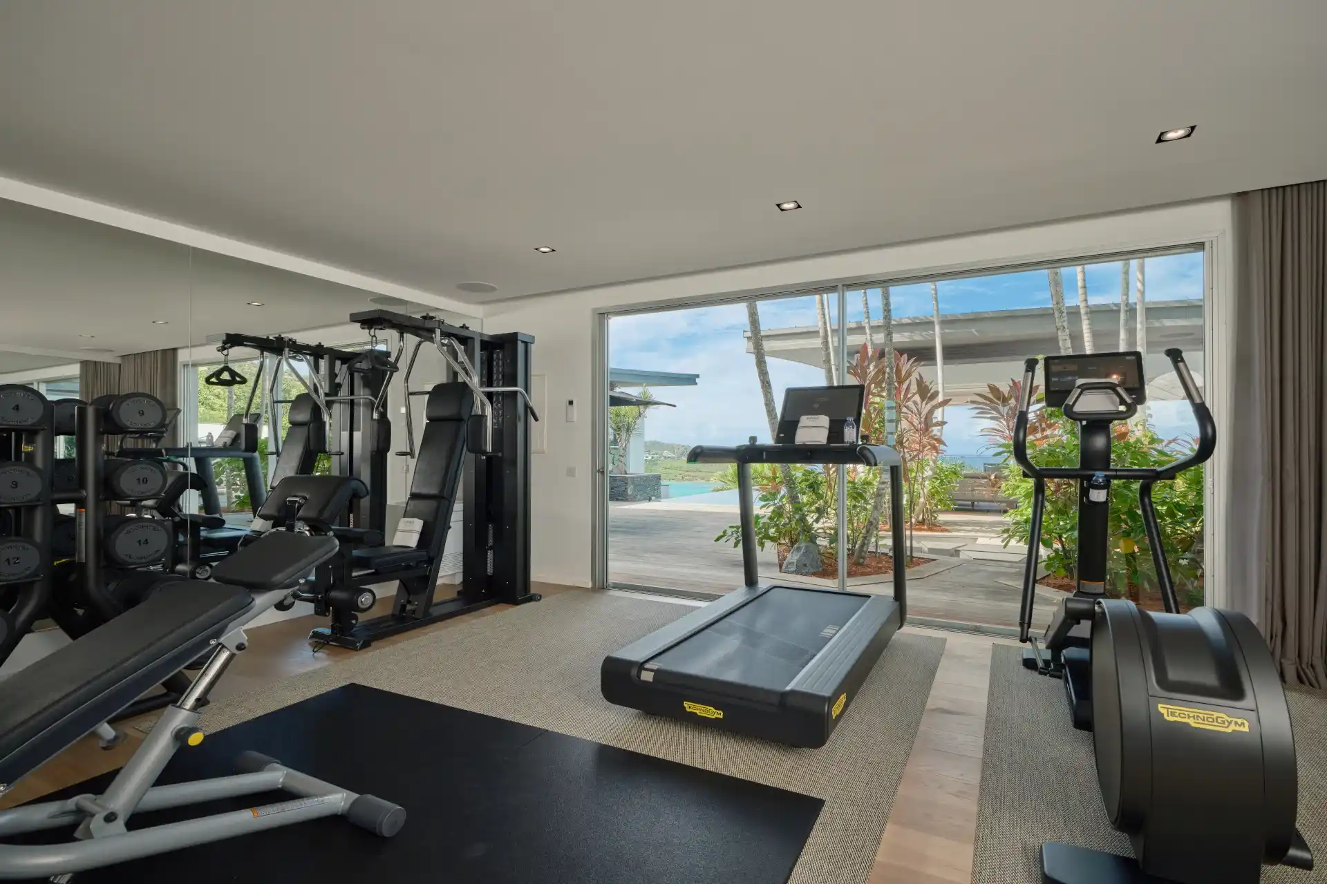 The infinity-edge pool, also heated in winter, takes center stage on a sprawling deck, perfect for gatherings with family and friends or hosting grand events. Additionally, the villa includes an air-conditioned fitness room.