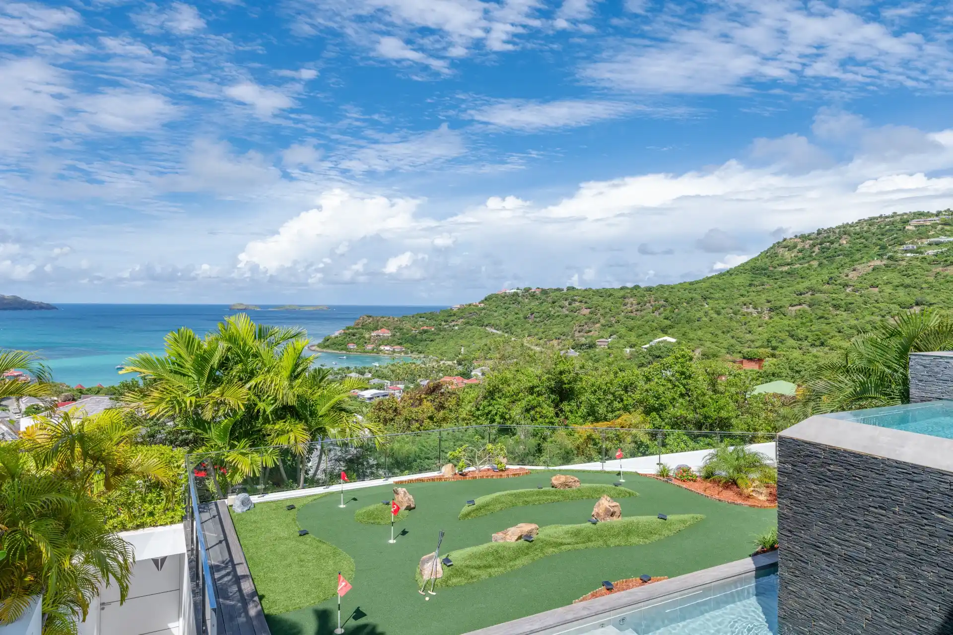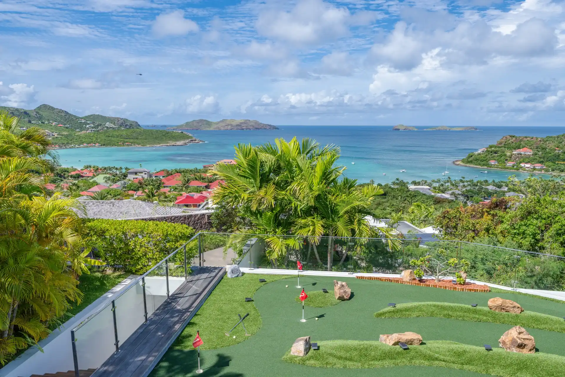 It skillfully combines secluded privacy with close proximity to St. Jean Beach and the charming village's boutiques and restaurants. Spanning three levels, the expansive outdoor living space offers a panoramic bird's-eye view.