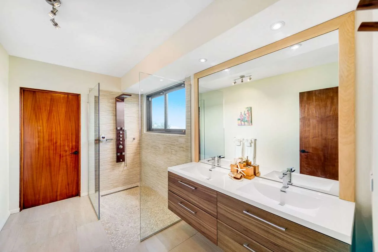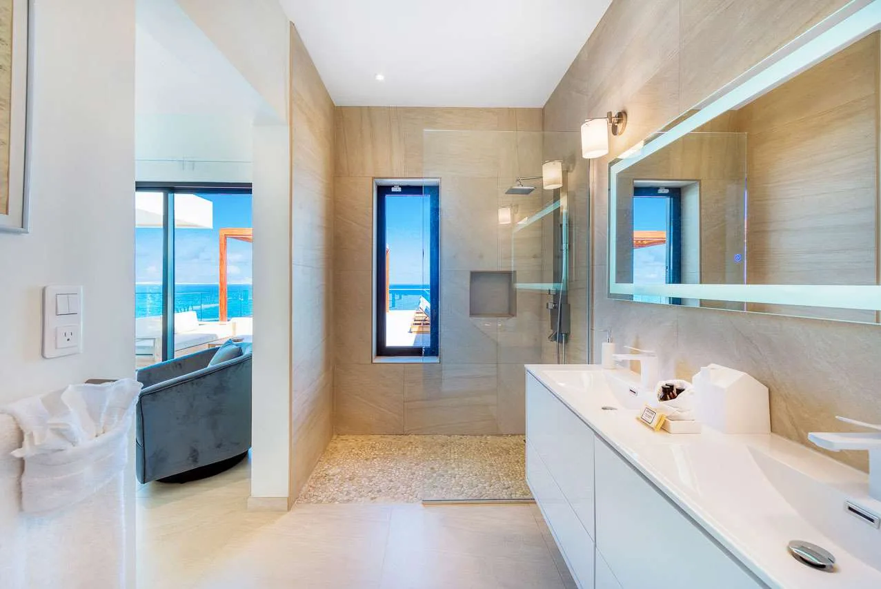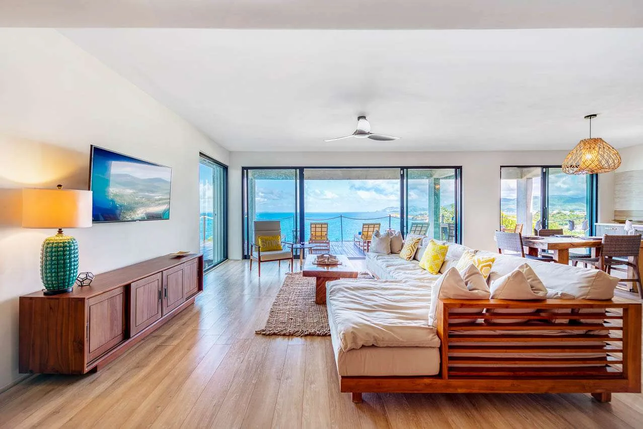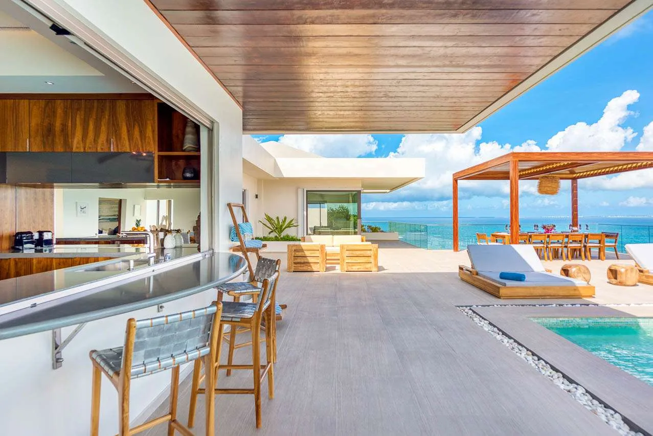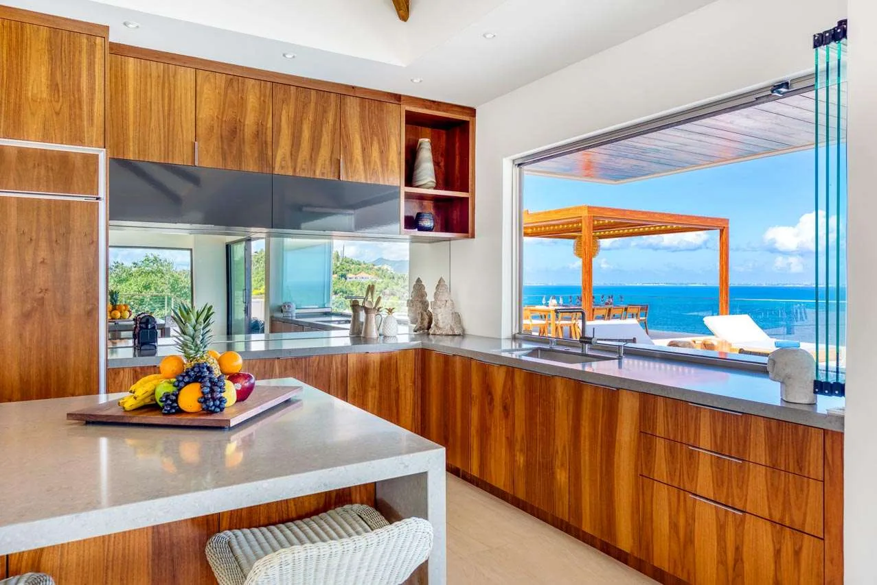 Situated on the main level are the open-plan kitchen and living area, which look out to the breathtaking panoramic ocean view through large glass sliding doors. This area opens onto a covered terrace with comfortable lounge chairs and a mosaic-lined infinity edge pool.