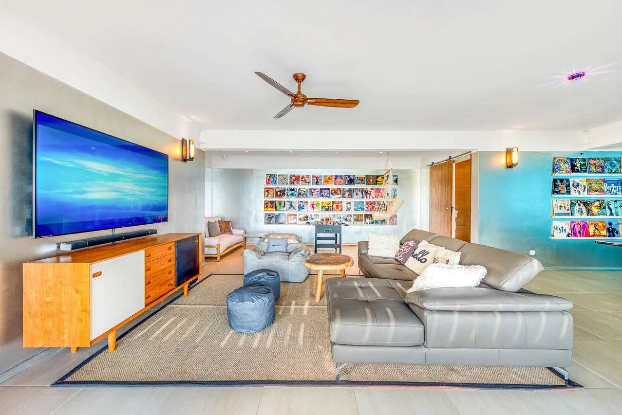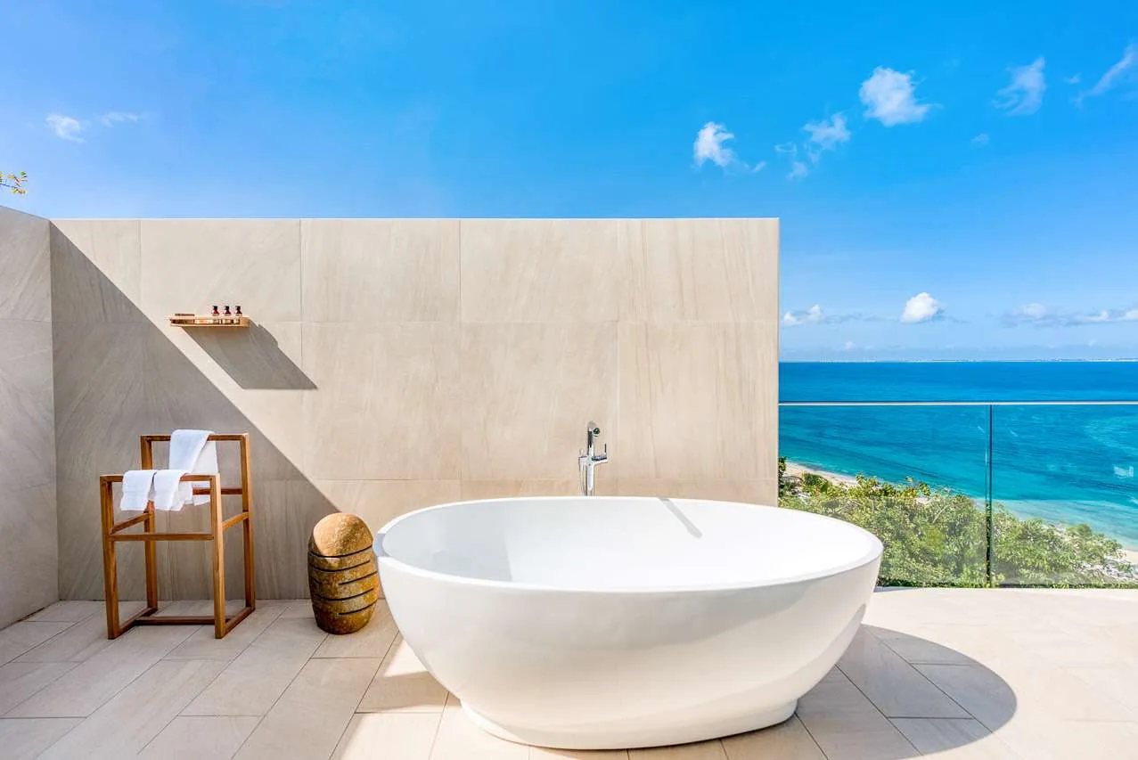 A media room with a 70-inch plasma TV completes the interior. A “Massage Bali house” offers an authentic outdoor stone-carved tub with a water view. This villa also comes with an outdoor dining area, bocce court, and ping-pong table.
