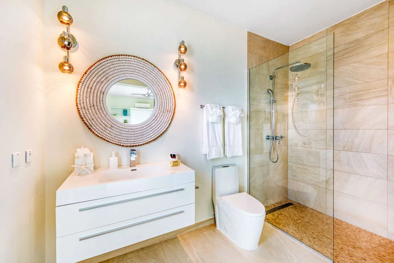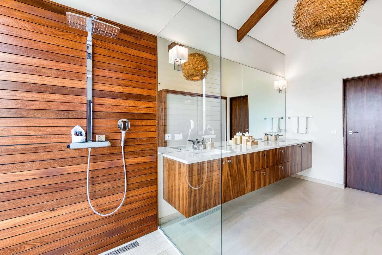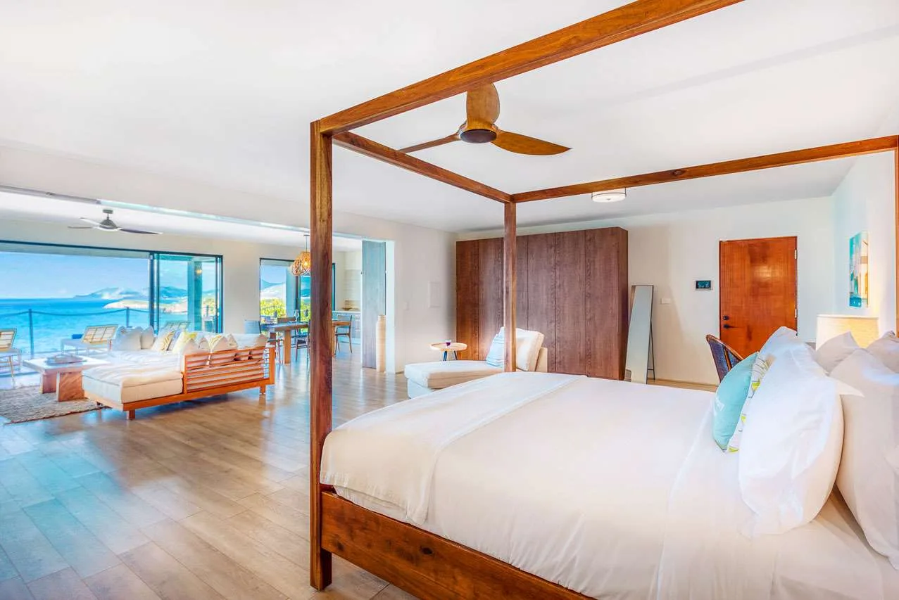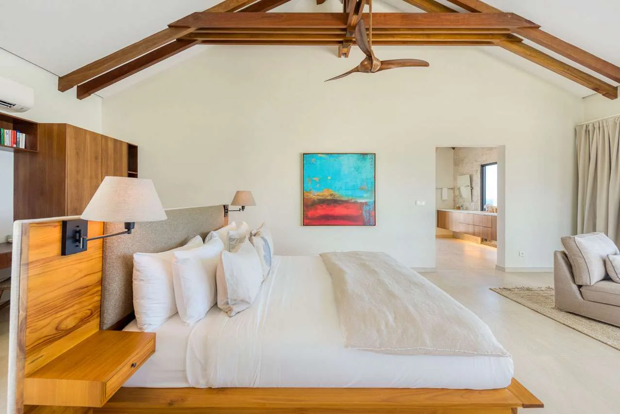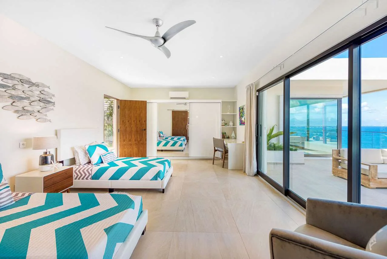 Each air-conditioned bedroom has an ensuite bathroom. Four bedrooms are located on the upper level, while the fifth bedroom is situated in an apartment on the lower level with a kitchen and private terrace. Three bedrooms have king-size beds, while 1 bedroom is furnished with a queen-size bed and 1 bedroom has twin beds.