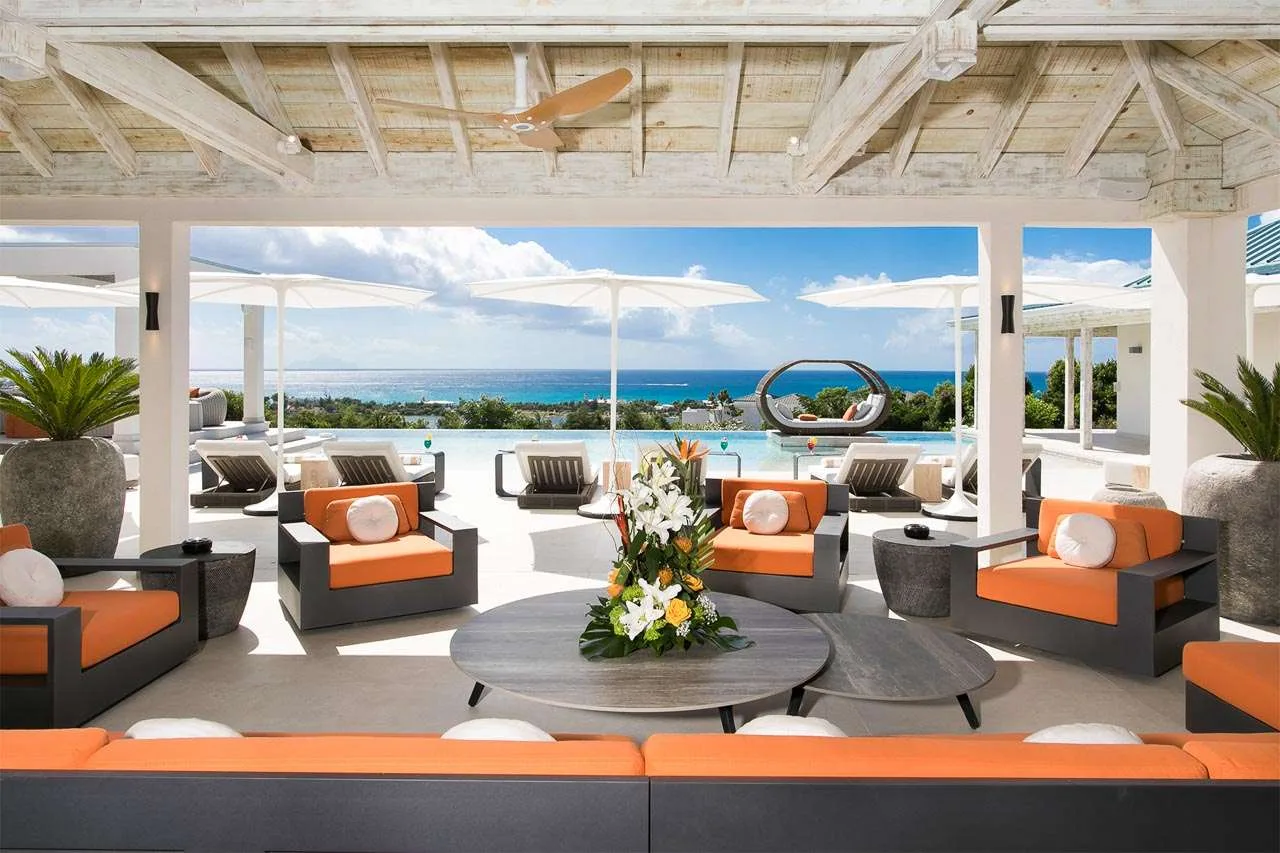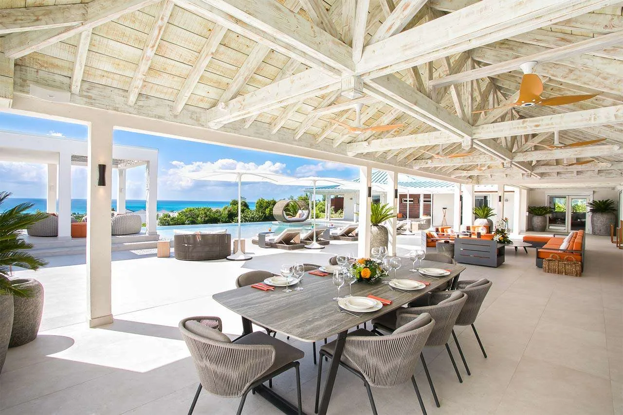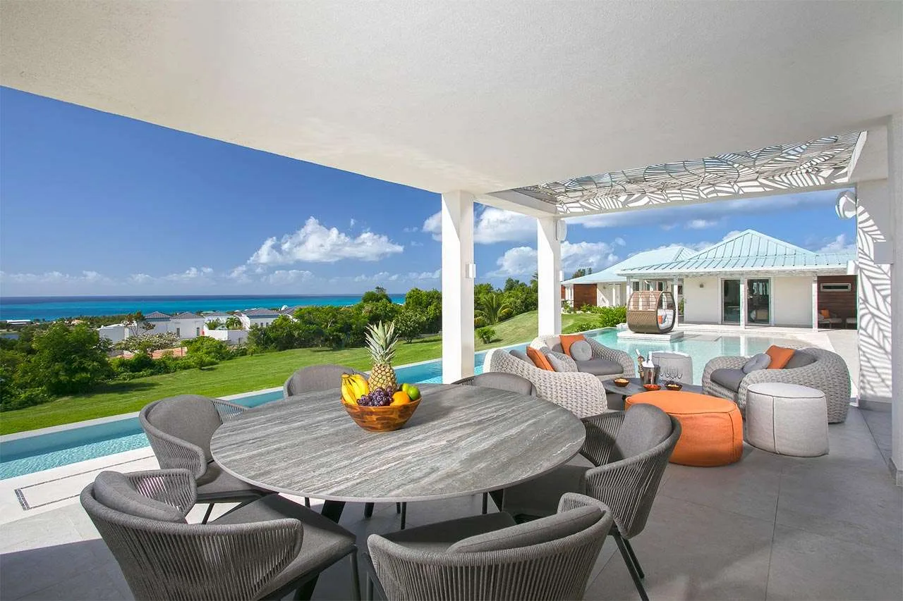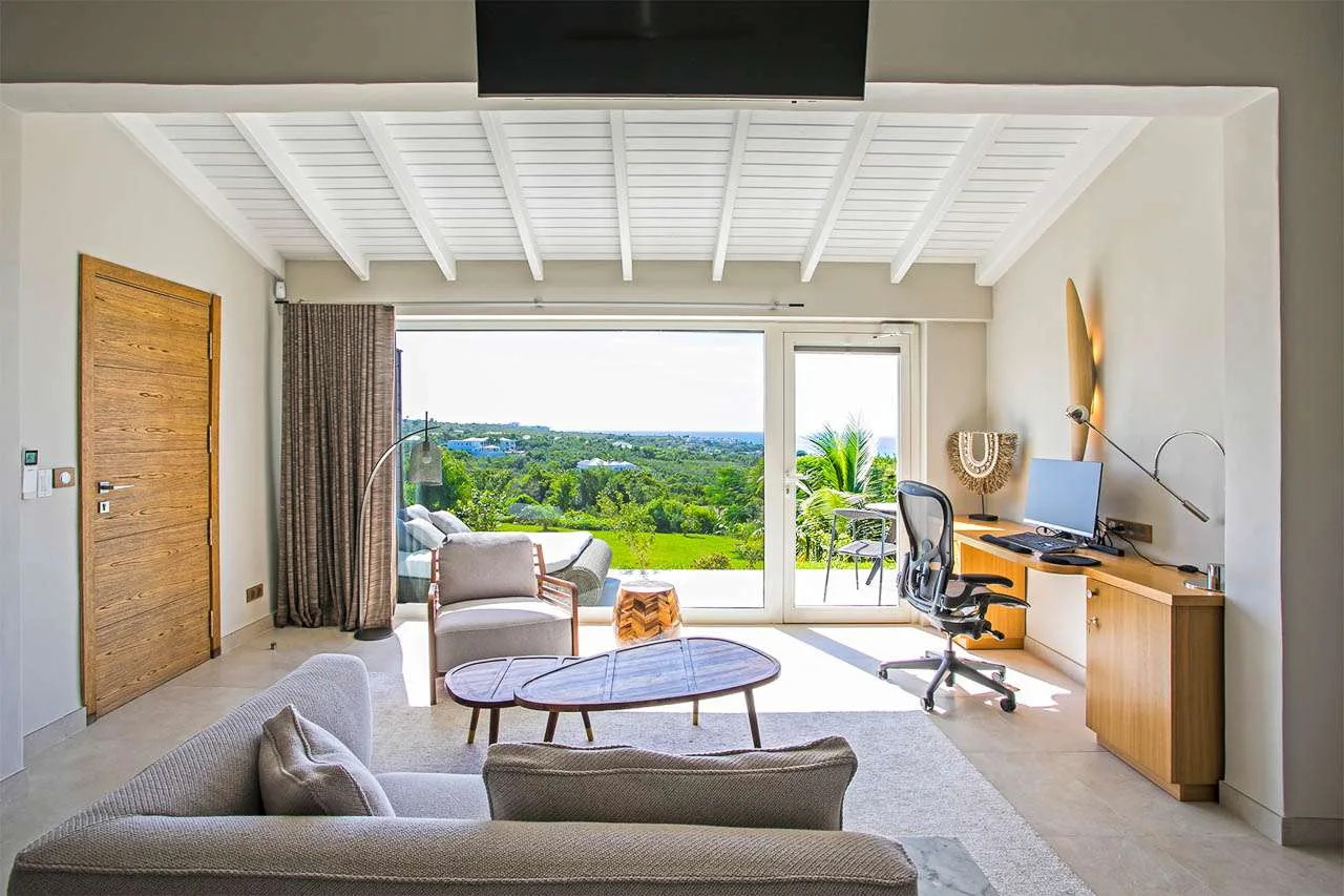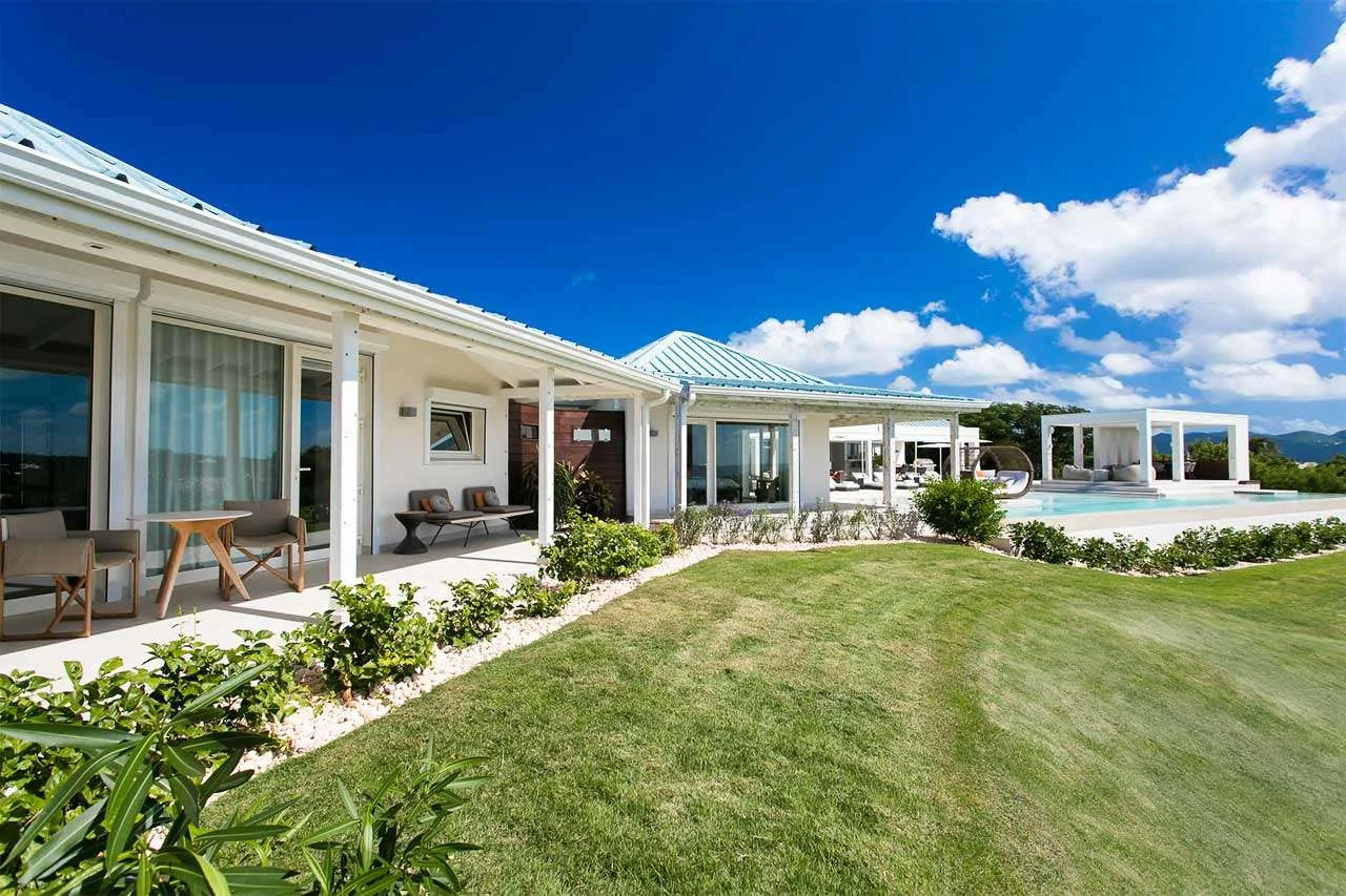 The doors open through to an immense indoor/outdoor living space with a sweeping 180-degree view over the ocean with Saba on the distant horizon and a lush verdant lawn in the foreground.
