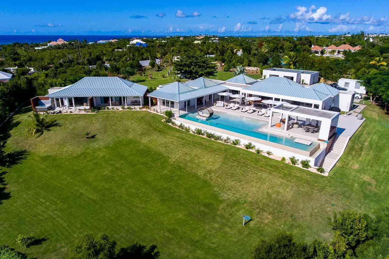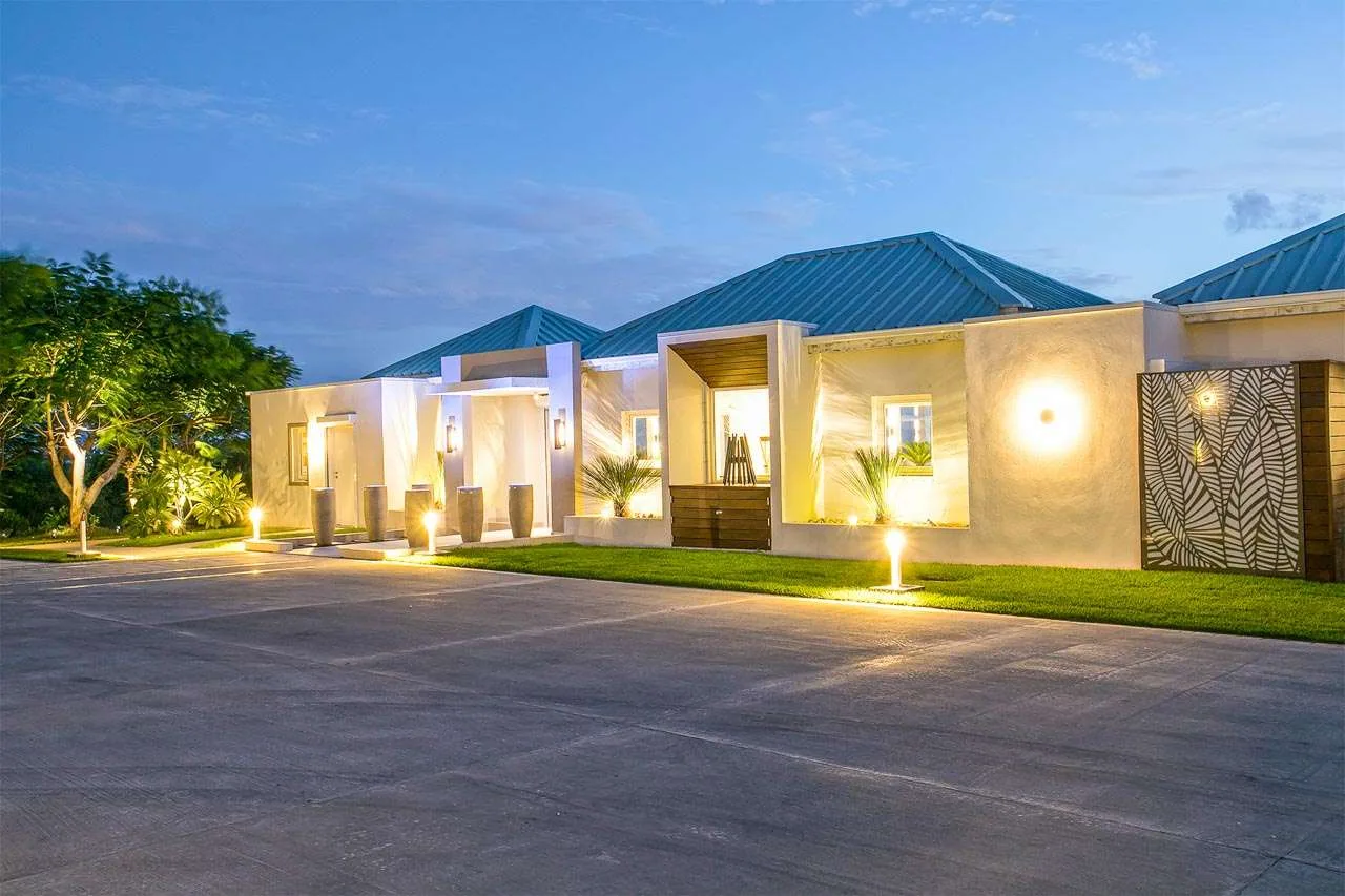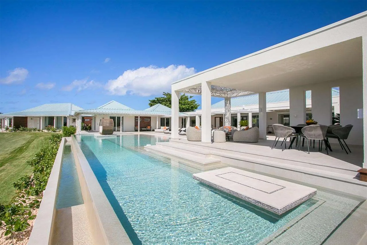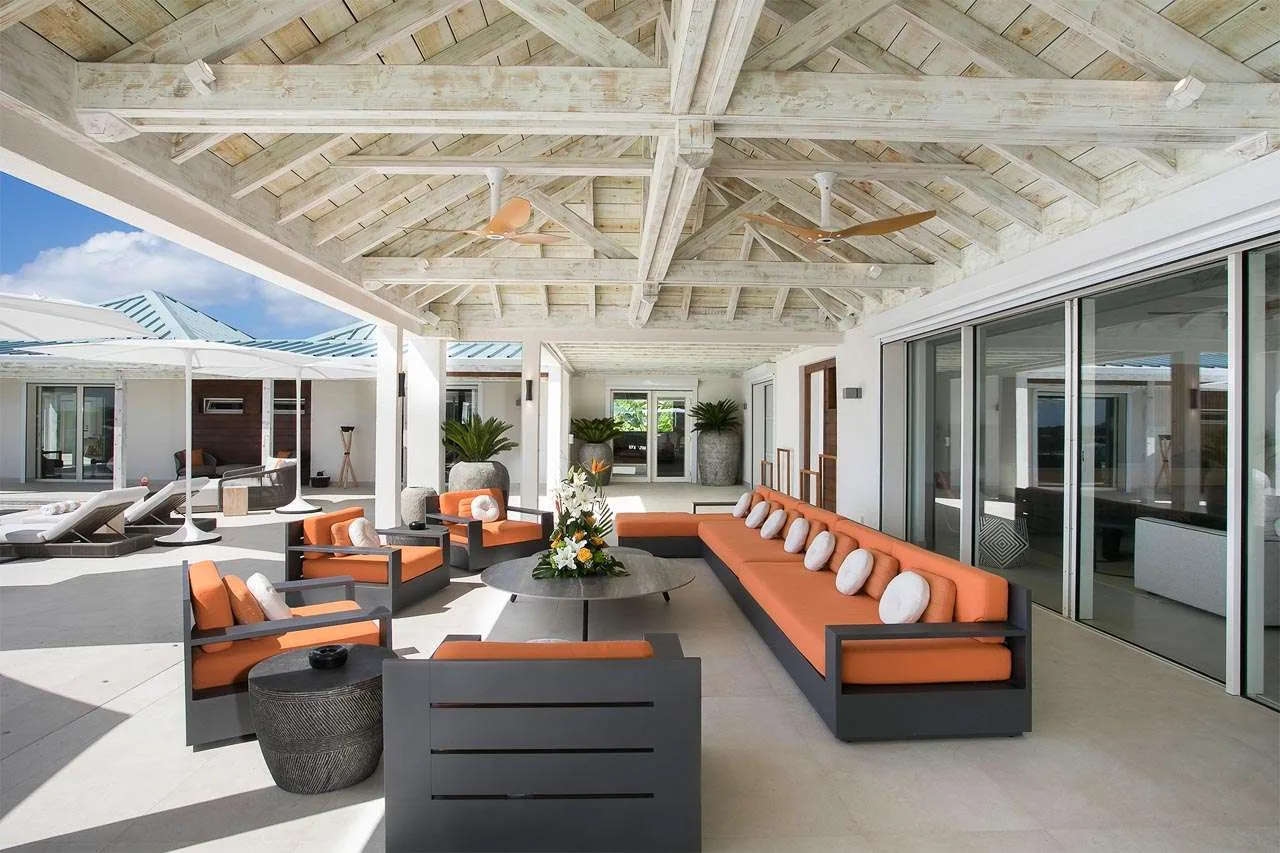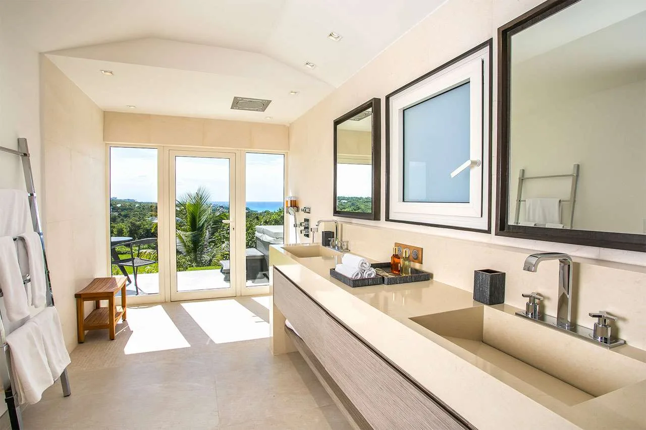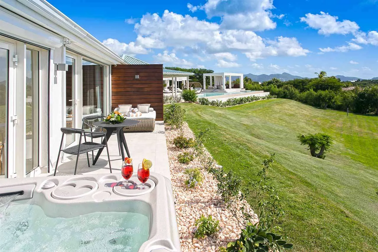 The doors open through to an immense indoor/outdoor living space with a sweeping 180-degree view over the ocean with Saba on the distant horizon and a lush verdant lawn in the foreground.