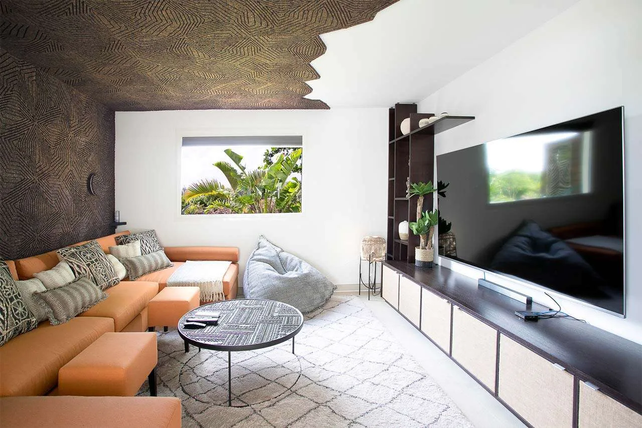 A contemporary African-themed decor pervades the beautiful interior and exterior spaces with furnishings by Manutti and Roche Bobois along with natural wood accents, touches of burnt orange and primitive art and textiles. Flanking the entrance the indoor areas include a stylish living and dining room and a TV viewing corner.