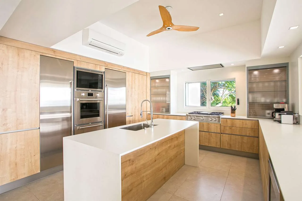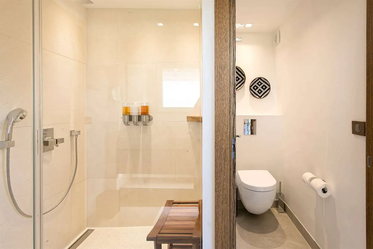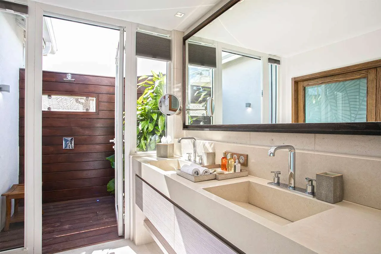 The beautiful king-size bedrooms have luxurious ensuite bathrooms each with double vanities, large open rain showers, an exterior ”garden” shower, and a separate toilet. Each bedroom is equipped with a Smart TV and a Bose soundbar with Bluetooth connectivity. Four of the five bedrooms have walk-in closets. The master suite also features a lounge area with a private terrace with a 3 person jacuzzi/hydro pool. The master suite and bedroom four are interconnected.
