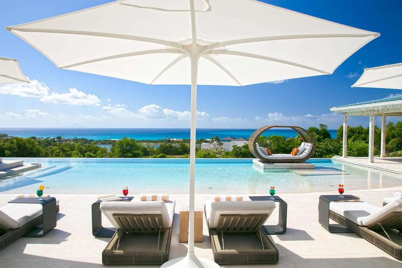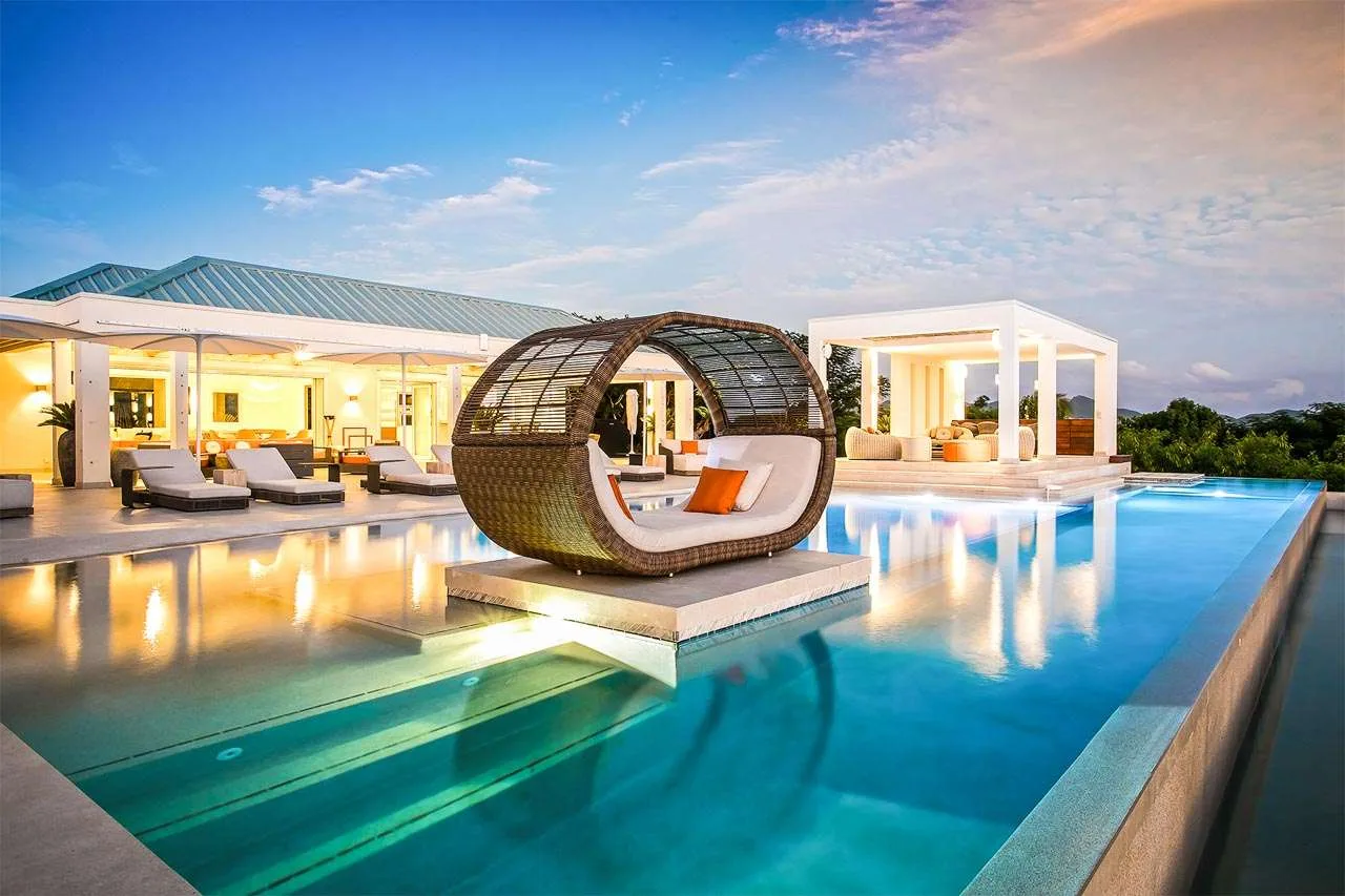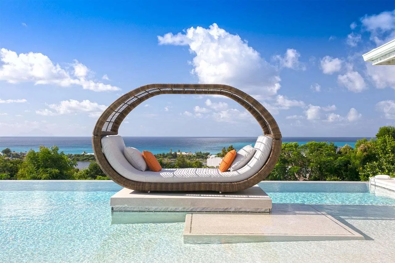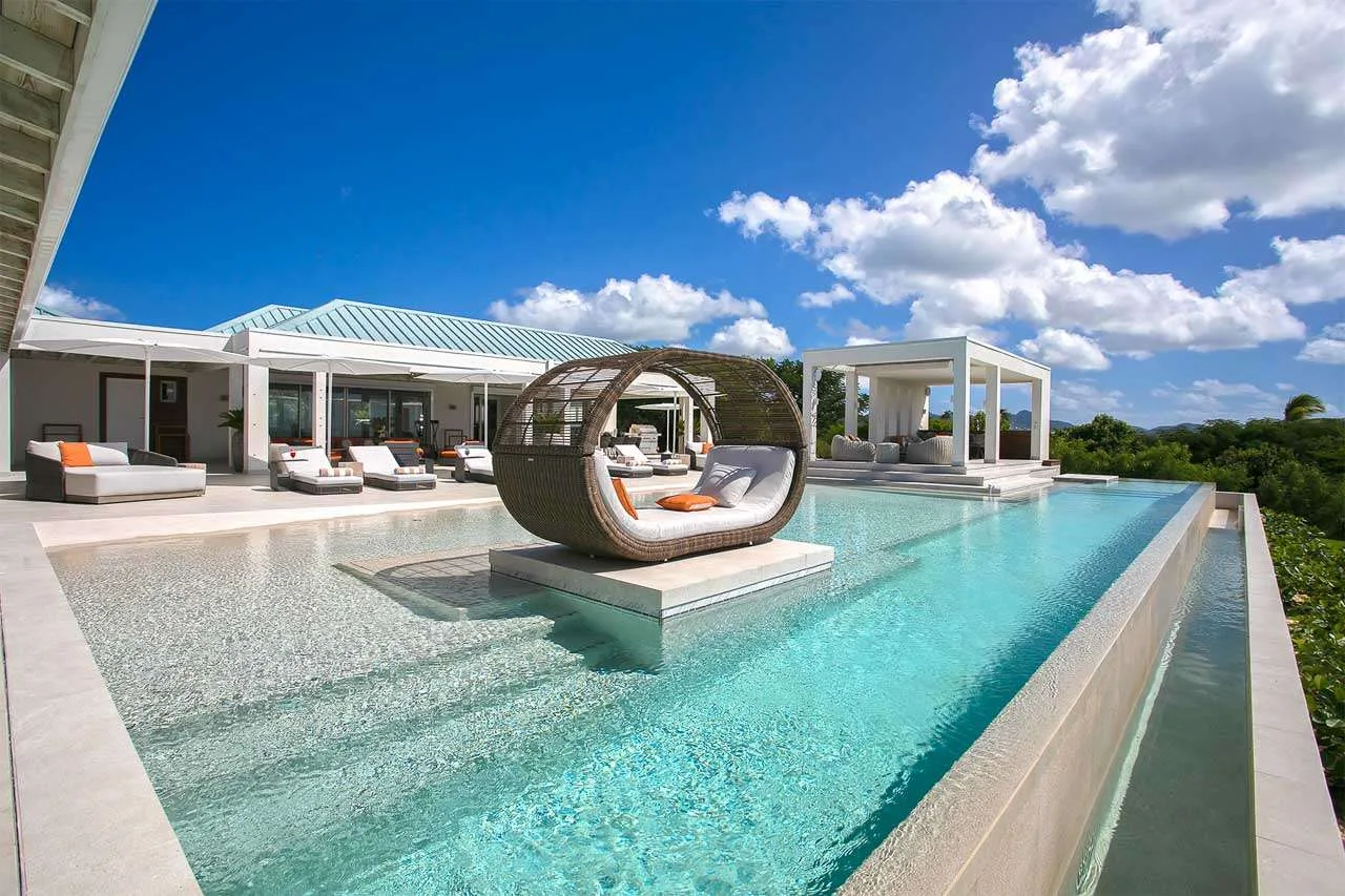 Enhancing the beautiful view are the clean architectural lines of a poolside gazebo and an L- shaped saltwater pool running the length of the terrace. The pool features a built-in table and seating area and an "island" day bed and can be accessed by a sloping beach or by steps leading from the gazebo. Beautiful light effects in the gazebo, from a signature leaf ceiling panel, along with plush seating and a wet bar provides the perfect spot to take in the beautiful Caribbean sunsets. Lining the pool are eight loungers and two daybeds and parasols offering further options for luxurious poolside lounging.