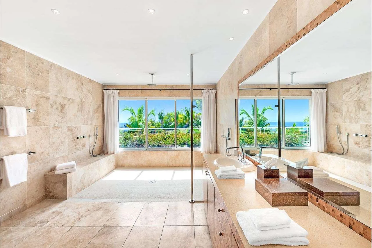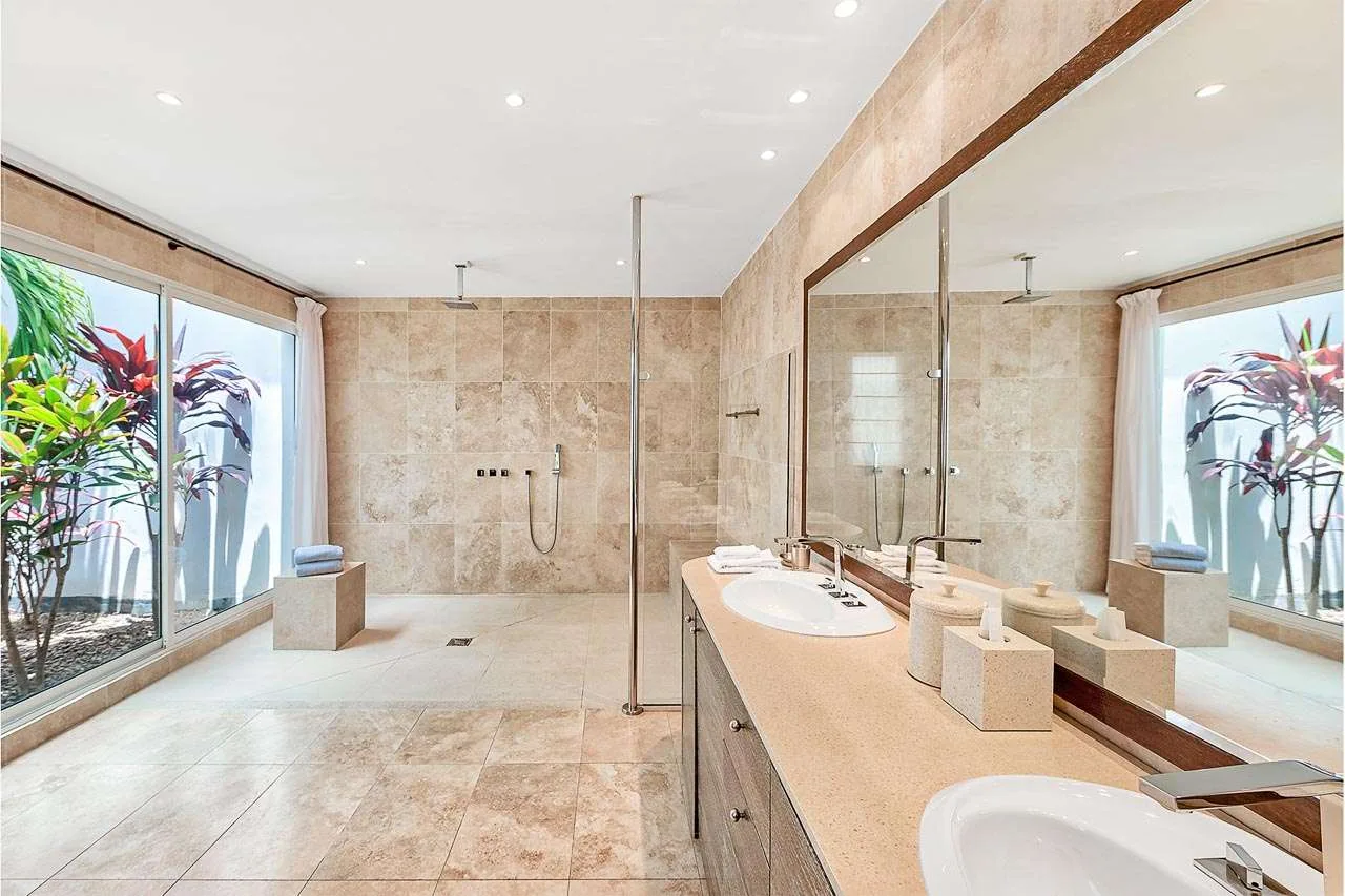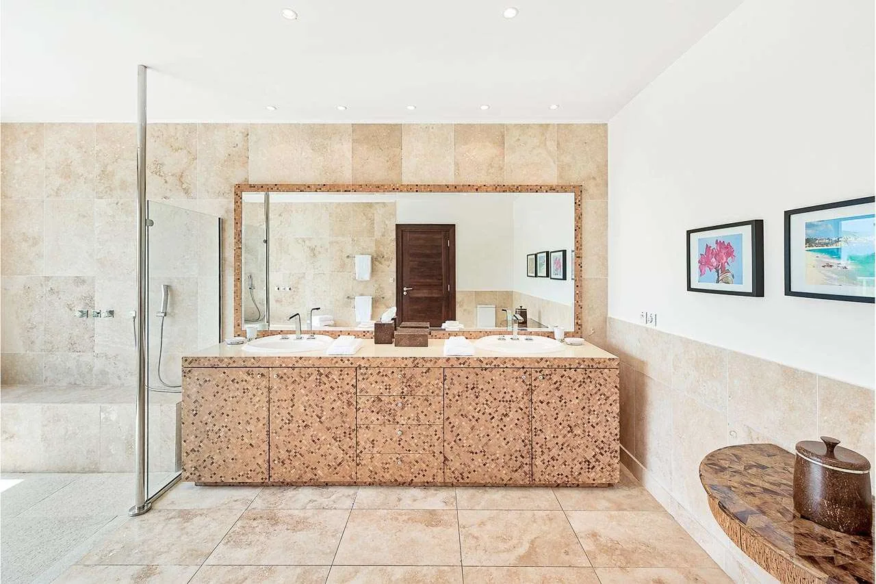 Floor to ceiling doors disappear into the wall providing unobstructed views and breezes. Sand color travertine tiles flow seamlessly from indoors to outdoors. Gorgeous designer furniture detailed in beautiful dark woods, comfortable upholstered seating and tasteful art create a relaxing interior lounging area. The color scheme is relaxing in cream, off white and taupe. The sleek and stylish open plan kitchen is open to the view and the exterior dining room, while the barbeque is adjacent to the kitchen. Throughout the villa, pots filled with tropical plants dot the terraces creating a Feng shui attitude.