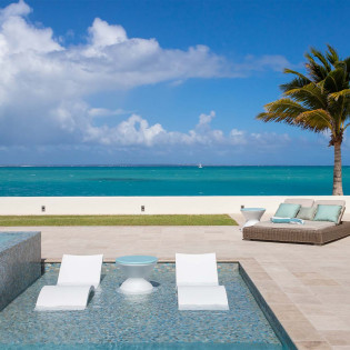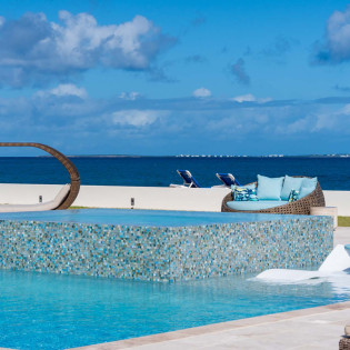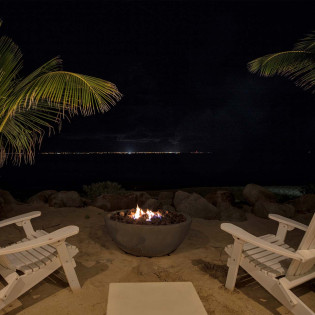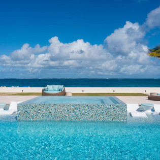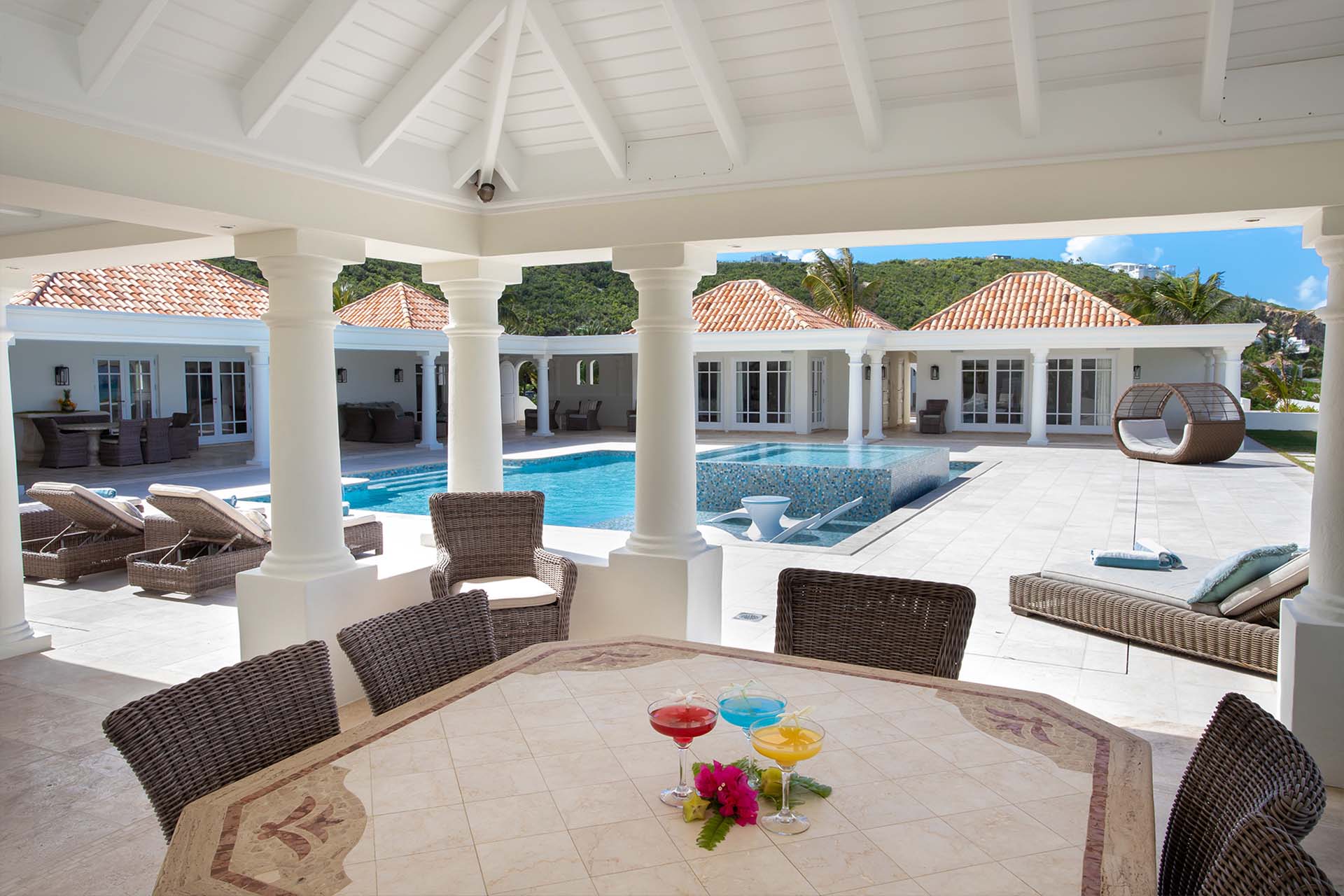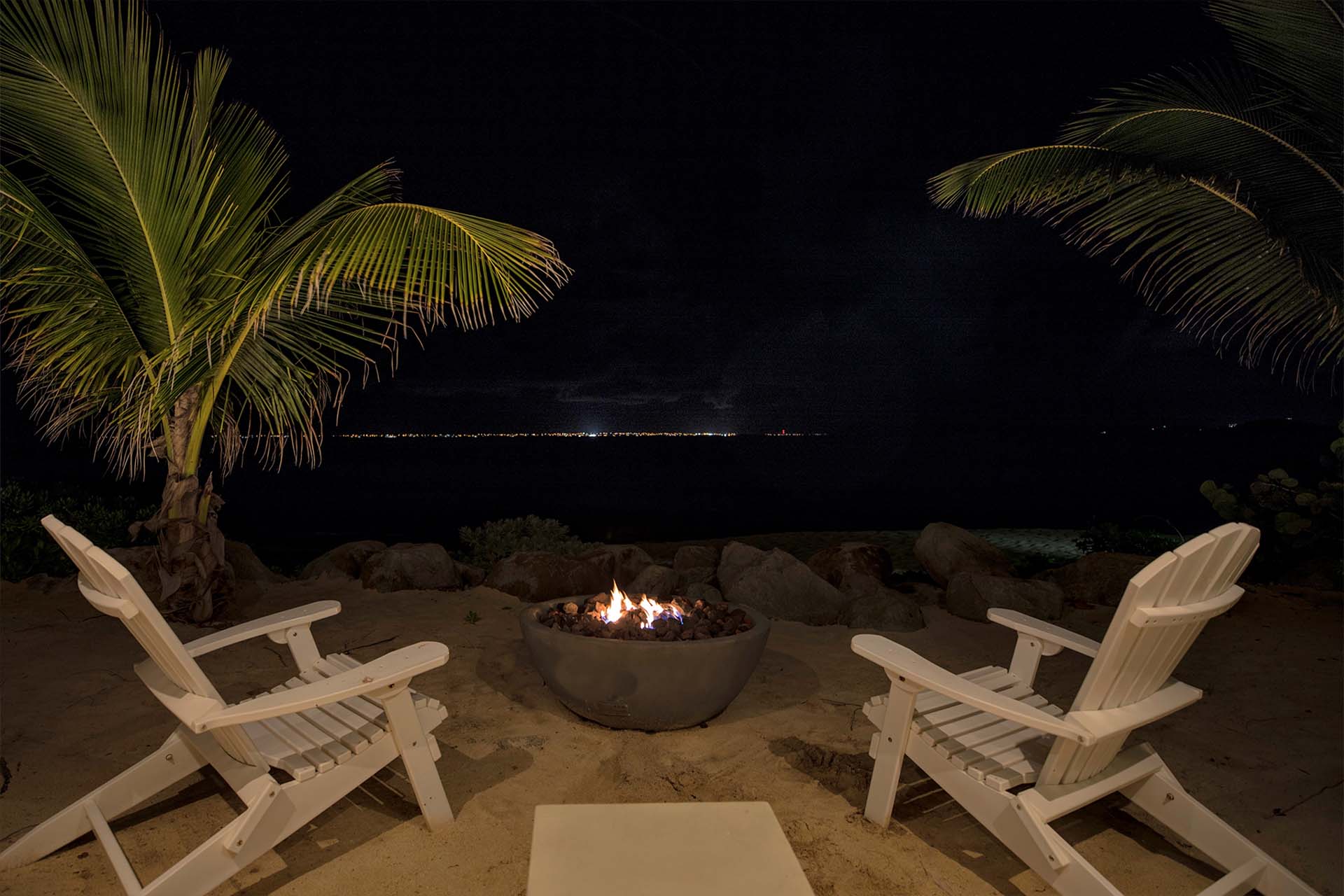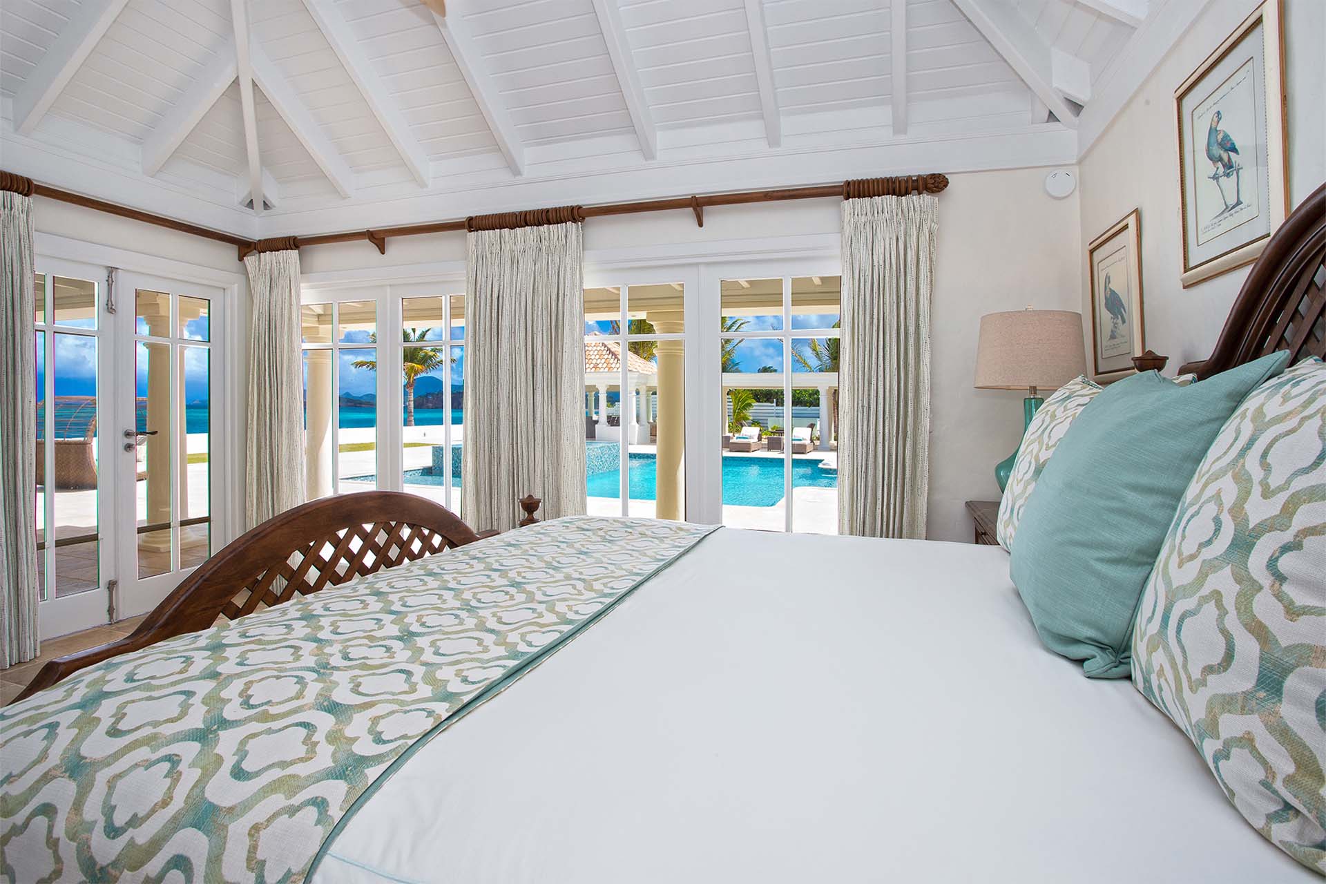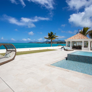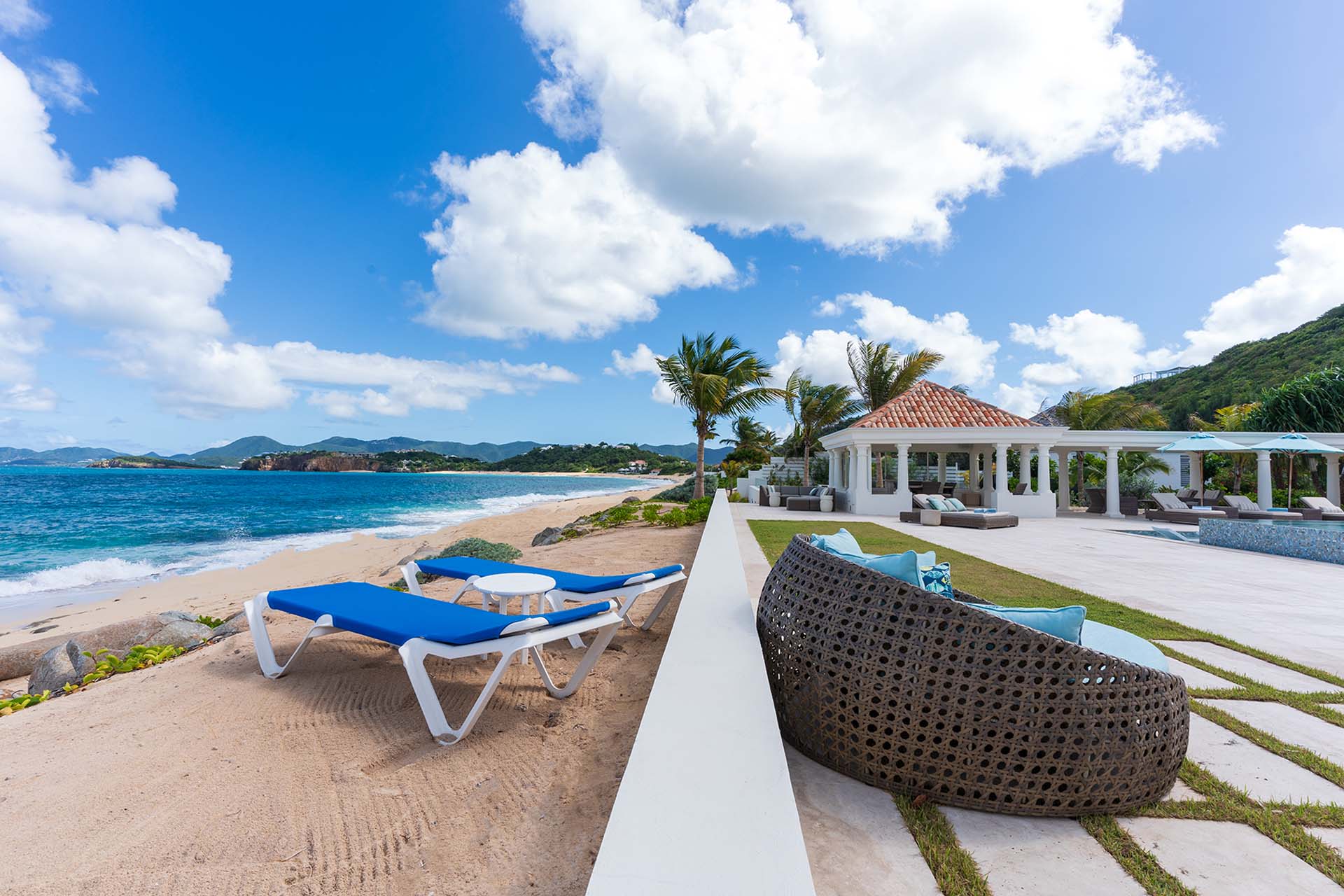 Upon reaching the main terrace, which is surrounded by beautifully decorated rooms, you'll be greeted by breathtaking views of the sea. The terrace is only a few steps away from the shoreline, allowing you to enjoy the mesmerizing seascape during the day and the romantic lights of nearby Anguilla at night. The centerpiece of the terrace is an exquisite, heated pool adorned with a glass mosaic trim and a raised hot tub. In-pool sundecks and comfortable in-water loungers offer the ultimate sunbathing experience, while plush daybeds and loungers on the beach provide additional options for sun-seekers. For those seeking shade, a poolside gazebo with an al fresco dining area and ceiling fan offers a delightful retreat. The villa's covered veranda also provides cool seating and dining areas along with a half bath.