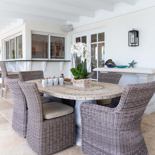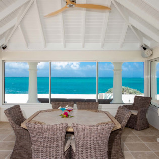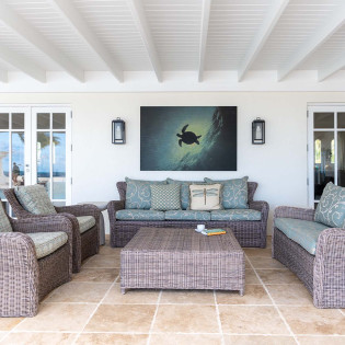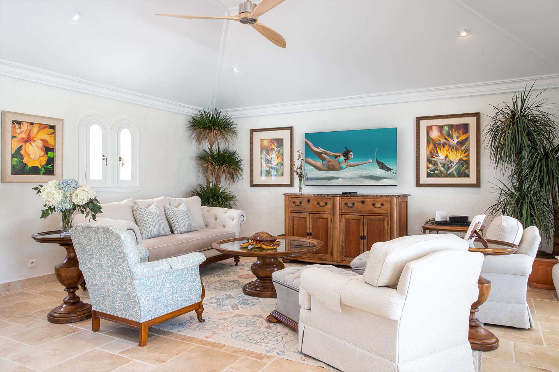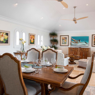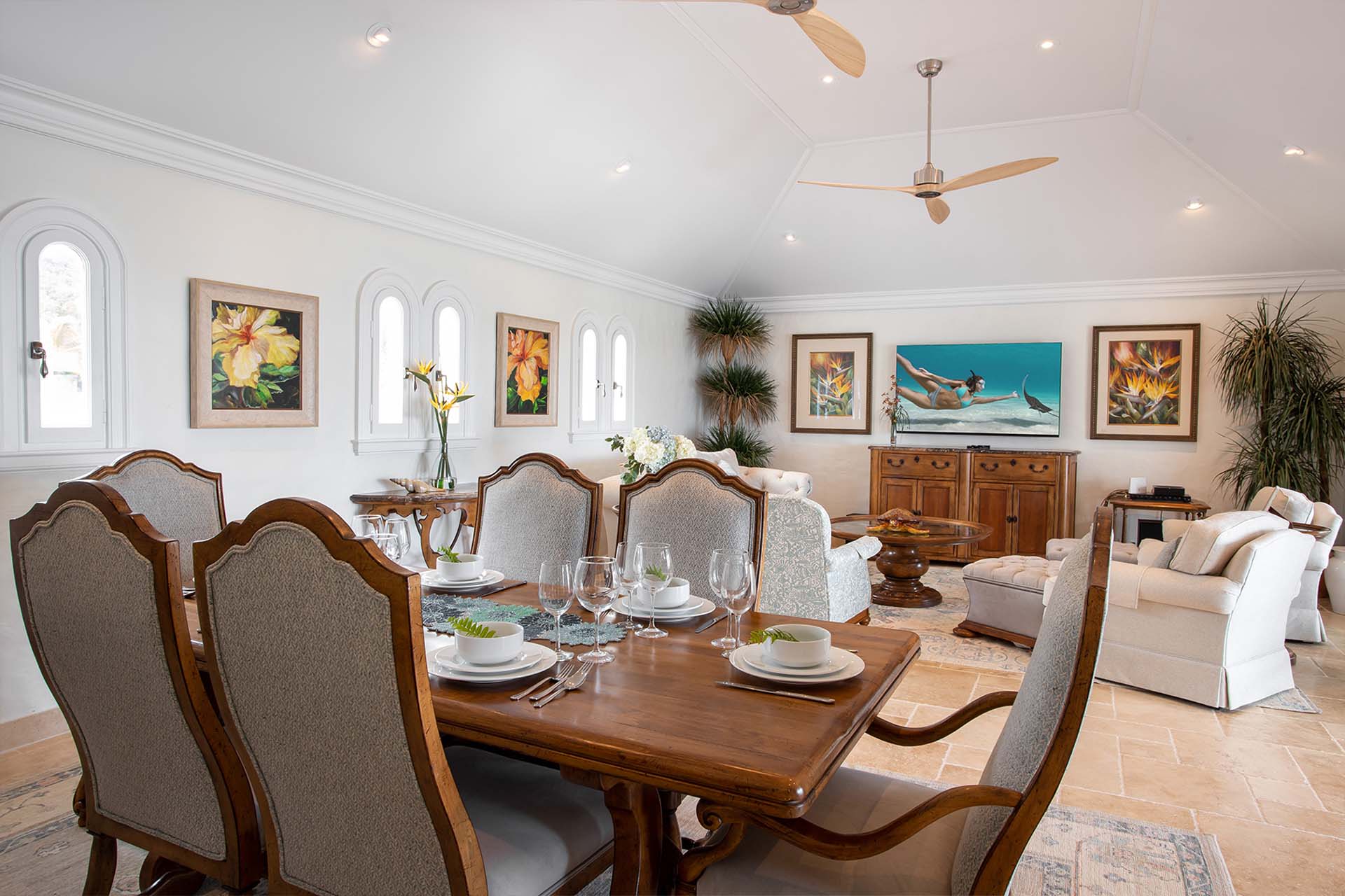 The indoor spaces are as comfortable and well-designed as the outdoor seating areas. With vaulted ceilings, soothing natural colors, and elegant furnishings, the fully air-conditioned interior creates a relaxing ambiance. The great room features a tavola table for indoor dining, a cozy sofa, and a 65” smart television for entertainment. French doors open to the ocean view and provide easy access to the covered veranda and pool terrace.