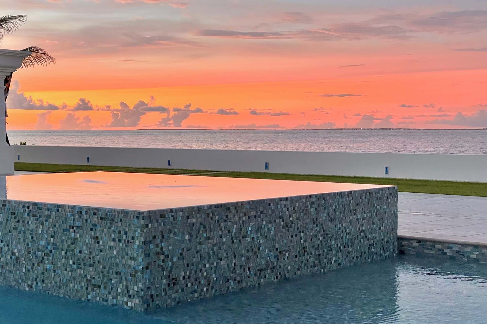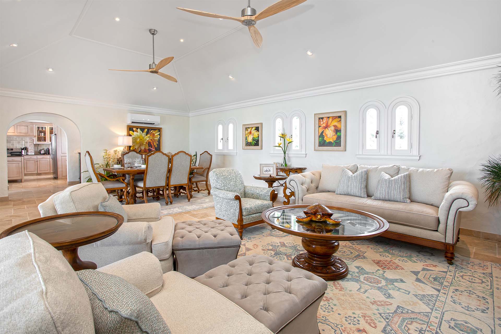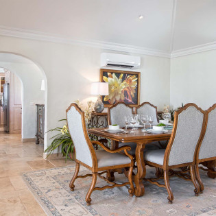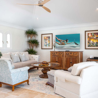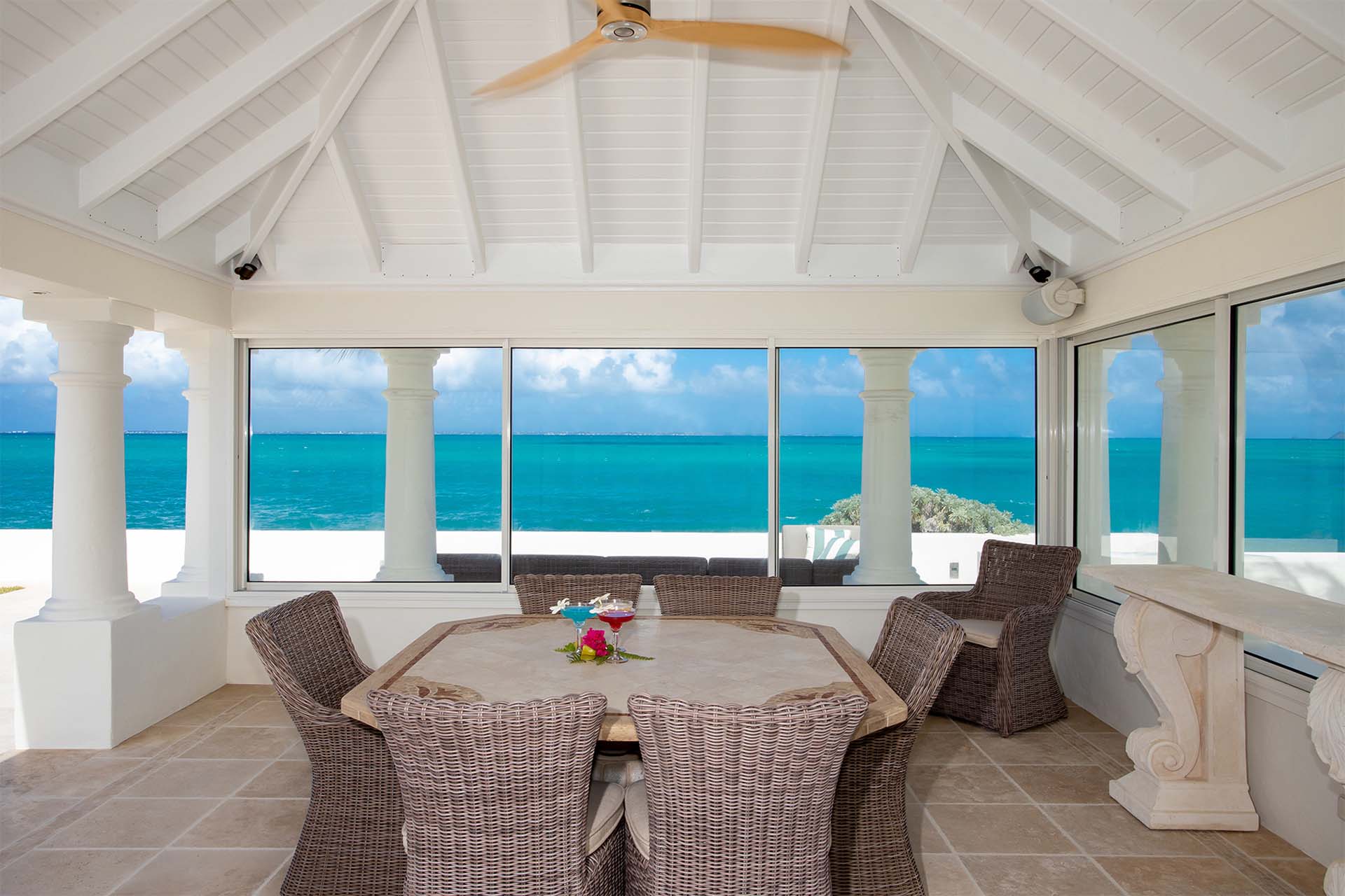 The indoor spaces are as comfortable and well-designed as the outdoor seating areas. With vaulted ceilings, soothing natural colors, and elegant furnishings, the fully air-conditioned interior creates a relaxing ambiance. The great room features a tavola table for indoor dining, a cozy sofa, and a 65” smart television for entertainment. French doors open to the ocean view and provide easy access to the covered veranda and pool terrace.