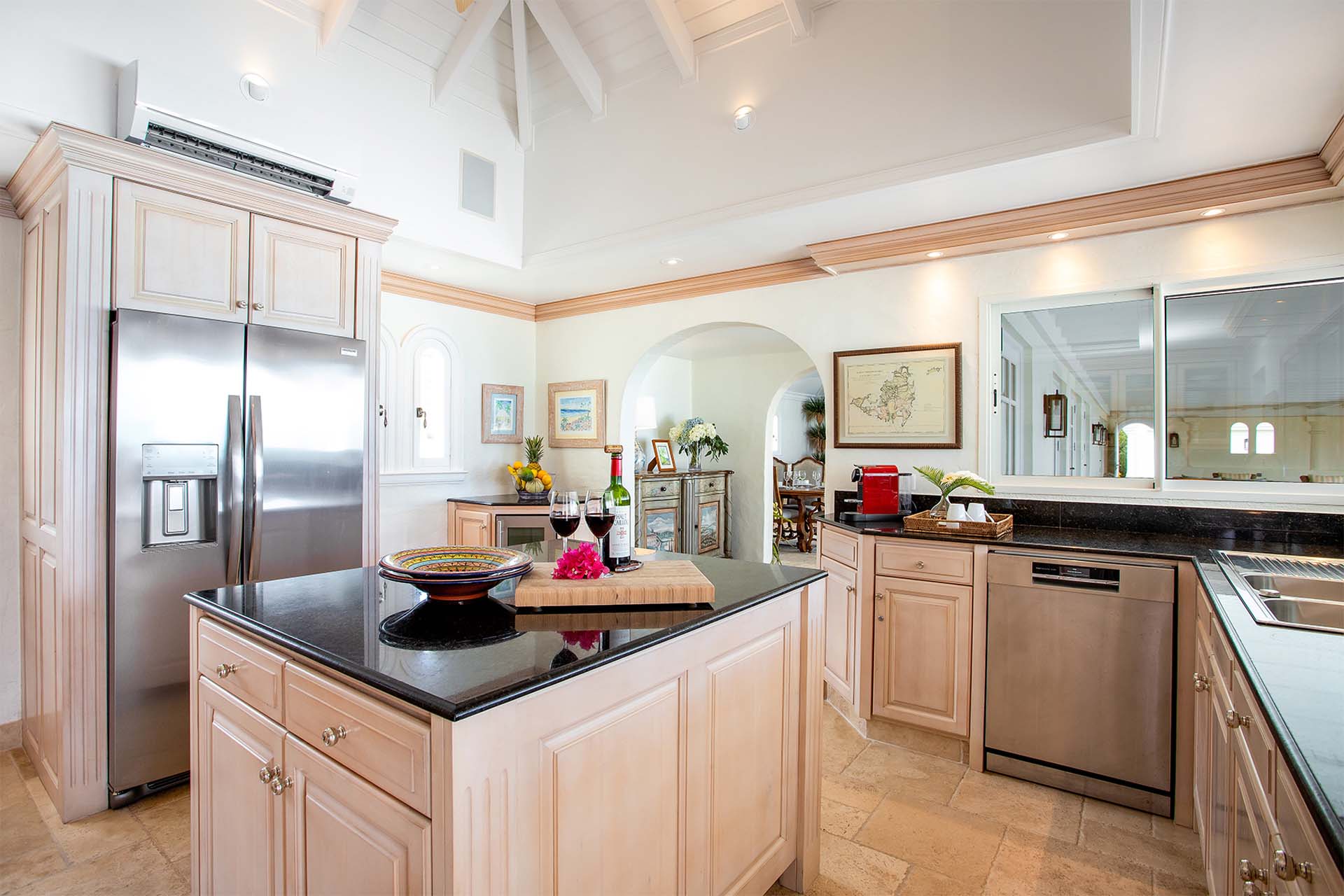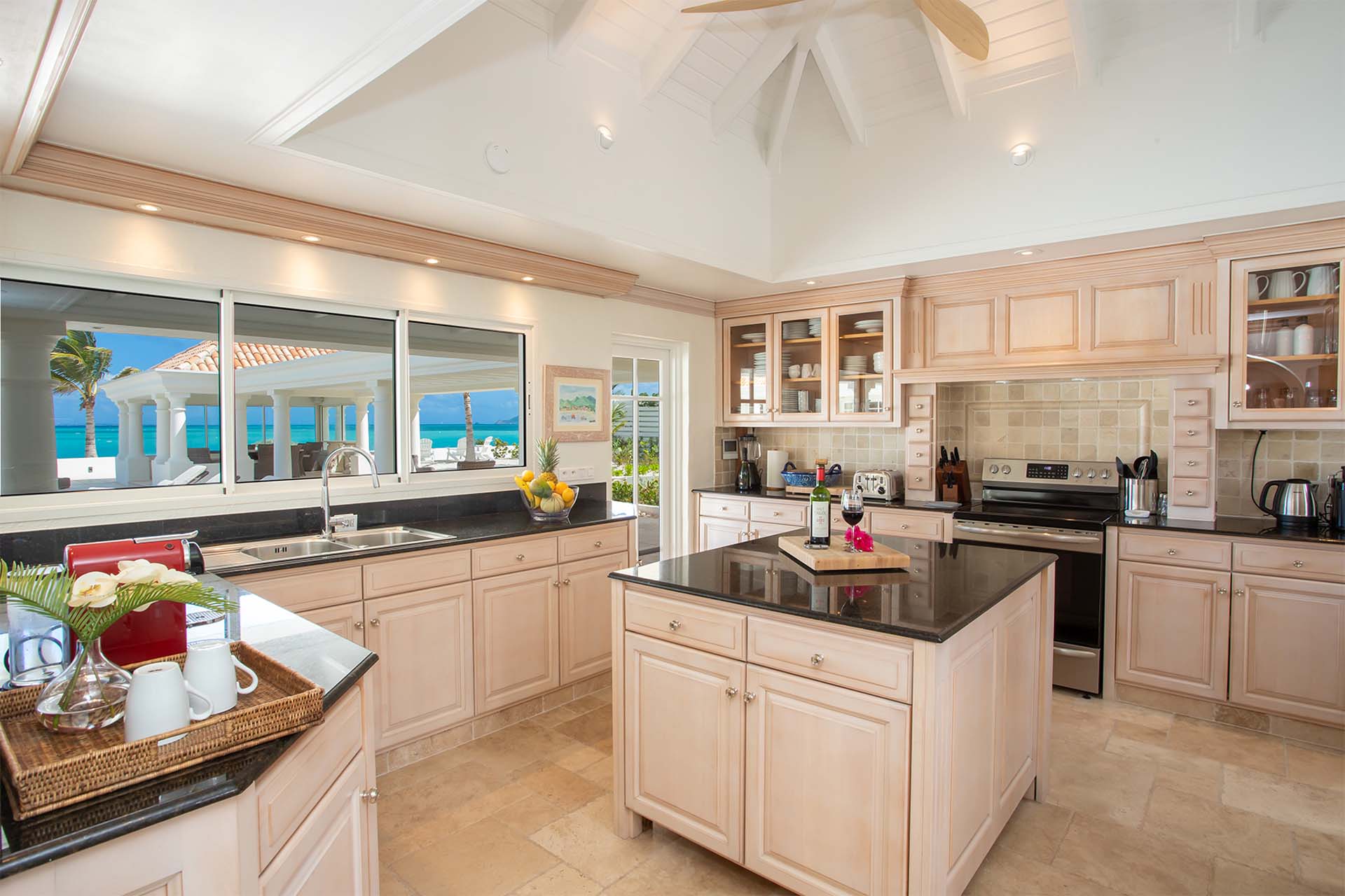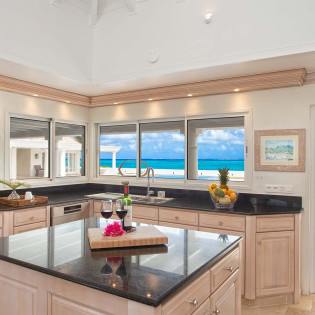 The well-equipped gourmet kitchen enjoys the same ocean vista and features a center island, black marble countertops, stainless steel appliances, and sliding windows that open to a breakfast bar on the terrace.