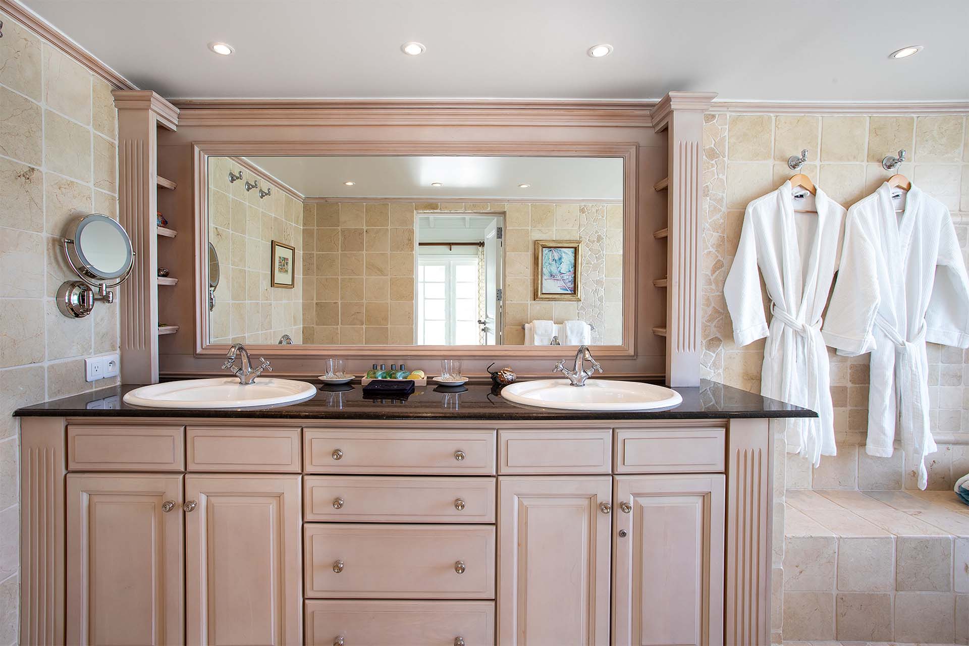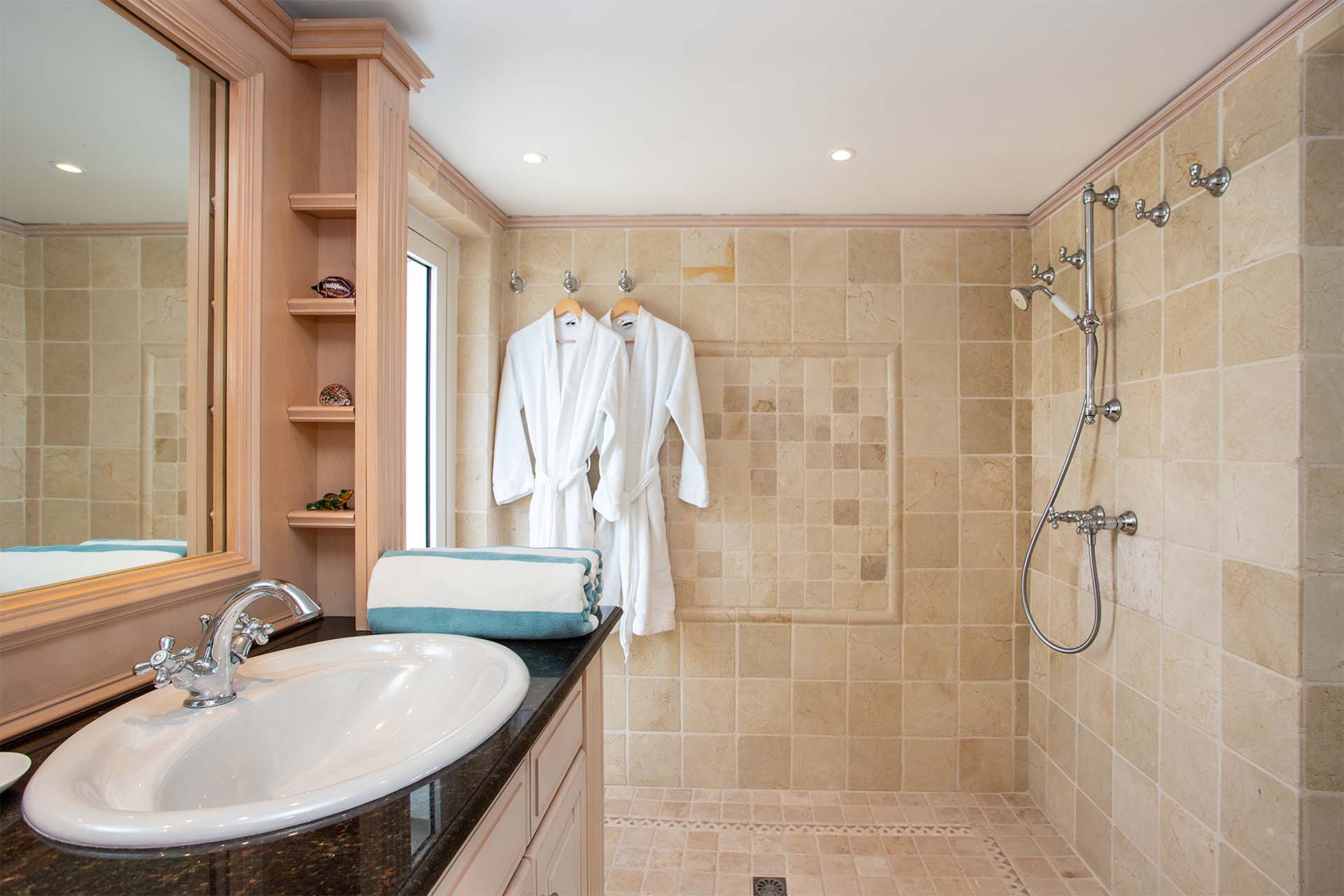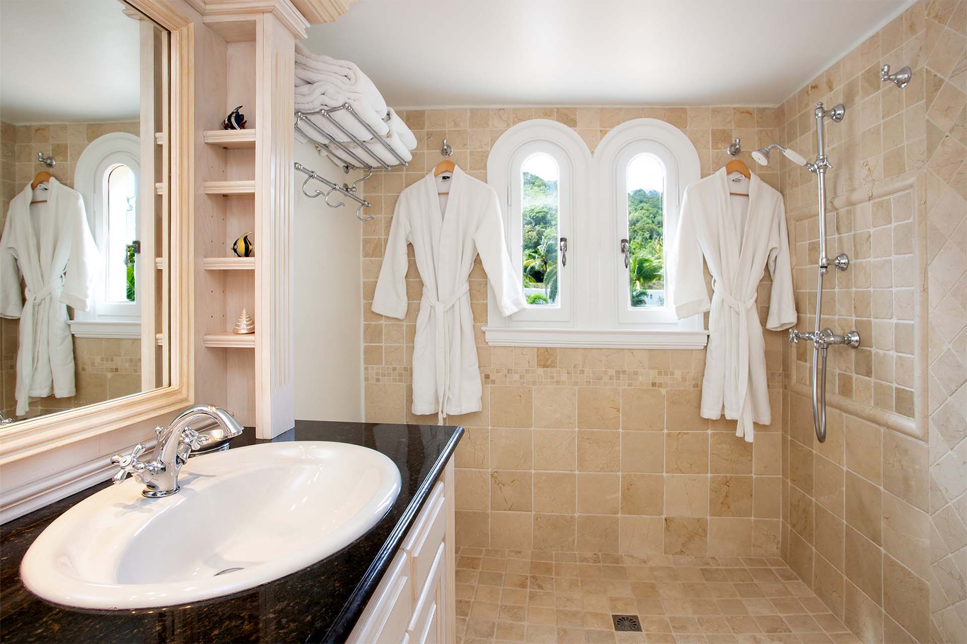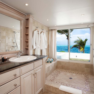 The villa comprises three ensuite master bedrooms, each offering a private and romantic escape. With king-size beds, luxurious bed linens, and sea views, these rooms ensure a comfortable stay. Each bedroom is equipped with a Sony smart television, air conditioning, ceiling fan, and a walk-in closet. The ensuite bathrooms boast double sink vanities, lighted make-up mirrors, and spacious open showers.
