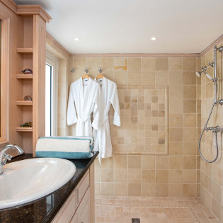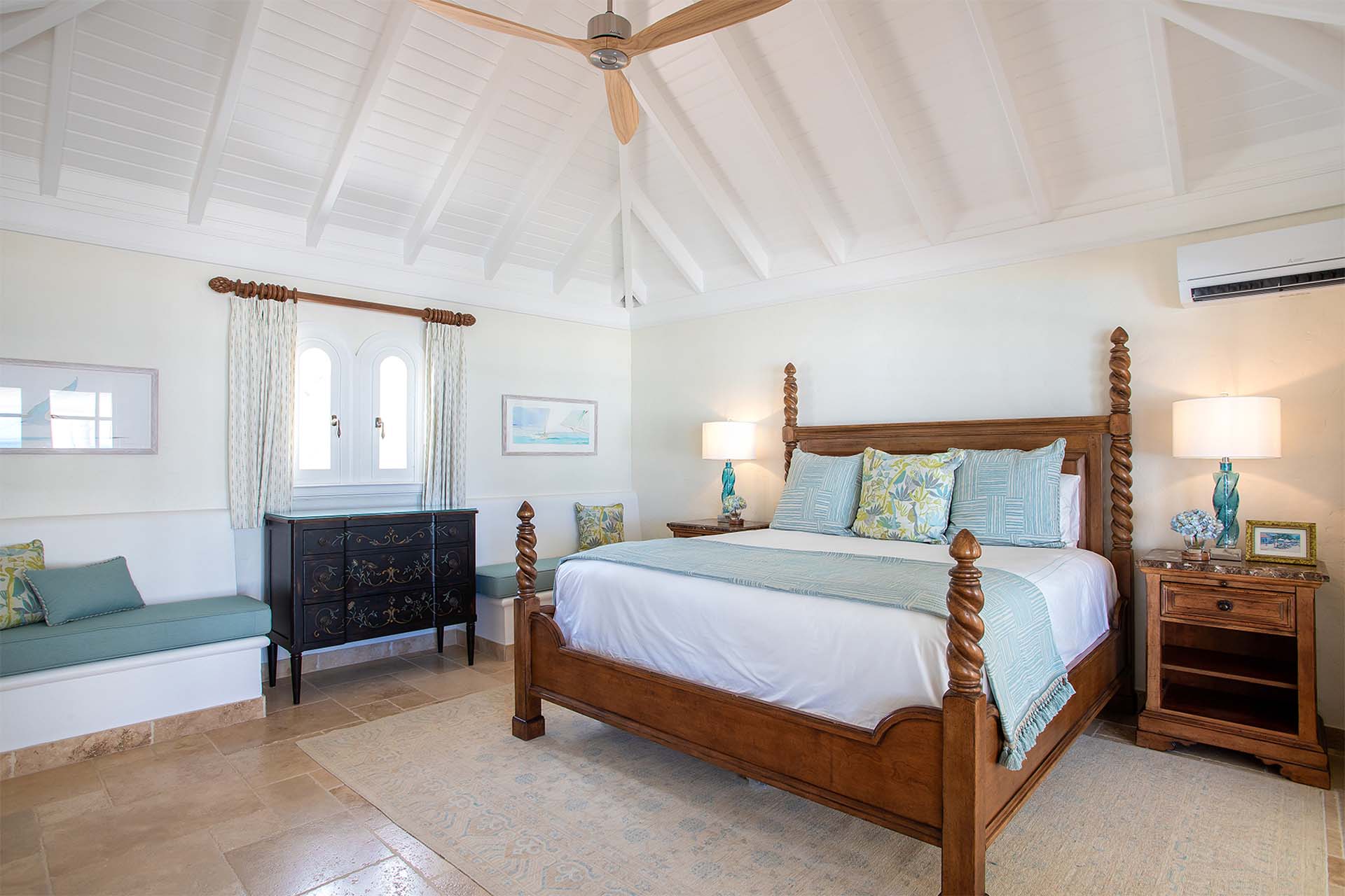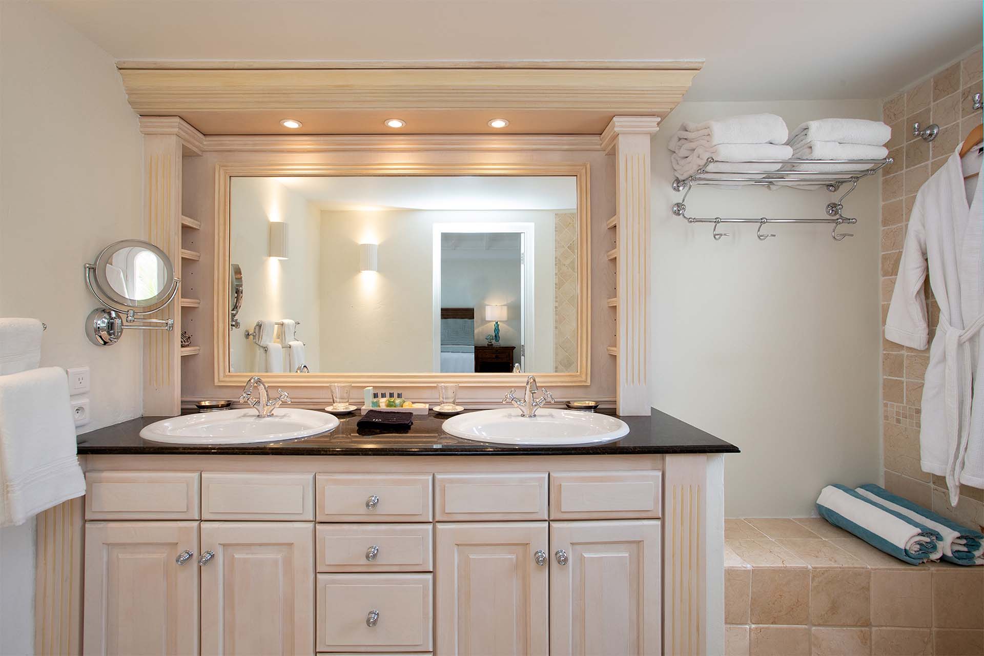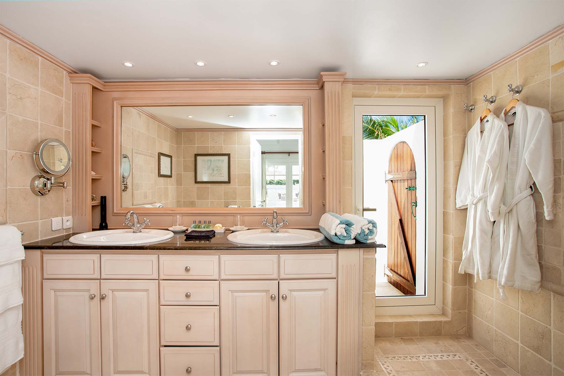The villa comprises three ensuite master bedrooms, each offering a private and romantic escape. With king-size beds, luxurious bed linens, and sea views, these rooms ensure a comfortable stay. Each bedroom is equipped with a Sony smart television, air conditioning, ceiling fan, and a walk-in closet. The ensuite bathrooms boast double sink vanities, lighted make-up mirrors, and spacious open showers.