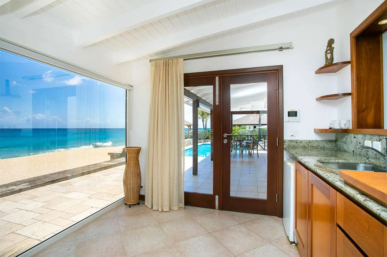 Large glass sliding doors open out to a large, covered, beach front terrace with additional seating and a large dining table. The inviting seafront gazebo offers an additional dining option. A brand new kitchen has lovely ocean views from the breakfast bar and offers high quality appliances including an induction oven and wine cooler.