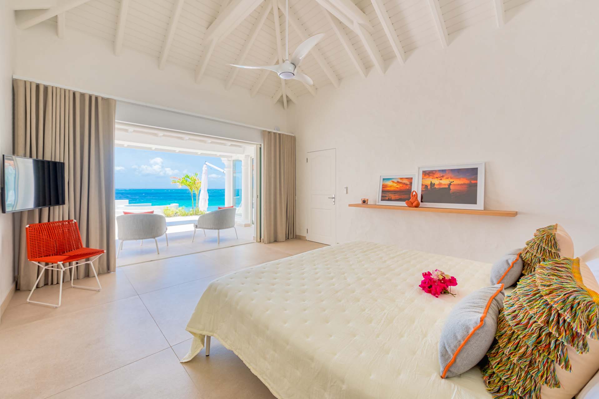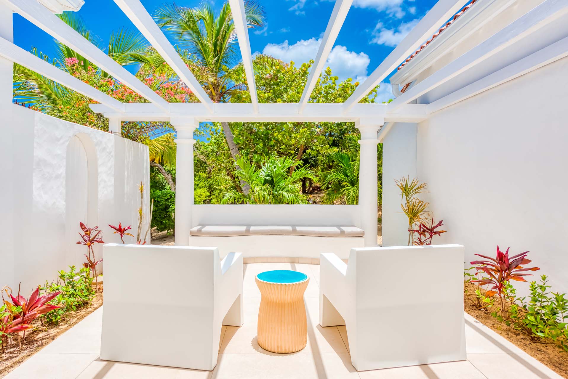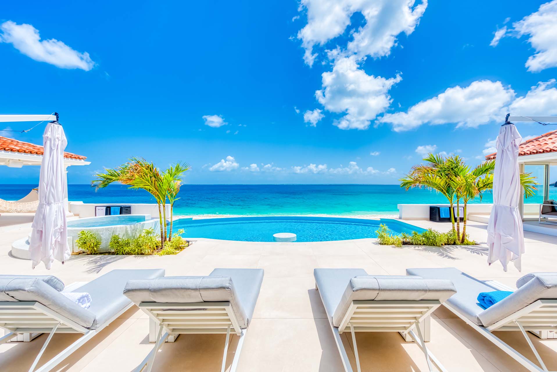 Each of the two equally sized bedrooms flanks the pool and is luxuriously appointed with features such as remote-controlled blackout shades, pop-up TVs, and premium king-size mattresses. Both offer private ensuite bathrooms. One bedroom opens to a secluded courtyard, while the other boasts unobstructed ocean views for a more dramatic setting.