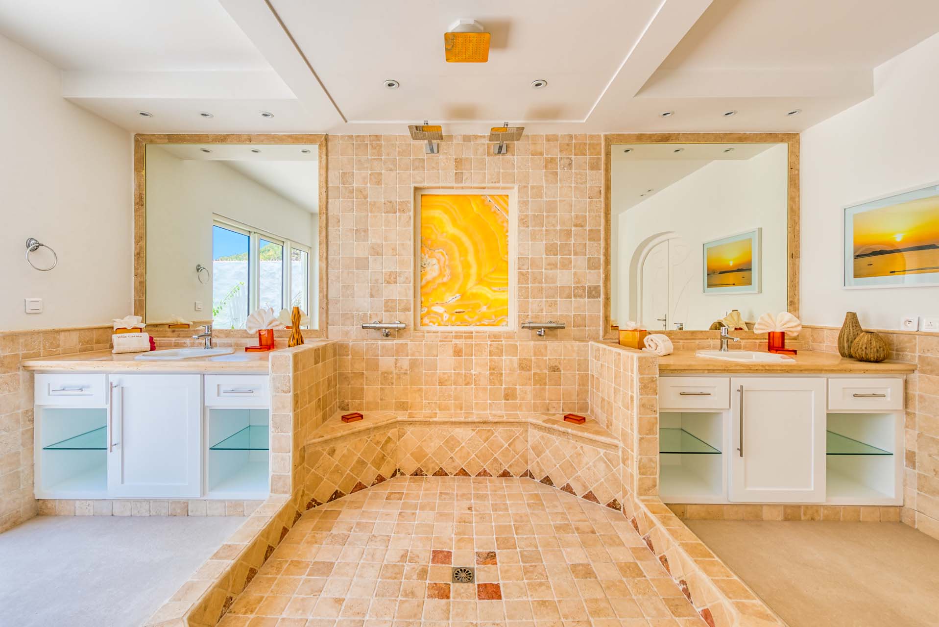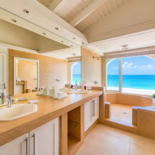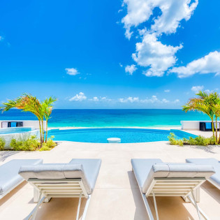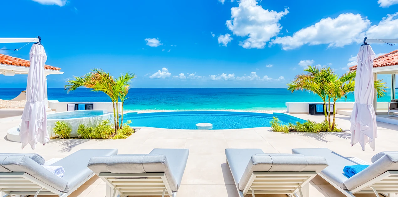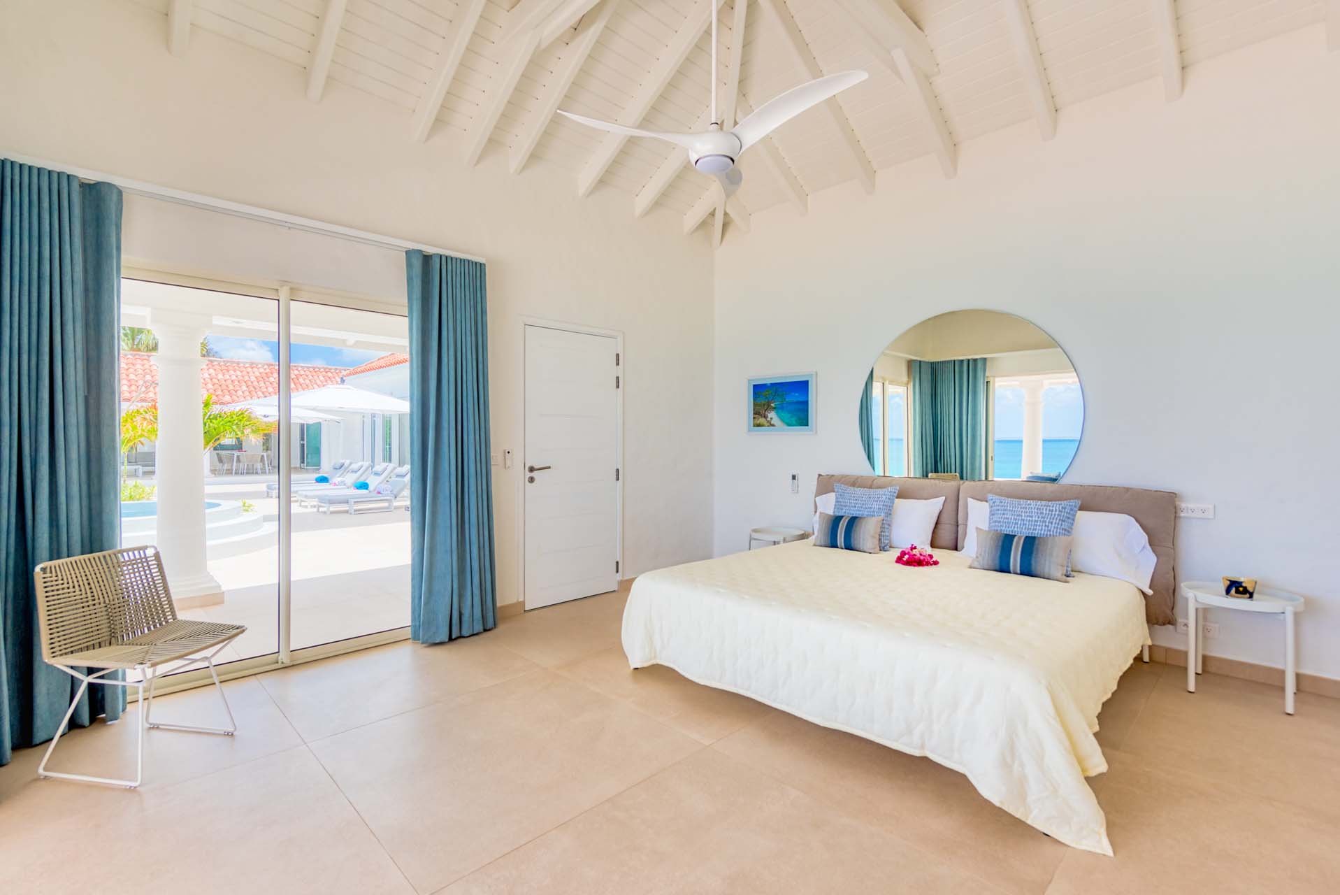 Each of the two equally sized bedrooms flanks the pool and is luxuriously appointed with features such as remote-controlled blackout shades, pop-up TVs, and premium king-size mattresses. Both offer private ensuite bathrooms. One bedroom opens to a secluded courtyard, while the other boasts unobstructed ocean views for a more dramatic setting.