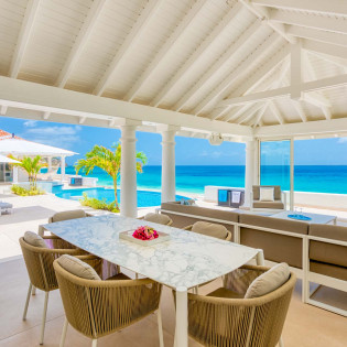 Blending soft contemporary elegance with a touch of Caribbean flair, this retreat is a favorite among guests seeking style and comfort. In the living room, plush cushioned sofas are positioned to take full advantage of the breathtaking scenery framed by a wall of expansive windows. The gourmet kitchen is fully-equipped with upscale amenities, ensuring effortless indoor-outdoor entertaining. Just beyond, a covered dining terrace invites leisurely al fresco meals while enjoying the ocean breeze and panoramic bay views.