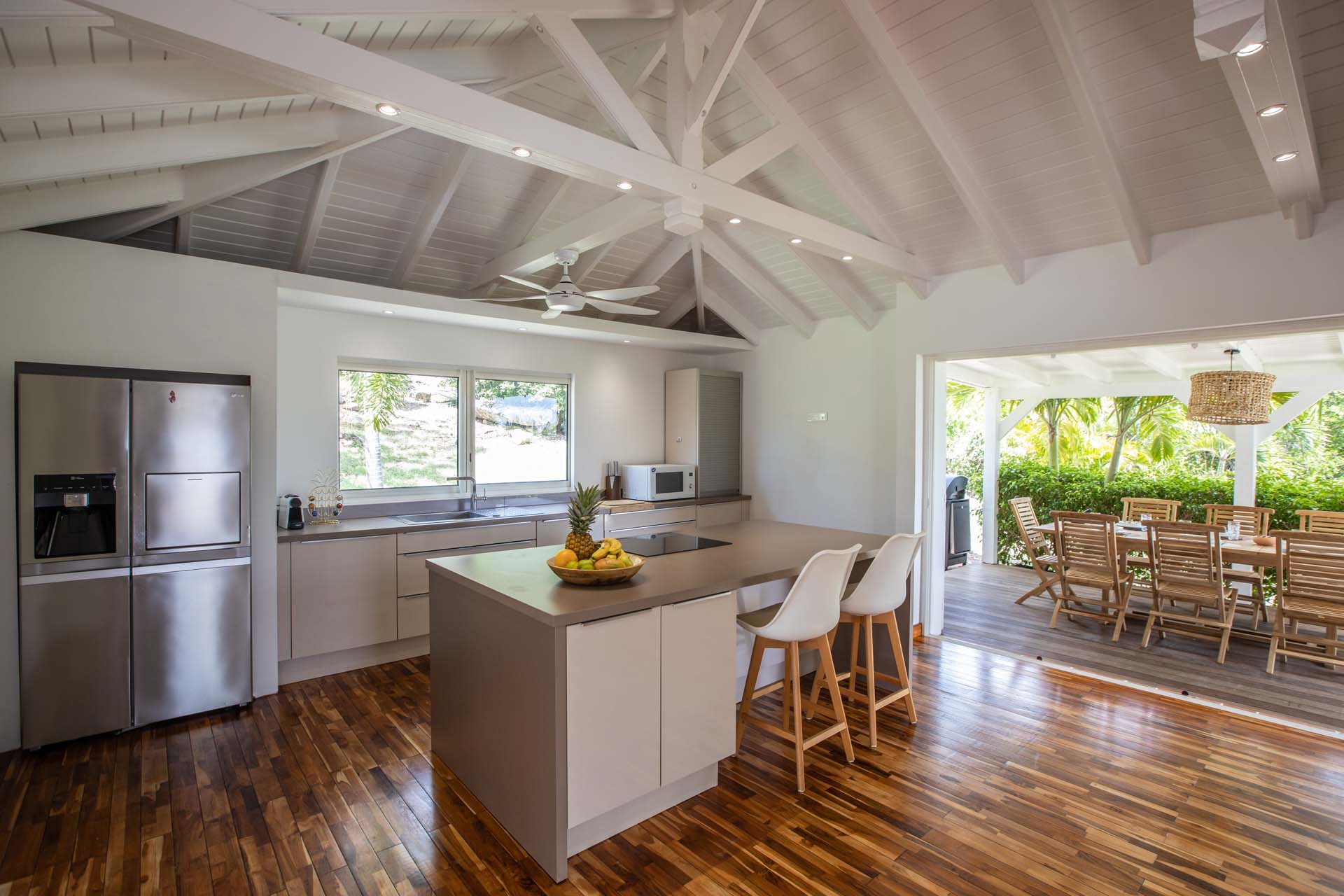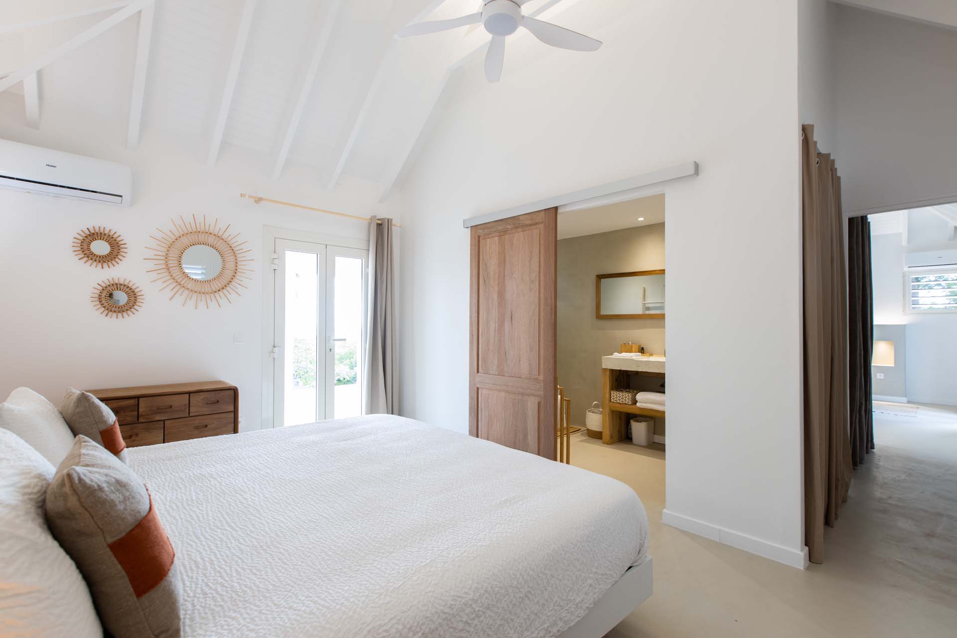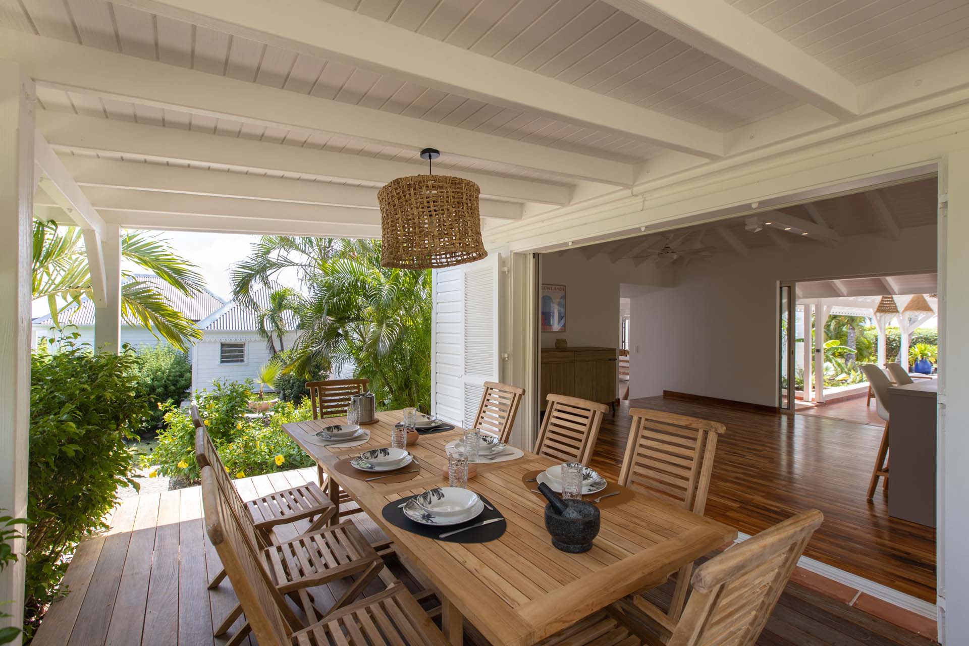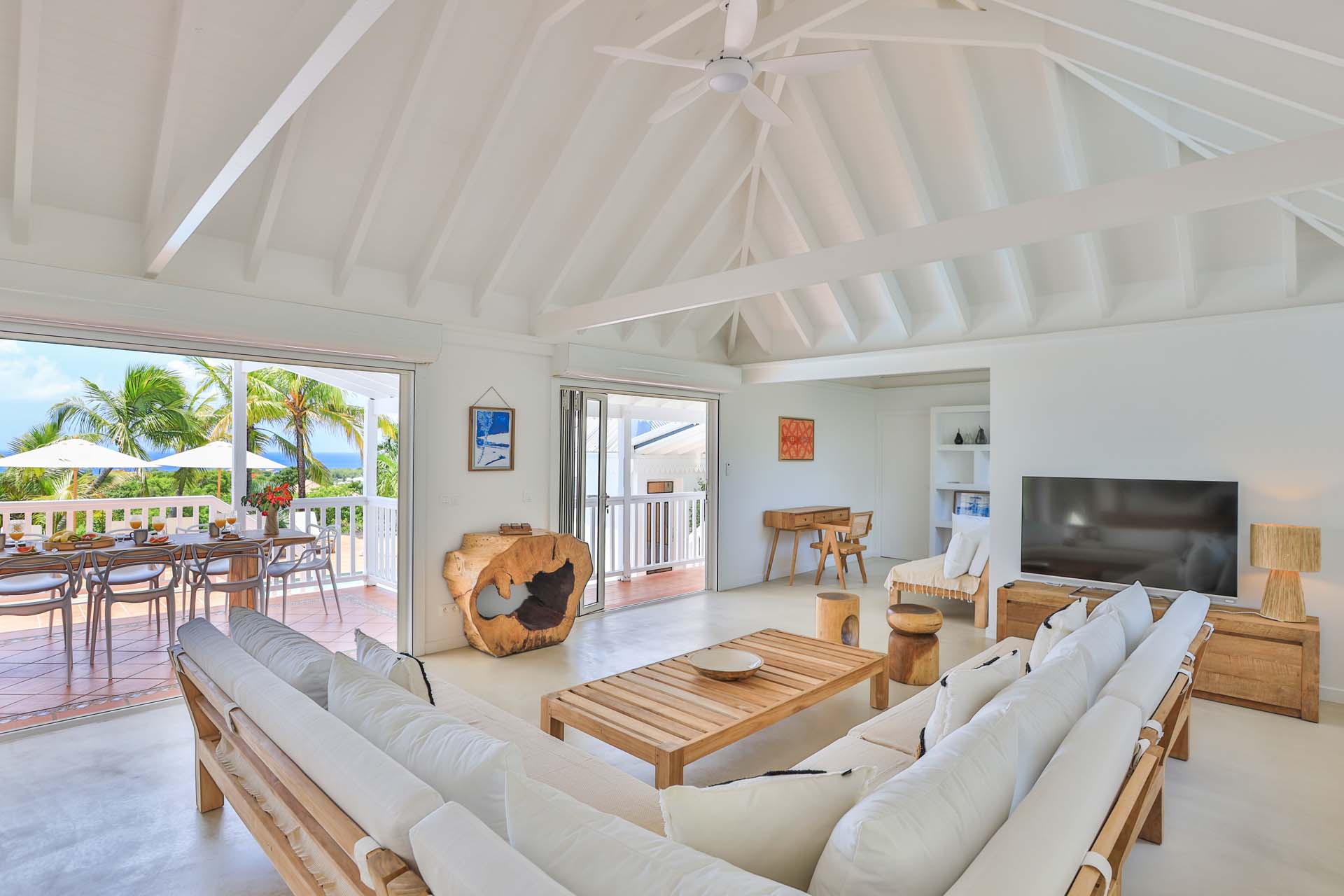 Upon stepping into Villa Coco Paillette, guests are immediately struck by the villa's contemporary Caribbean chic design. The interiors have been meticulously crafted to harmonize with the natural beauty of the surroundings. Vaulted ceilings, an open floor plan, and large glass doors seamlessly blend indoor and outdoor living, inviting the island's gentle breezes and sunlight to permeate every corner.