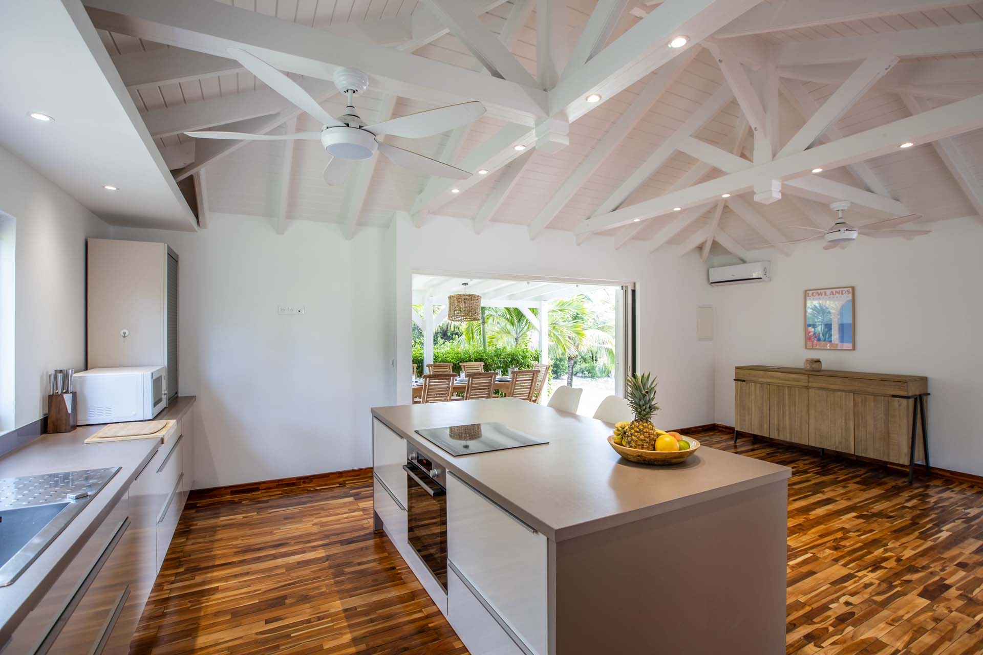 The heart of Villa Coco Paillette lies in its inviting common areas. A well-appointed gourmet kitchen is a chef's dream, equipped with top-of-the-line appliances and an expansive island. The adjacent dining area features a sleek table that comfortably seats eight, perfect for enjoying delicious meals prepared by a private chef or self-catering.