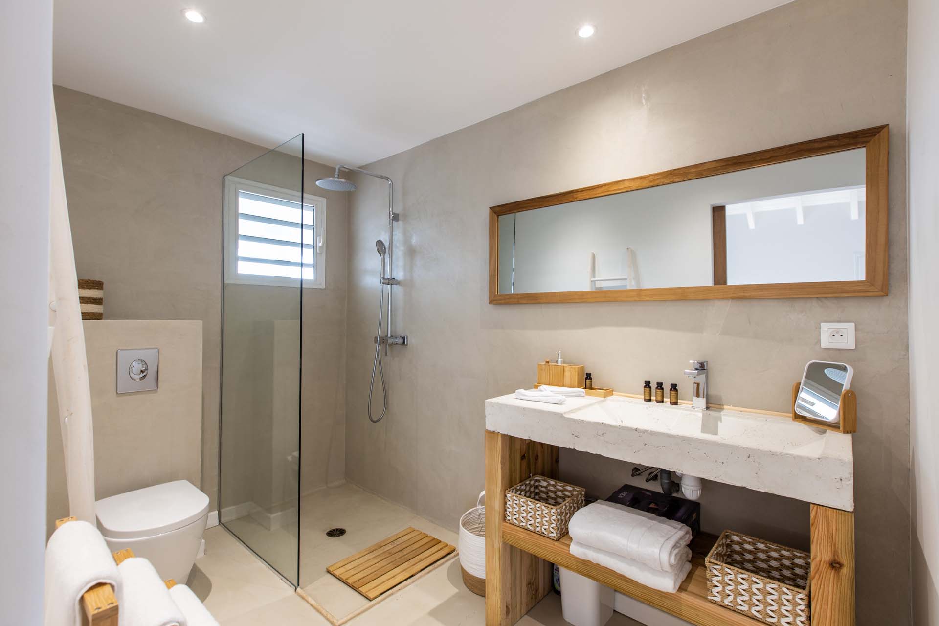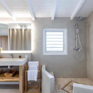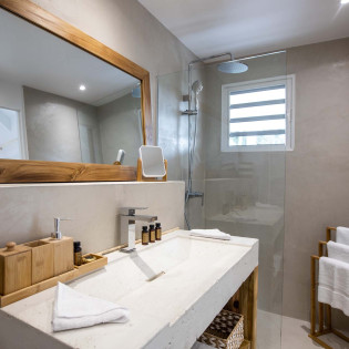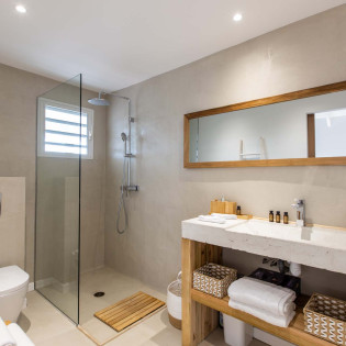 The villa’s thoughtfully designed bedrooms, two of them are connected, making it an ideal choice for families or close-knit groups. The master suite is a haven of luxury,  with a king-sized bed, overlooking the pool, and an ensuite bathroom with a rain shower. The remaining three bedrooms offer plush accommodations for guests, ensuring everyone enjoys comfort and privacy.