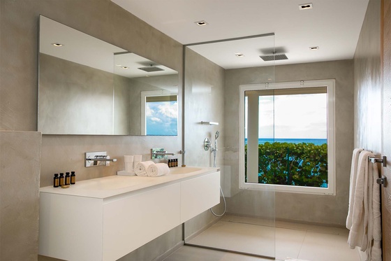 Two of the bedrooms feature king-size beds with ensuite bathrooms and can be accessed from the villa's interior. The third bedroom features twin beds that can be turned into king-size beds and has an ensuite bathroom and an independent entrance from the terrace.