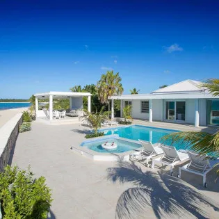 A terrace with loungers surrounds the chlorine-free pool. At one end of the pool is a gazebo, which houses a cushioned lounge area and dining area with seating for 4 guests. At the other end of pool is an umbrella-covered dining area with seating for 6 guests.