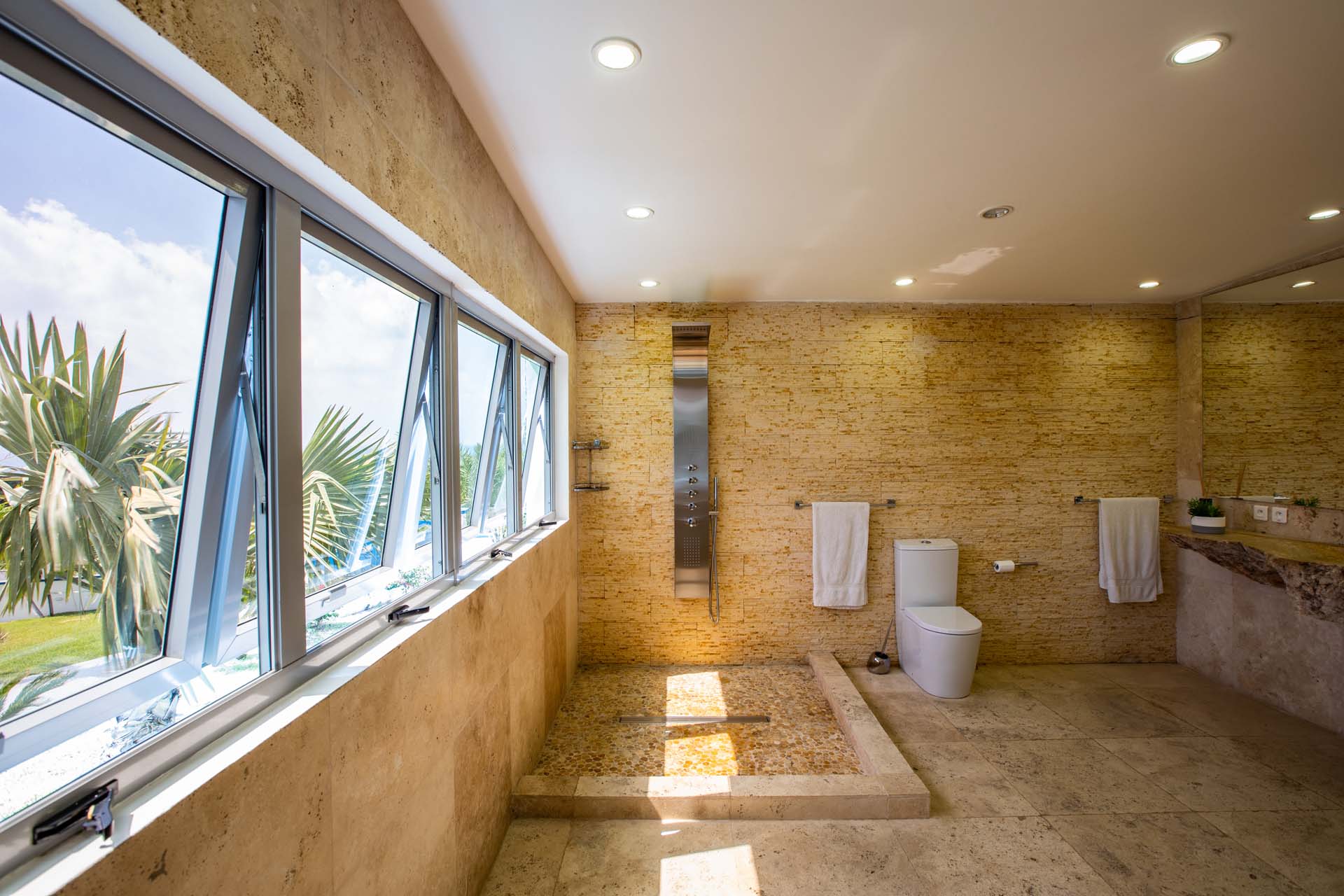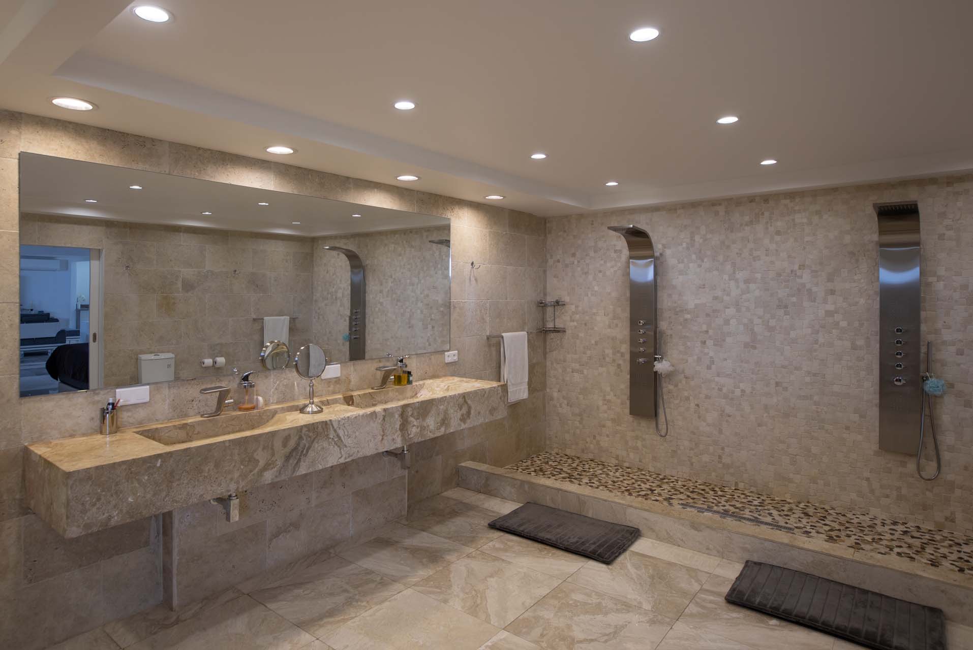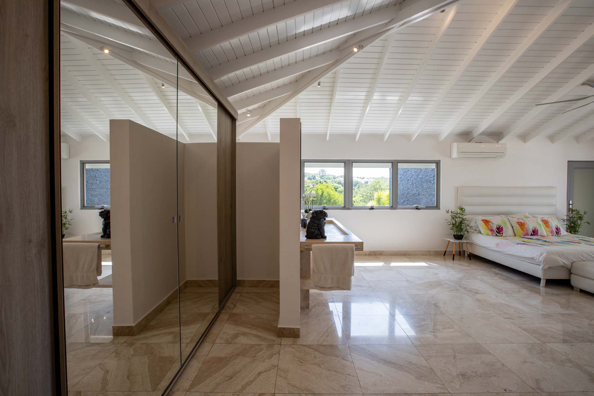 All the bedrooms have ensuite bathrooms. Four of the bedrooms have interior access within the main villa, while the fifth bedroom is located in a separate bungalow that has its own kitchen.