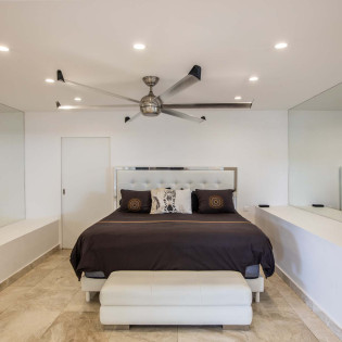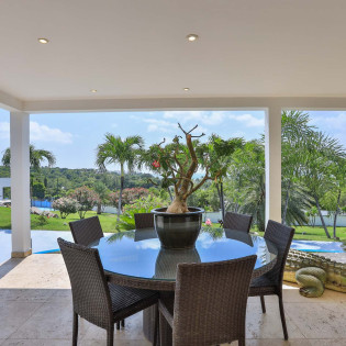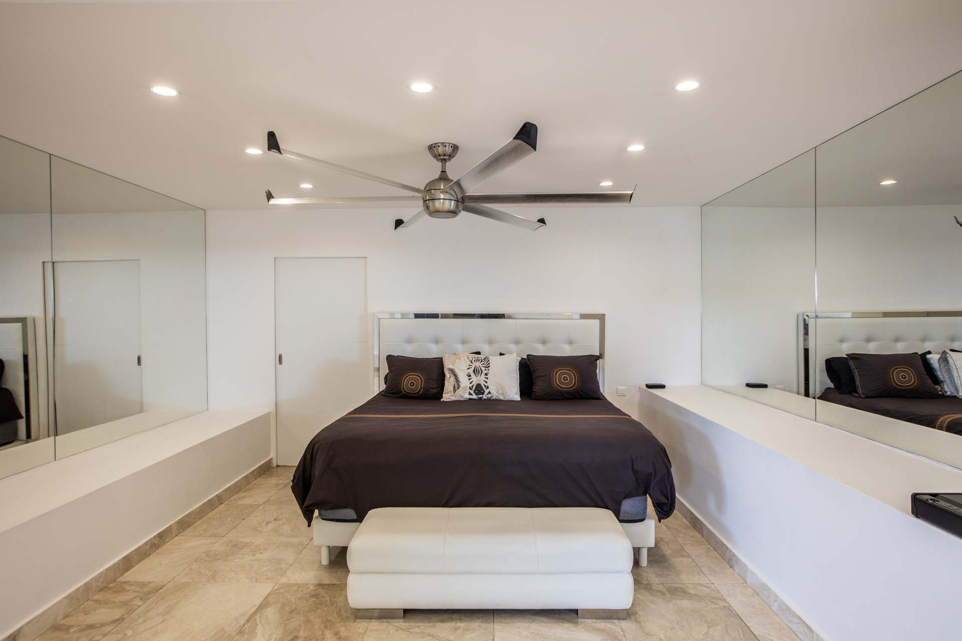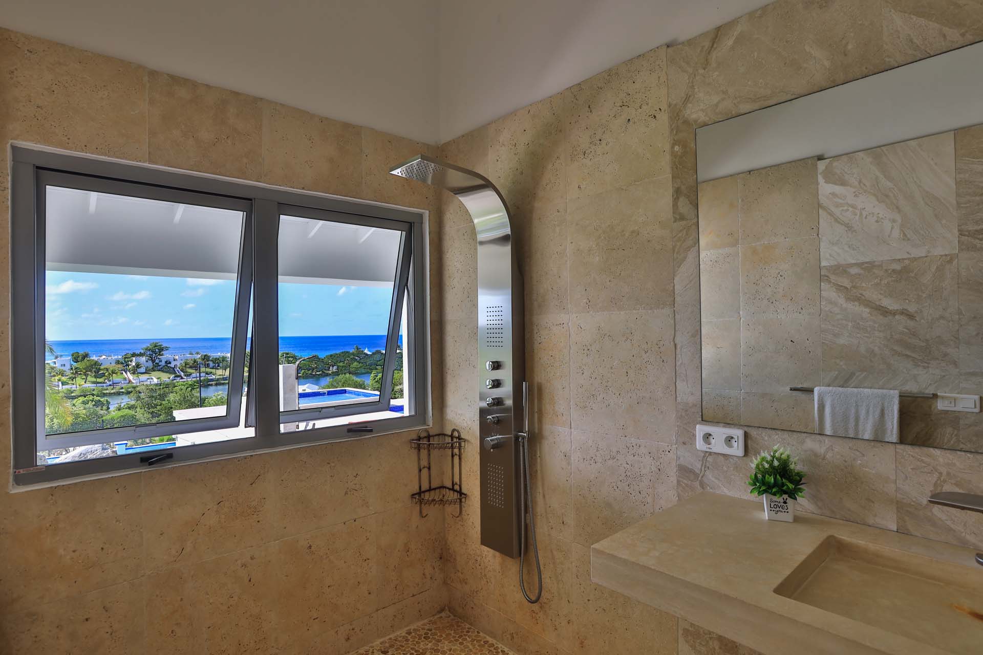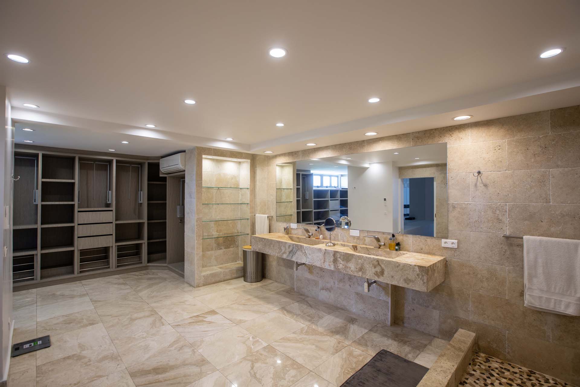 All the bedrooms have ensuite bathrooms. Four of the bedrooms have interior access within the main villa, while the fifth bedroom is located in a separate bungalow that has its own kitchen.
